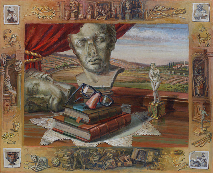 In 1981 I developed a character who inhabits my paintings as the ‘Archetypal Artist’, my alter ego. She is the equivalent to Alfred Jarry’s Pere Ubu and the narrator in paintings focusing on the artist’s predicament. Wearing red and white striped shirt and green Capri pants, she has metamorphosed into Athena, wounded Chiron, played to Pygmalion, and accompanied the Three Fates. I strive for that precarious line between the downright silly and the sublime, perhaps in order to sabotage both extremes, but more often just to see if I can pull it off. The cross-referencing of classical mythology and current events gives my painting a longer shelf life.
