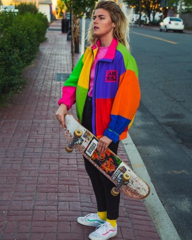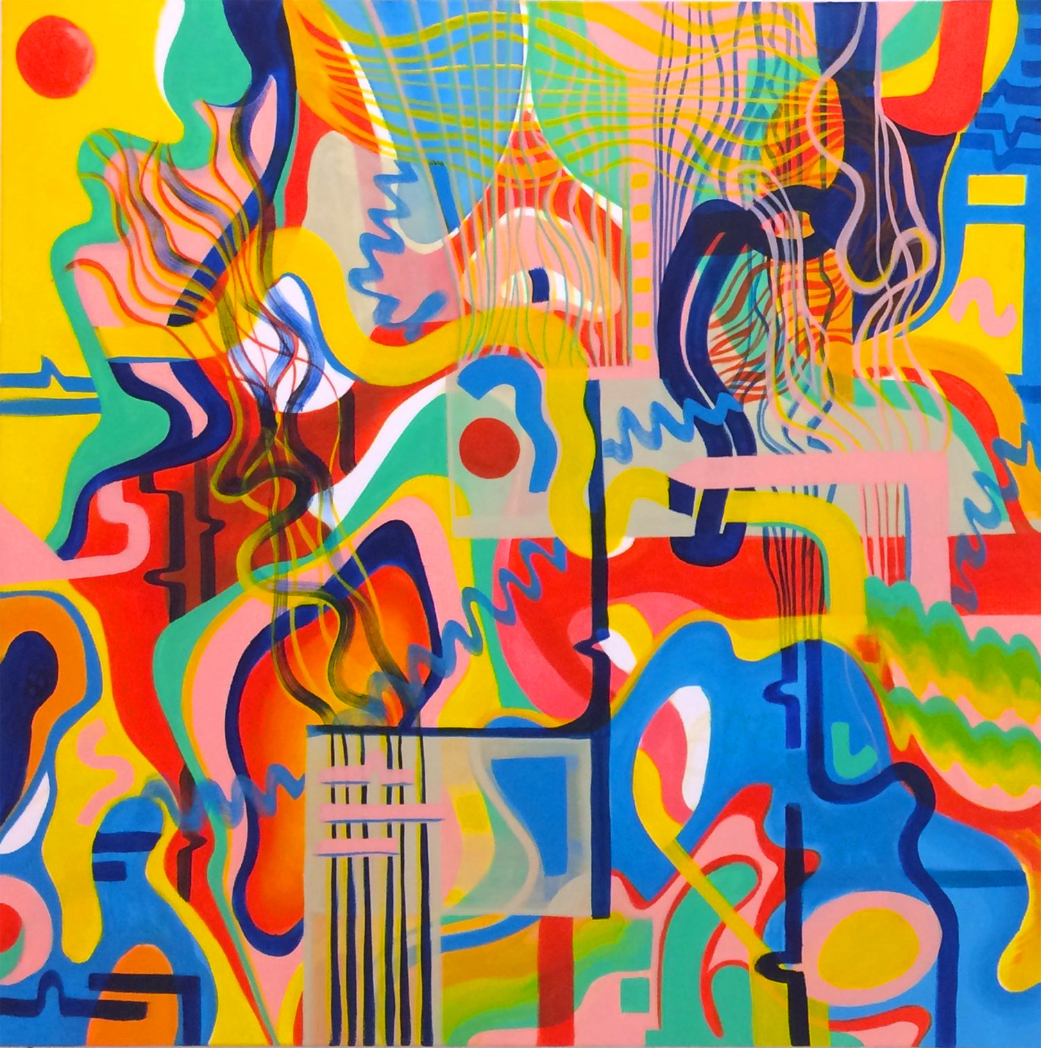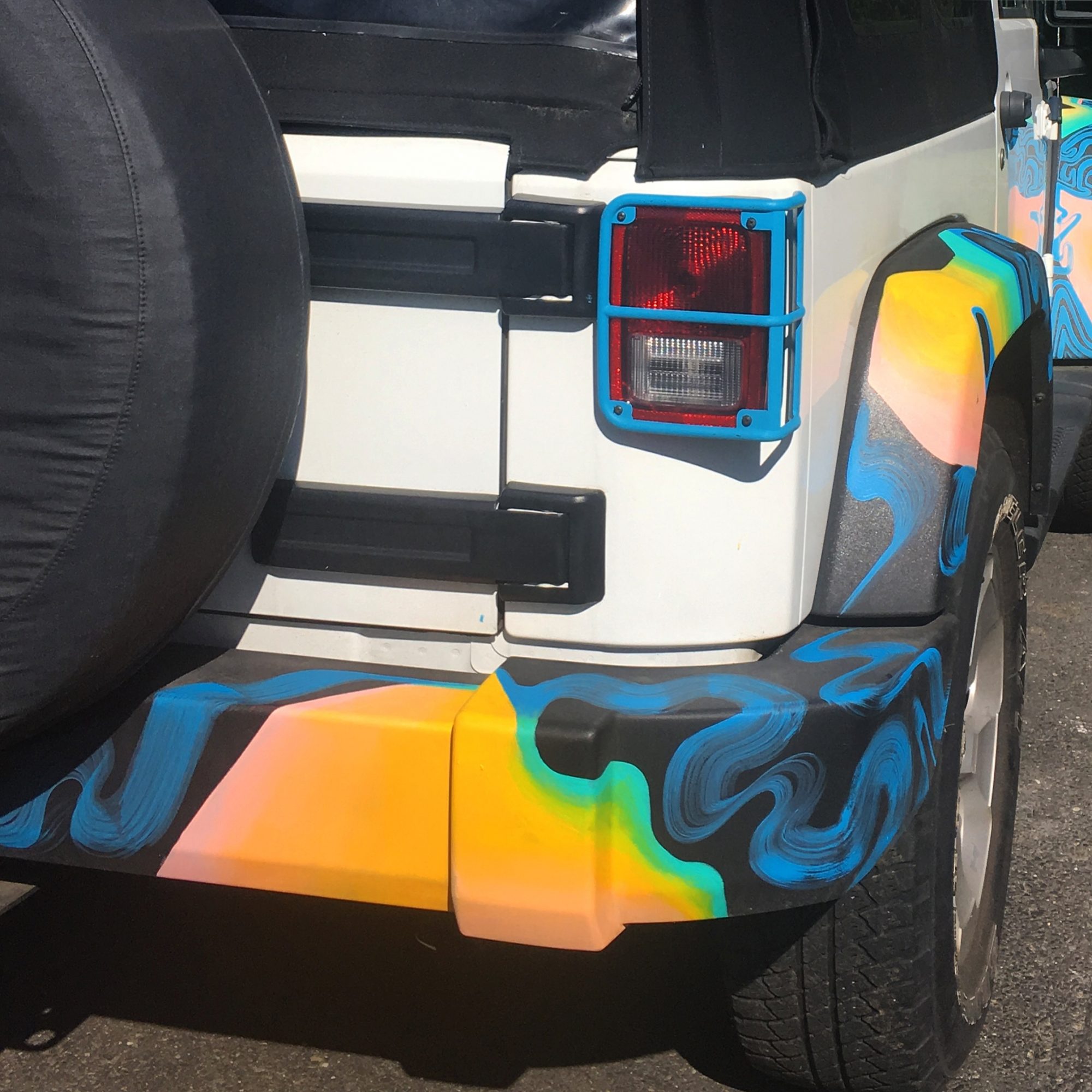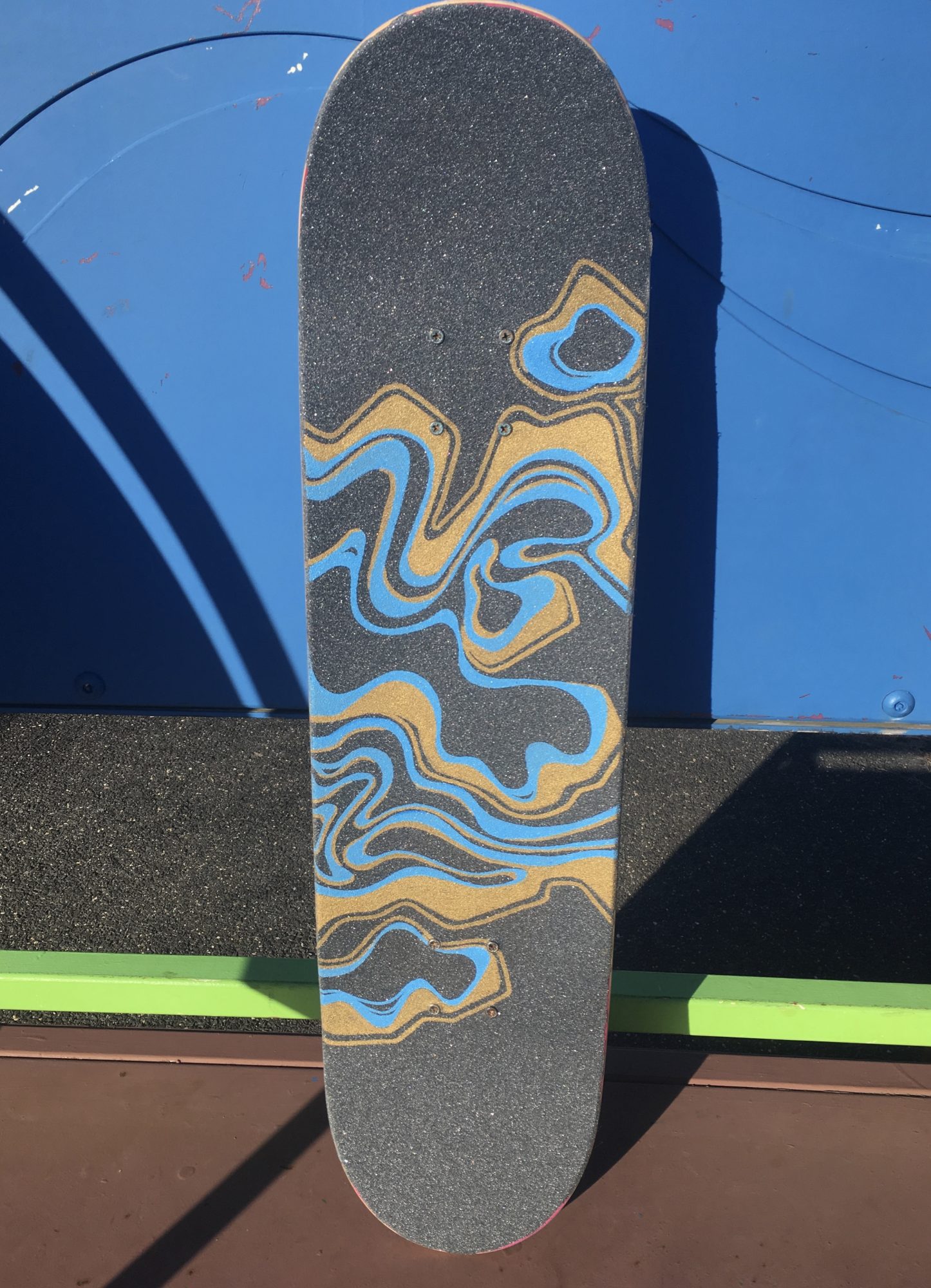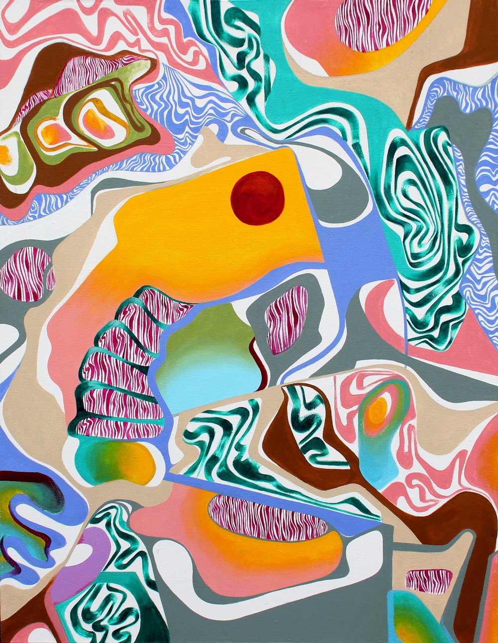 I’ve always been the type of person to go off the beaten path when it comes to how I dress, or how art is “supposed to be.” For as long as I can remember I have gone k-12 with unmatching colored socks paired with the most hectic of power-clashing fabrics. There are going to be those people that (for some reason) are personally violated my my own personal choices, but on the other hand there are people that feel the opposite way. I feel that self-expression requires restraining from holding anything back and bending the rules when necessary. It is fueled by most importantly, doing whatever makes YOU happy. Although I may be relatively laid back in conversation, I love being obnoxious in every visual way humanly possible for my own personal fulfillment. I just wish that with this forwardness that I try to keep pushing out into the world, others also see that it is so possible to be unapologetically who you are. I began painting this way not too long ago, during my time at the Massart. I began to finally explore myself and what I truly felt was beautiful. I have slight synesthesia when I hear higher tones of music, which results in pale pink and yellow hues to sometimes leak into my vision. My paintings are very much based off of this quality, which is the reasoning behind gradients being in almost every single one. There has been this ongoing infatuation with line work that comes from nature and light. I began making sketches based off of how light reflected off of a tiny piece of plastic from a lone butter packet for a bagel I was eating in the middle of the financial district- (if that’s not the bottom of that barrel, I don’t know what is!) But in this case, that was exactly where I needed to be for the true inspiration to flourish. I also take inspiration from shapes of wood-grain, mushroom gills, all of that weird stuff. Once I’m satisfied with my composition, the color kind of spills into it pretty organically. As for the surface I paint on…. there are no limits. I enjoy spreading color around as much as I can in this bleak world. Aside from canvas, I’ve painted my car, shoes, clothing, surfboards, musical instruments, and I also paint griptape for any skaters out there who would be interested in pulling up to the spot with some flavor.