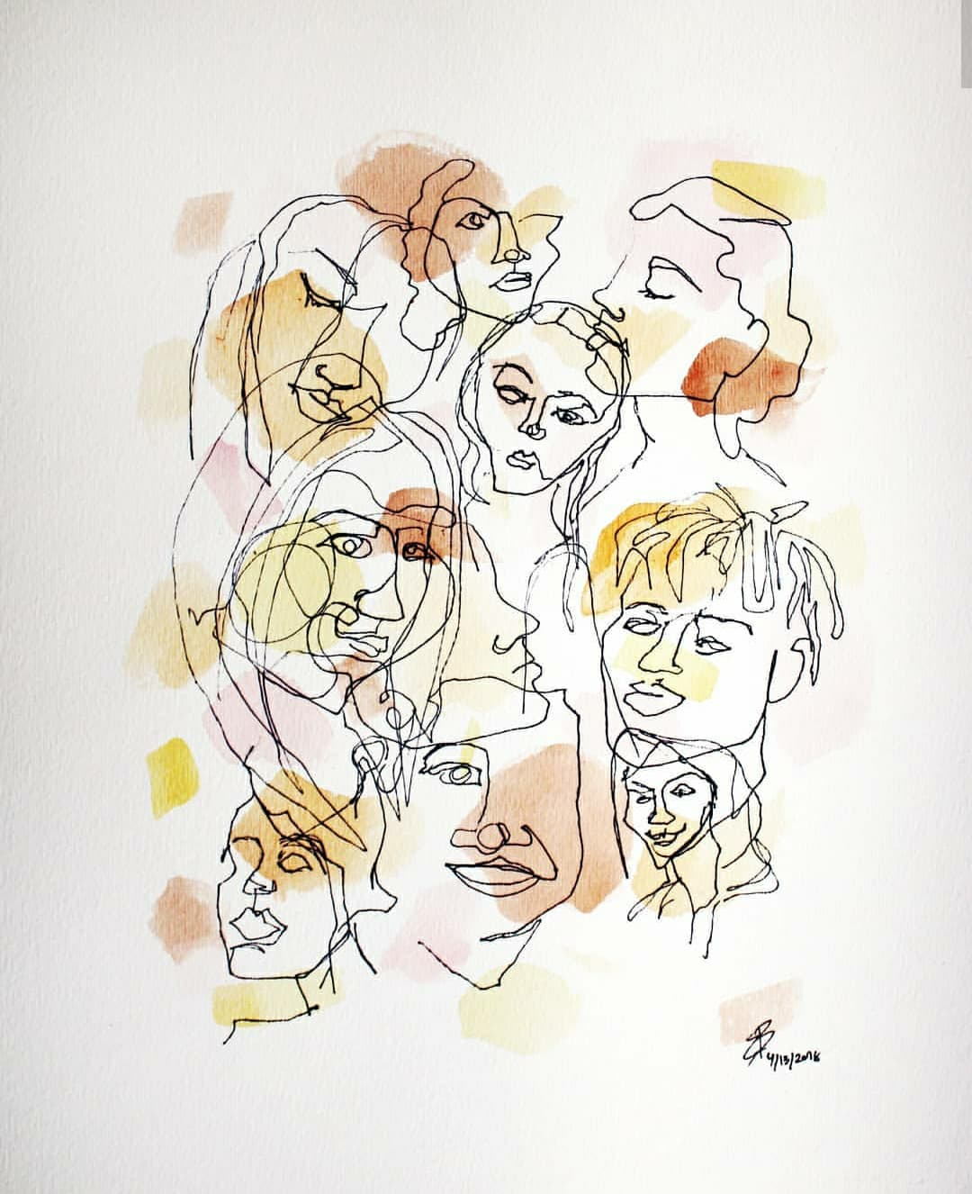 So that was a tangent. But it’s something I think about a lot, and doing the contour drawings helps me incorporate that idea into my daily life. I think the style really aides in some of my more feminist paintings–where I try and include as many different kinds of people as possible. Everyone is beautiful. And it goes back to the boxes. I’m just trying to see people for all the aspects that create them, not just who I think that they are.