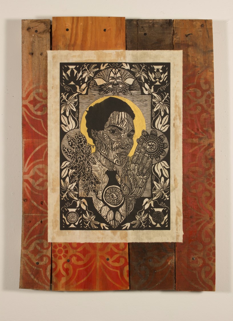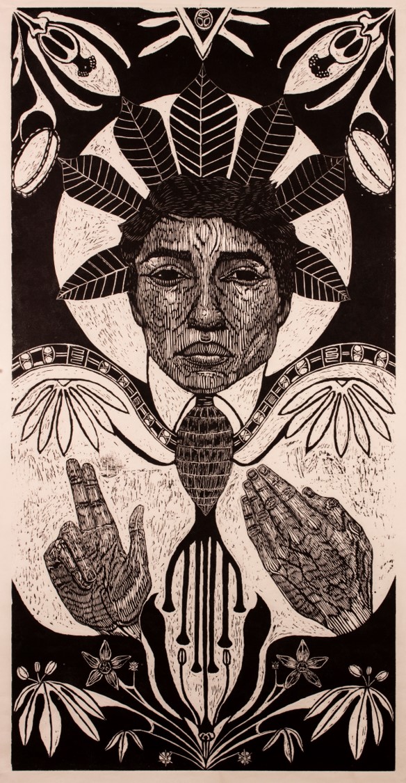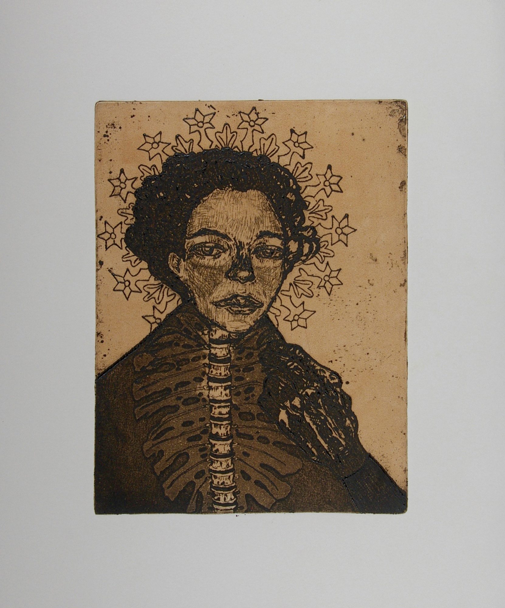 I work primarily in printmaking. I usually start with a very traditional substrate such as a relief print or an etching and use those prints in more elaborate mixed media pieces. A main focus of my work is the magic of my people and the Island. I am Puerto Rican and extremely proud of my roots, as a diaspora Puerto Rican and in light of the humanitarian crisis existing previously to, but further aggravated by Hurricane Maria it is near impossible to separate my identity from my work. My artwork explores gender and representation through religious ornamentation, but most importantly I want to portray the resiliency, dignity, and self-sufficiency of Puerto Ricans. I synthesize deities that merge androgynous figures with the vegetation of the island paying homage to the syncretism, the melding of different cultures, that is omnipresent in the Caribbean experience.