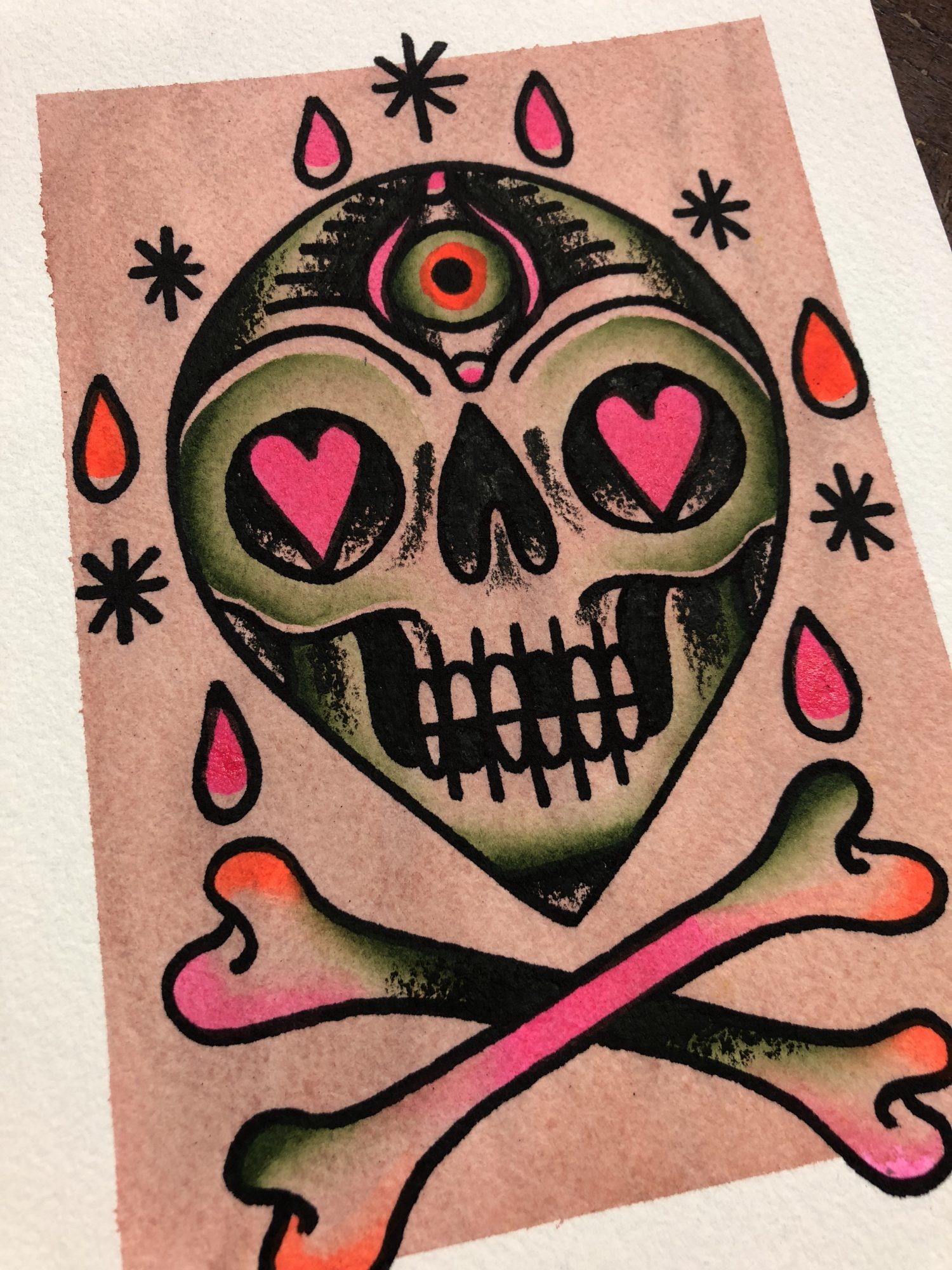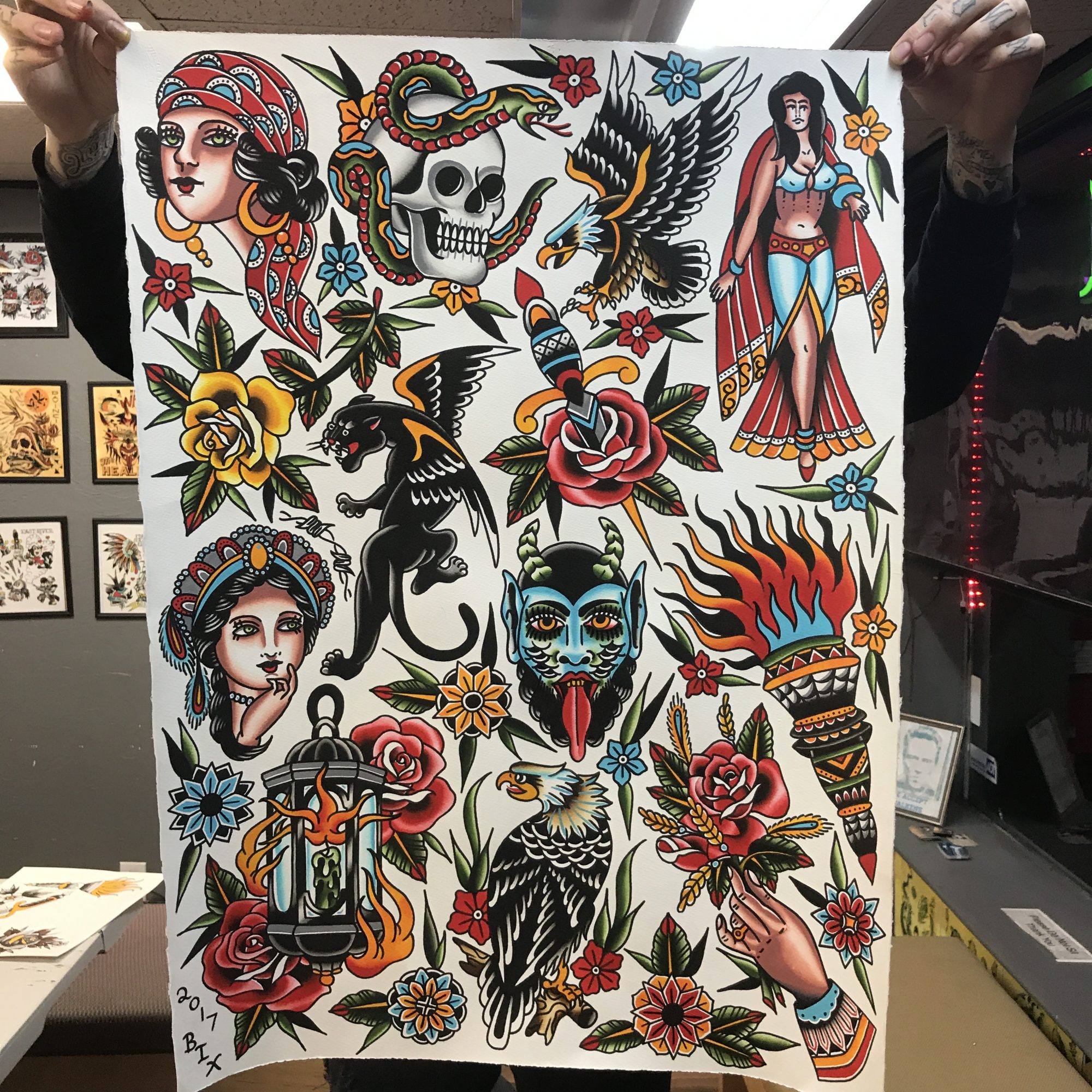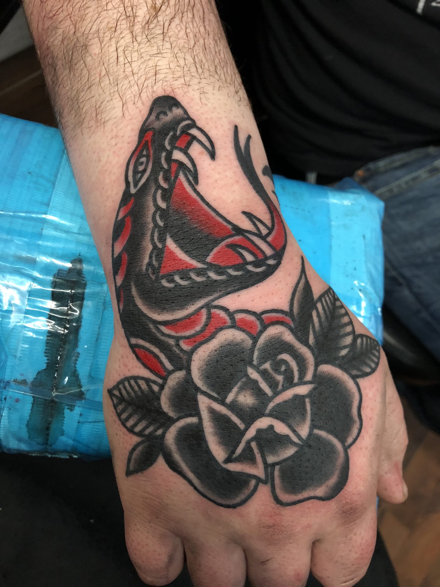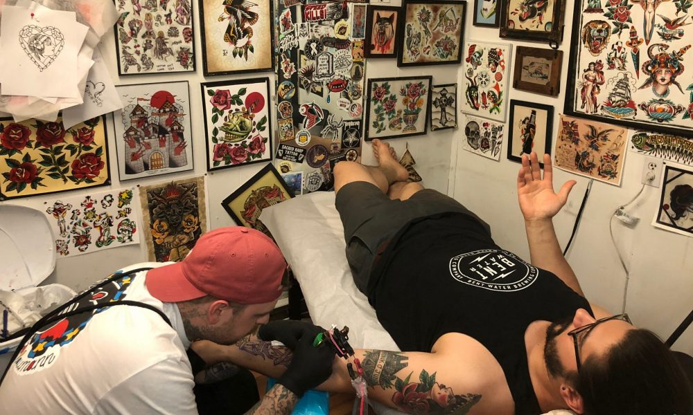 In addition to tattooing full time, I also enjoy painting tattoo flash and woodburning those designs. I feel like painting is crucial to helping cultivate your skills that cross over into tattooing. For me they go hand in hand. When you’re tattooing and working with a client, you are rendering them a service. You have much less say in the subject matter and design. As opposed to painting, where you get to really take some risks and try out new things that you can translate back into your tattooing. If there is a design I’m not sure of or want to try something different, you can paint it multiple times until you reach your desired result. I began painting about a year after tattooing and I could see the change in how I approached tattooing. When designing tattoos/paintings I tend to lean towards American Traditional designs. They are clean, bold and very stripped down versions of designs. For me they are what I think of when I think of tattoos. Classic designs, bold application and built to last.
