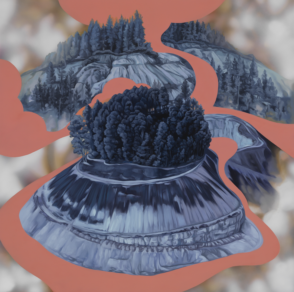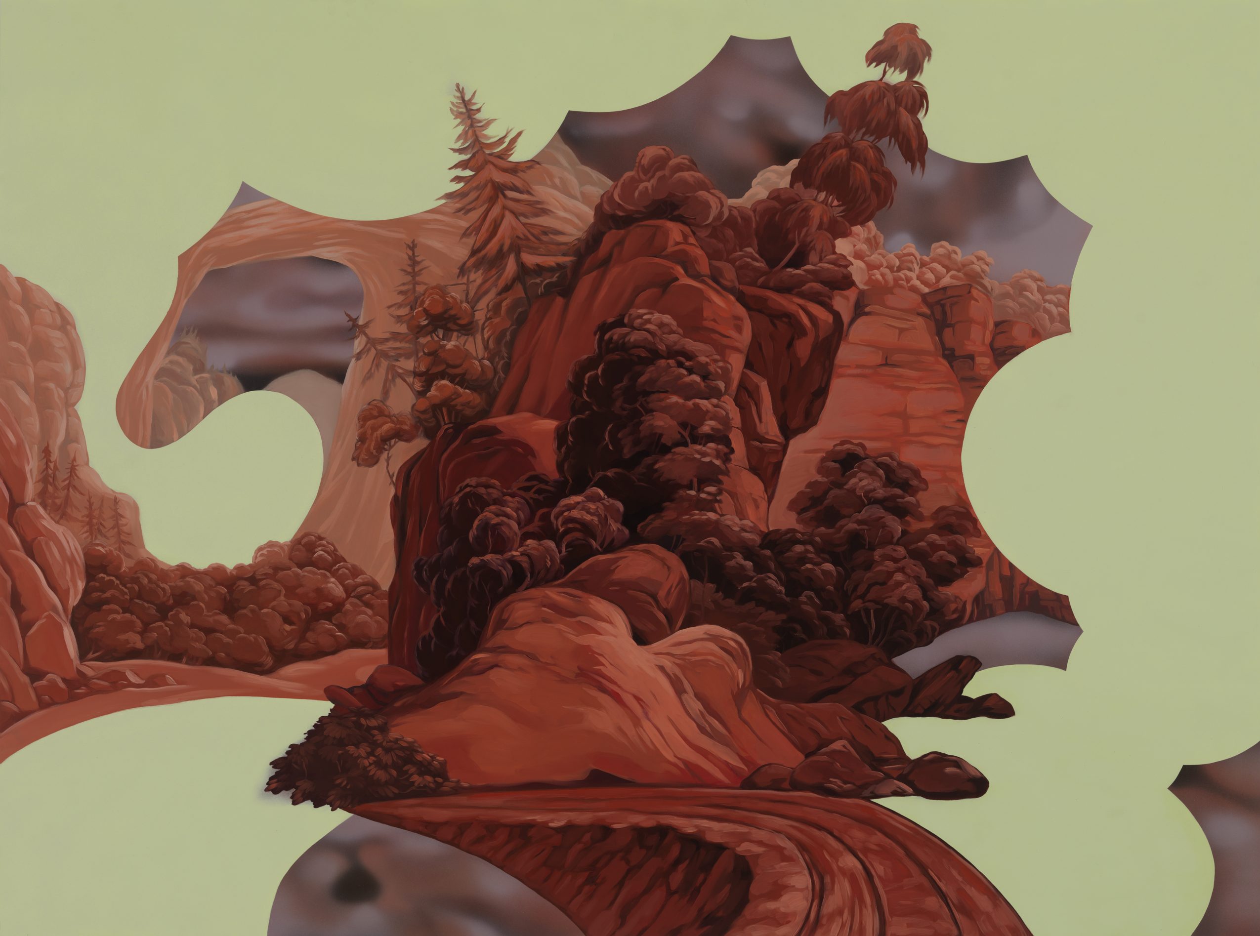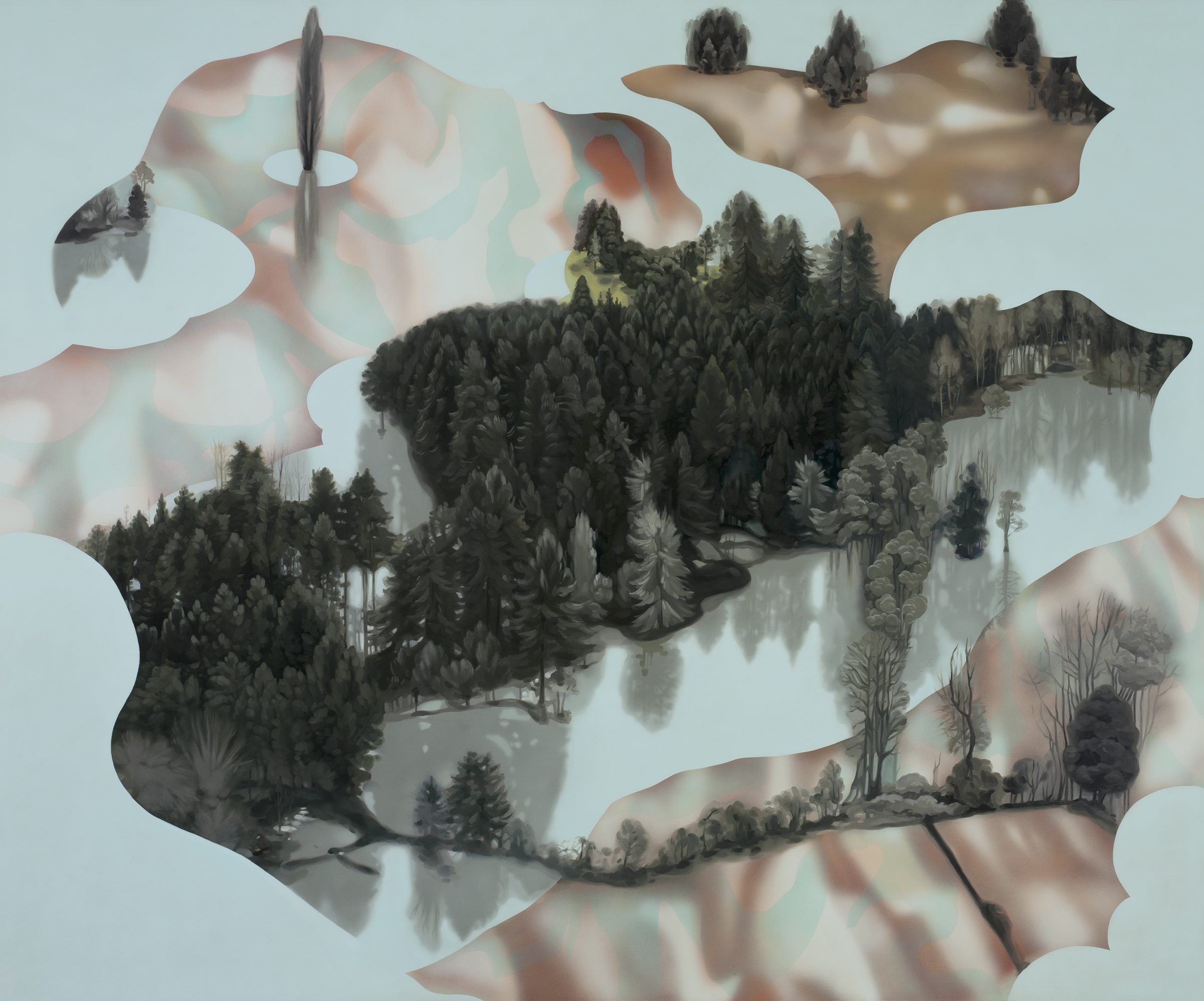 The landscape is a consistent motif throughout my work, but rather than being a faithful representation of the natural world we inhabit, it becomes a manifestation of desire and memory imposed upon by the artifice of technology. While earlier iterations of my work evoked more exaggerated artifice and flamboyant abstraction, the recent paintings place the realism of the landscapes more prominently, offering a contemplative space that invites the viewer to explore within. While there is a lush beauty here, there is also a conspicuous human absence in these uninhabited, detached fragments that float in ambiguous, abstract spaces. Much in the way that memories exist in fragments with gaping voids of lost information, these landscapes hover in a state of dreamy and melancholy suspension, as if these apparitions are all that is left of a world that no longer exists. This sense of uncertainty and detachment, or “solastalgia,” is a persistent symptom of our contemporary condition of facing an unknown future. Drastic changes such as urban expansion, forest fragmentation, strip-mining and fracking physically disrupt and alter the natural world and threaten its very existence. While the notion of a post-human world may have disturbing implications, I also find poetic beauty in the idea that life and consciousness may exist outside of human experience, and that some echo will persist, with or without our participation.