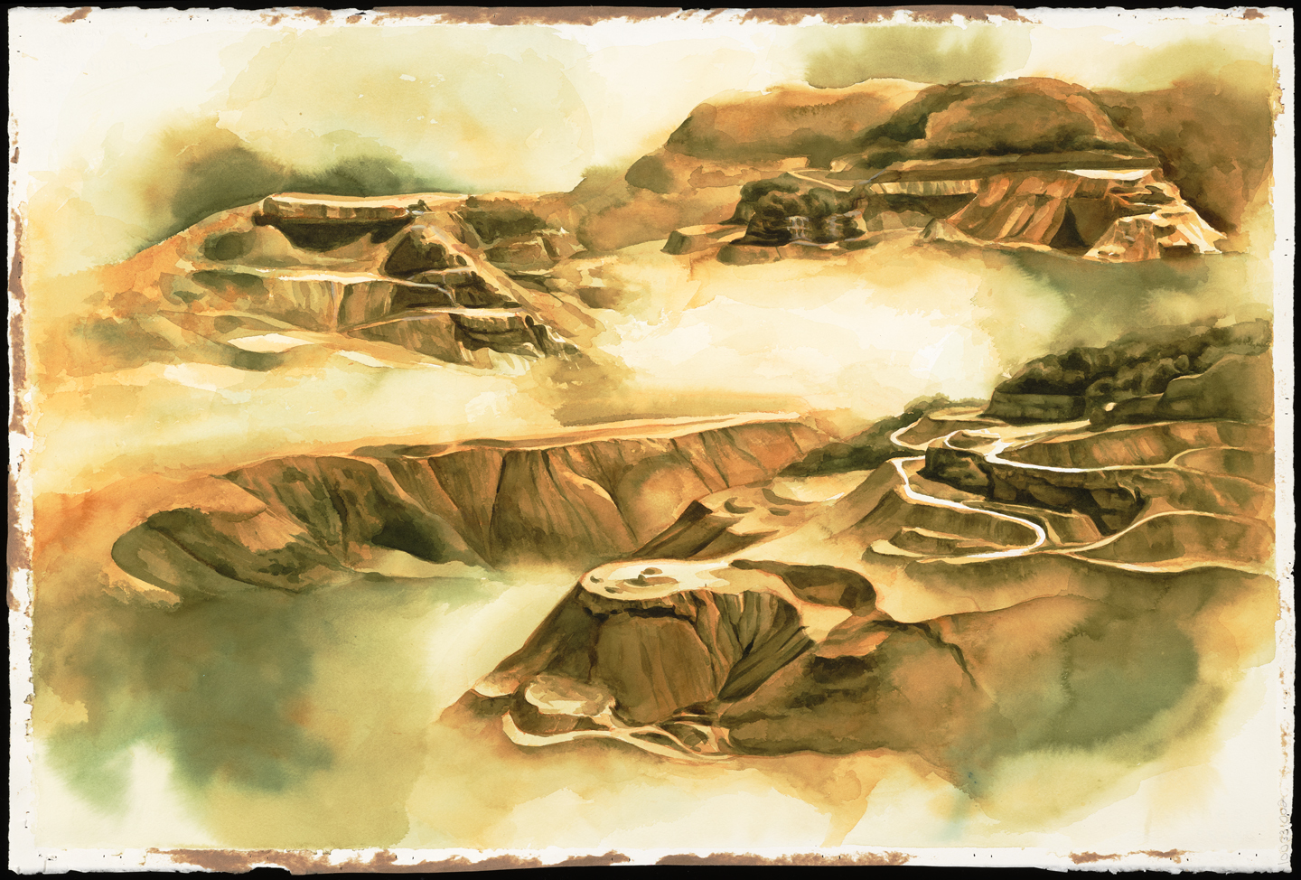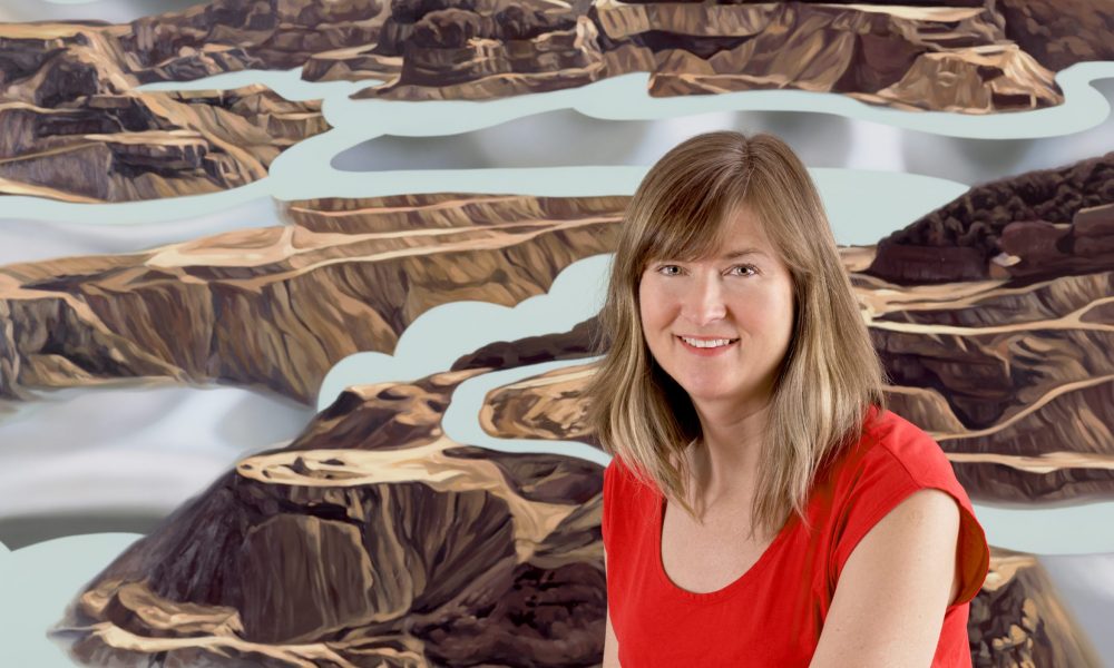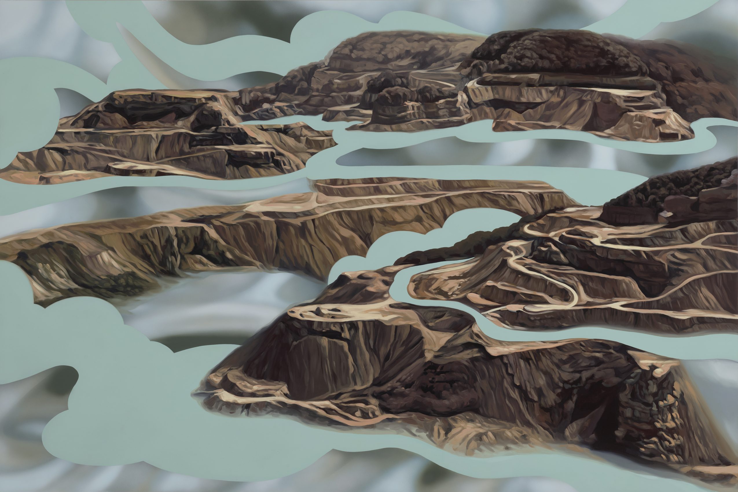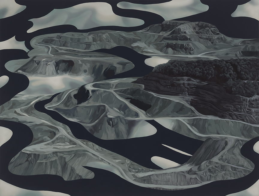 The landscape is a consistent motif throughout my work, but rather than being a faithful representation of the natural world we inhabit, it becomes a manifestation of desire and memory imposed upon by the artifice of technology. While earlier iterations of my work evoked more exaggerated artifice and flamboyant abstraction, the recent paintings place the realism of the landscapes more prominently, offering a contemplative space that invites the viewer to explore within. While there is a lush beauty here, there is also a conspicuous human absence in these uninhabited, detached fragments that float in ambiguous, abstract spaces. Much in the way that memories exist in fragments with gaping voids of lost information, these landscapes hover in a state of dreamy and melancholy suspension, as if these apparitions are all that is left of a world that no longer exists. This sense of uncertainty and detachment, or “solastalgia,” is a persistent symptom of our contemporary condition of facing an unknown future. Drastic changes such as urban expansion, forest fragmentation, strip-mining and fracking physically disrupt and alter the natural world and threaten its very existence. While the notion of a post-human world may have disturbing implications, I also find poetic beauty in the idea that life and consciousness may exist outside of human experience, and that some echo will persist, with or without our participation.