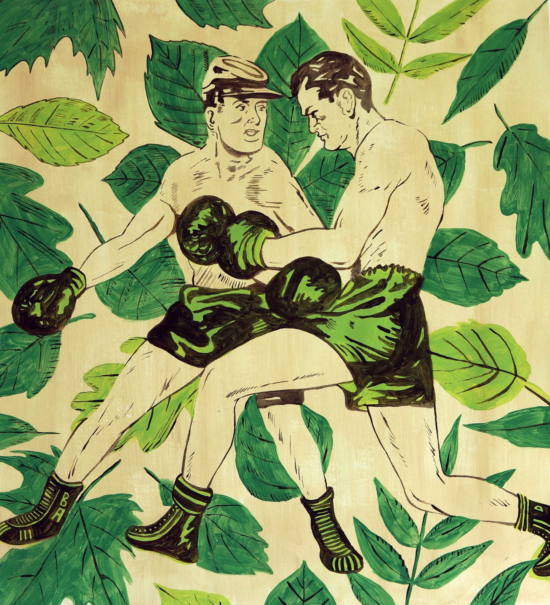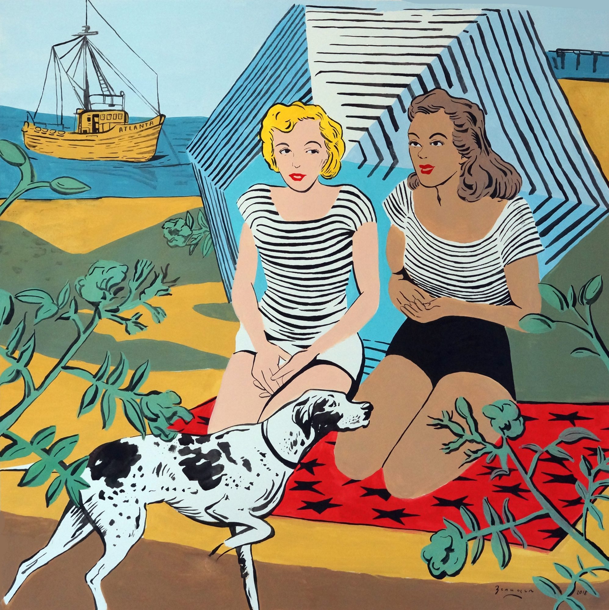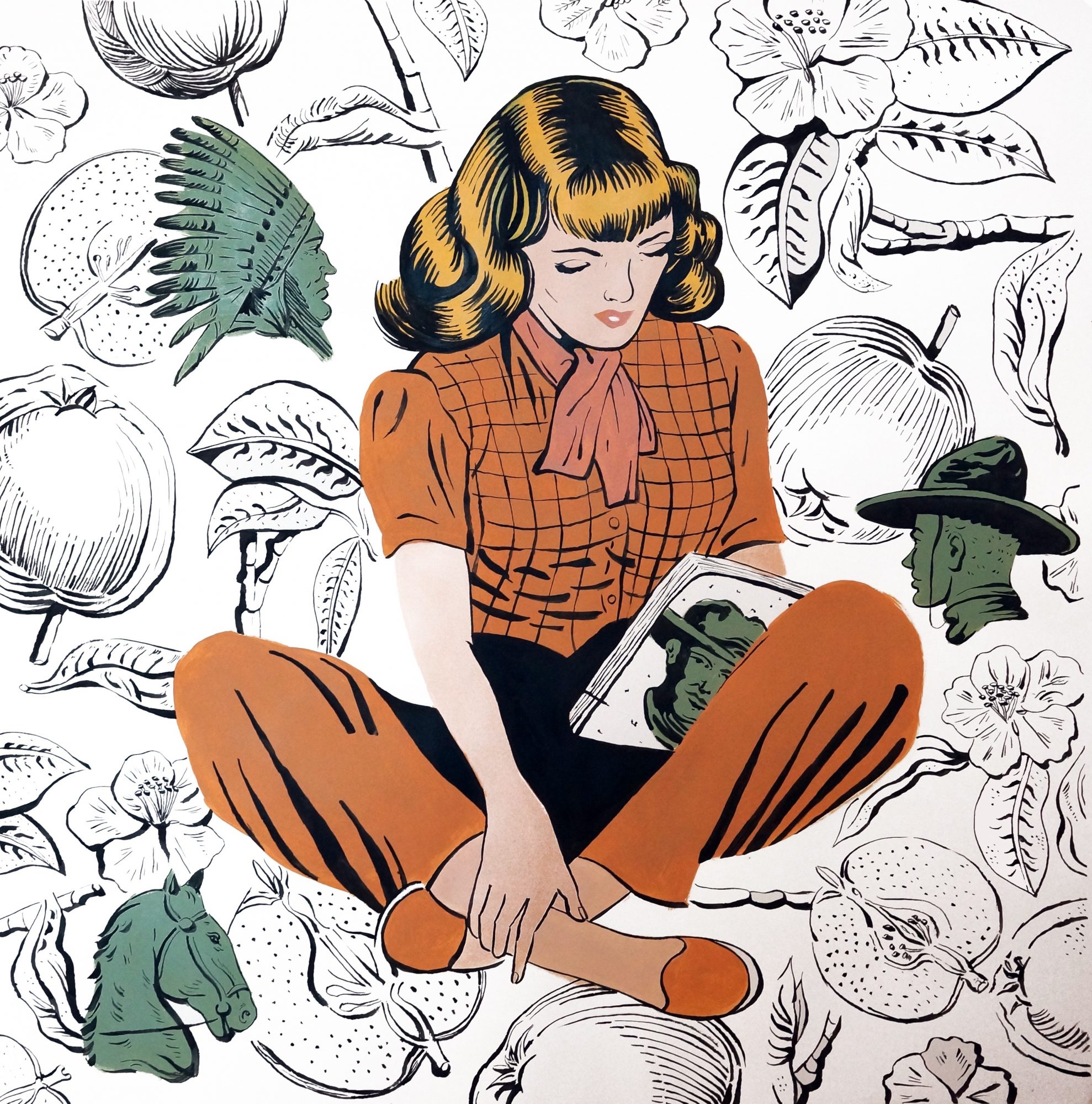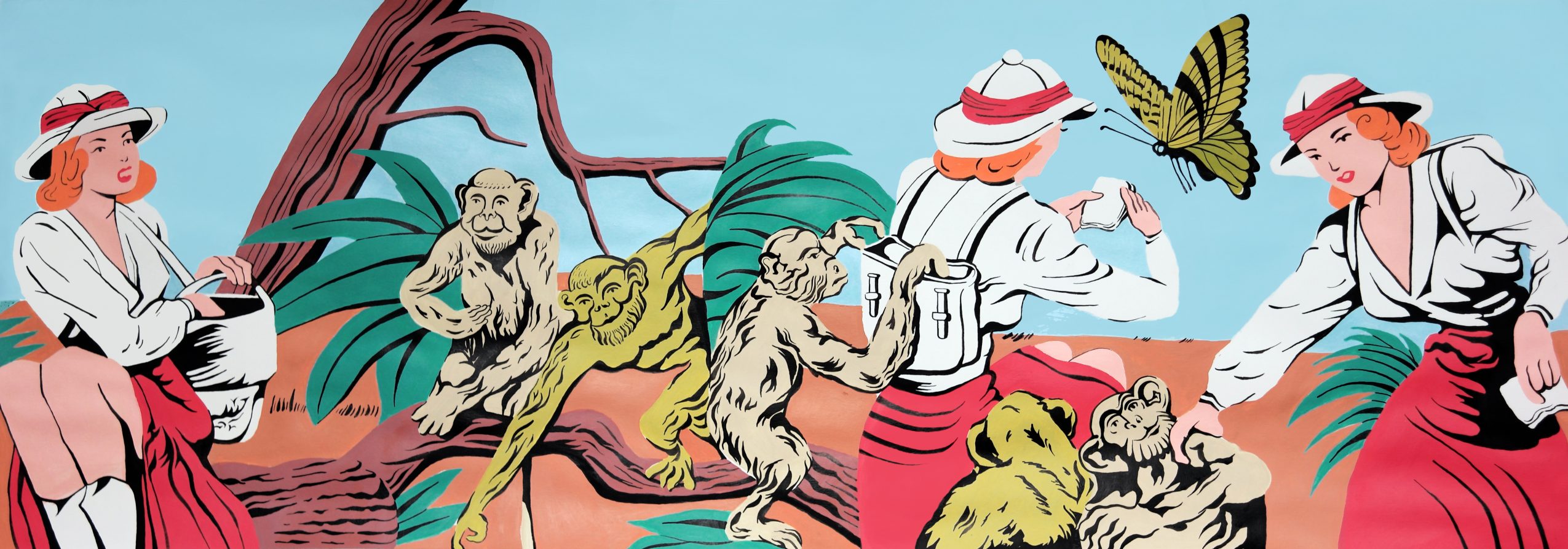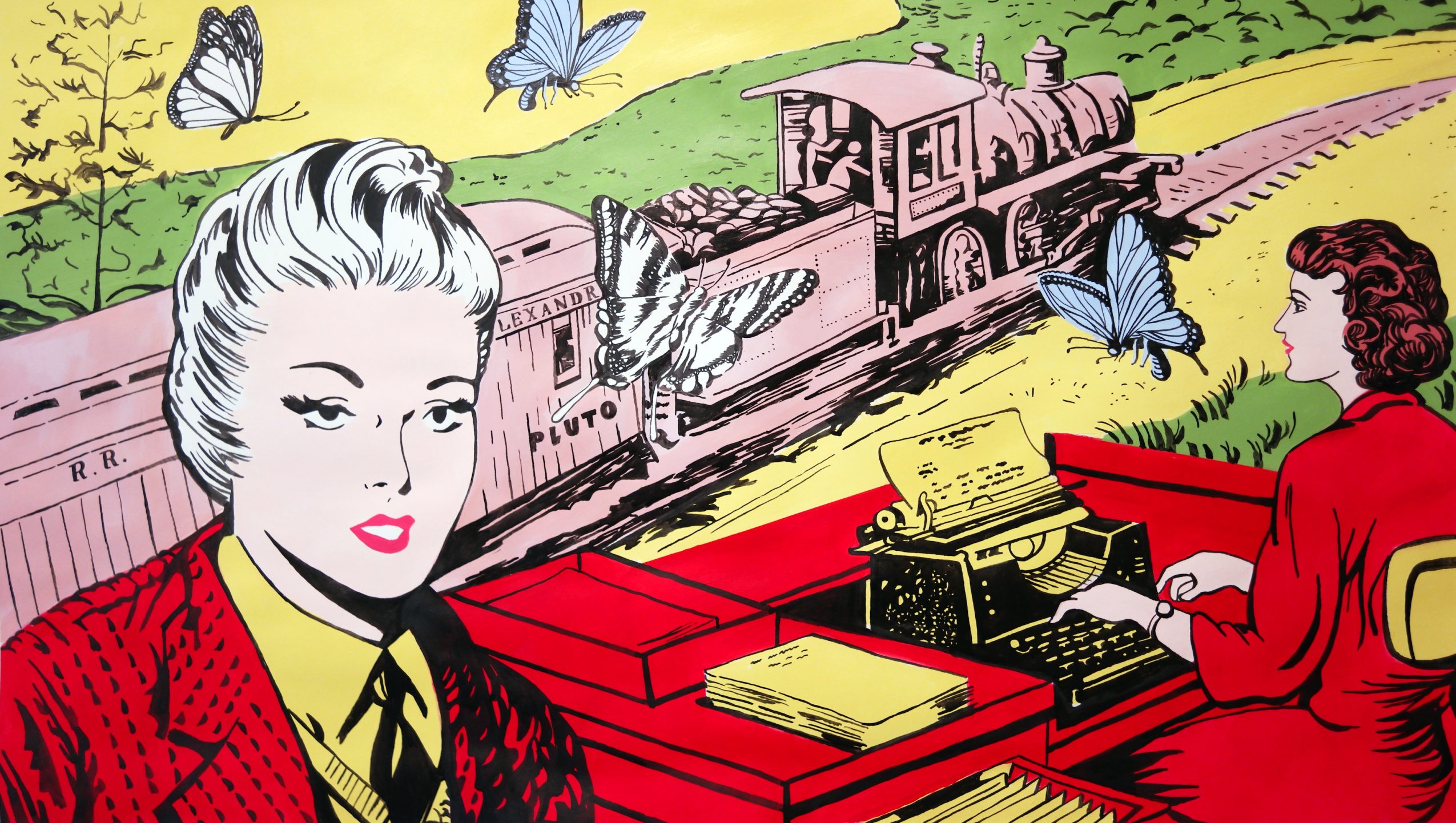 About my subject matter; One of the first ways I ever made money on my own was by selling antiques and objects I found at yard and estate sales. All of this is to say that I have always surrounded myself with objects, art and ephemera from the early and mid-1900s. What I create has become inspired by the aesthetics from this time period. The 1950’s brought about a major movement in advertising which went hand in hand with the creation of pop art. I see the artwork I create as a way of utilizing the stylings of pop art and mid-century design to express my own narrative. If I am not simply creating a pretty picture I am often flipping a theme from the past on its head which is usually presented paradoxically. Politically and ethically there is so much wrong with the entirety of the 20th century; sexism, racism, homophobia and war. With that being said, I do not create my art out of reverence for this period past, rather I create to reimagine this time period in a way I believe to be morally sound. In this way, there is a duplicity in each painting I make, on one hand it is referential to the damages of this time, on the other, I try to create something that is visually beautiful lending itself to the visual aesthetics of the past.