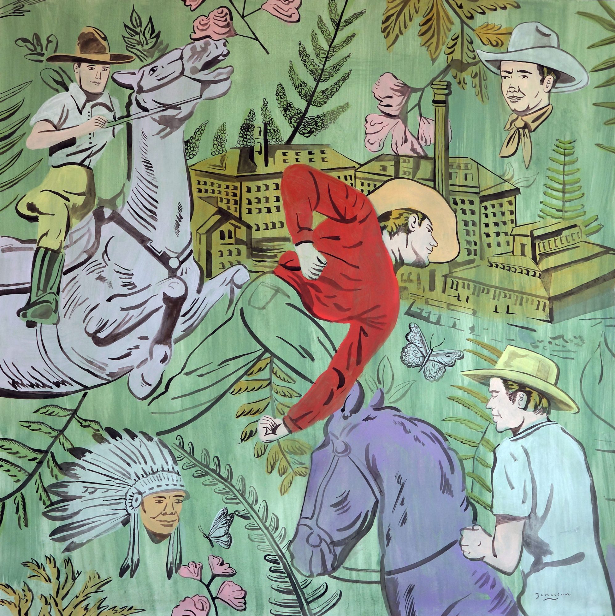 I create art in a traditional manner, I usually work with gouache which is an opaque form of watercolor and I paint typically on paper. I buy huge rolls of 50-foot-long printmakers paper that I cut up in my studio to fit the composition I am making. My process usually begins with writing. I have kept journals since the age of 8. From there I do a lot of drawing on the computer. I like using the computer because I tend to want to move figures around the composition a lot. This gets me to the actual painting quicker. I can spend 2 to 4 days on a painting but I have had some work take weeks. The longer the work takes the more likely I am to hate it. After finishing a painting, I never come back to its which I think says a lot about how committed I am to the sketch making process.