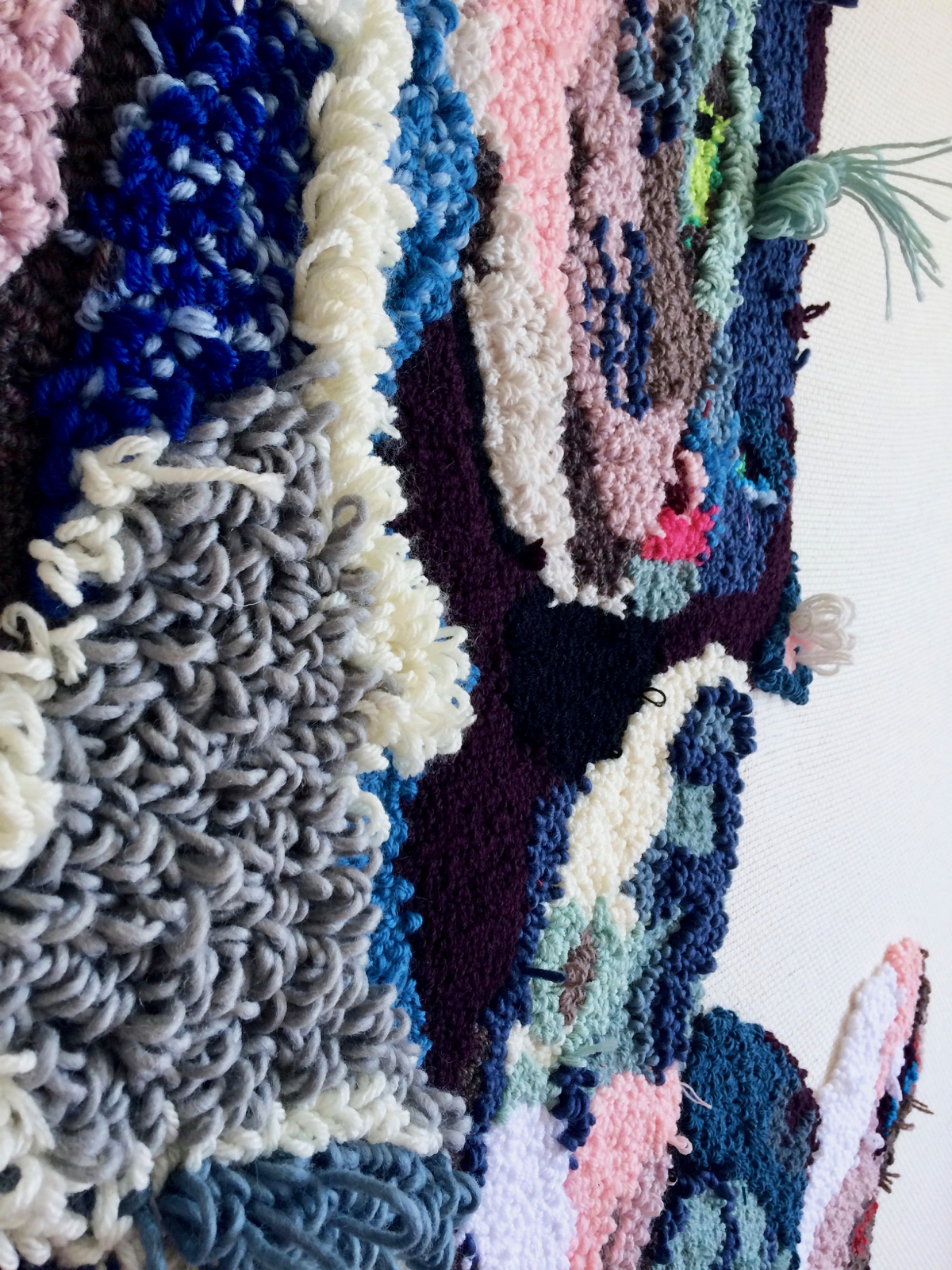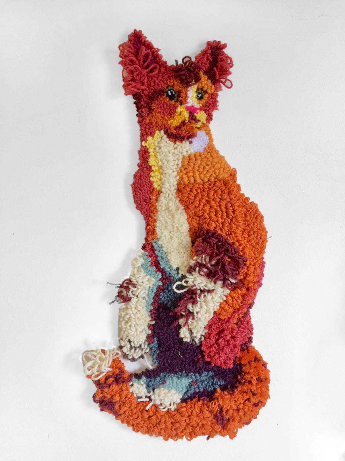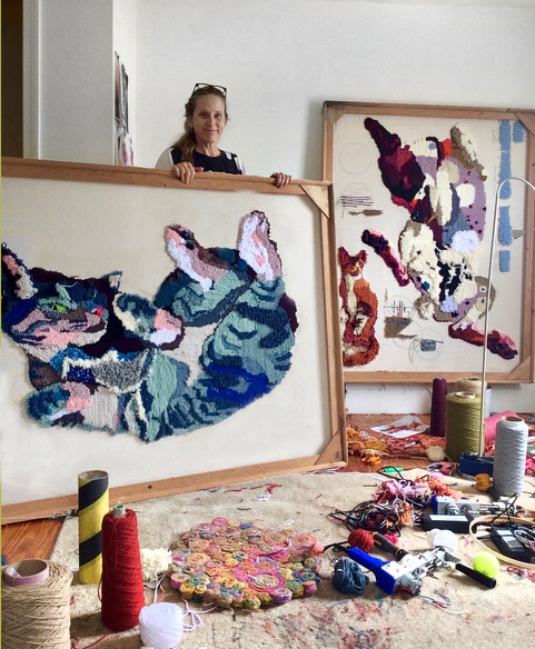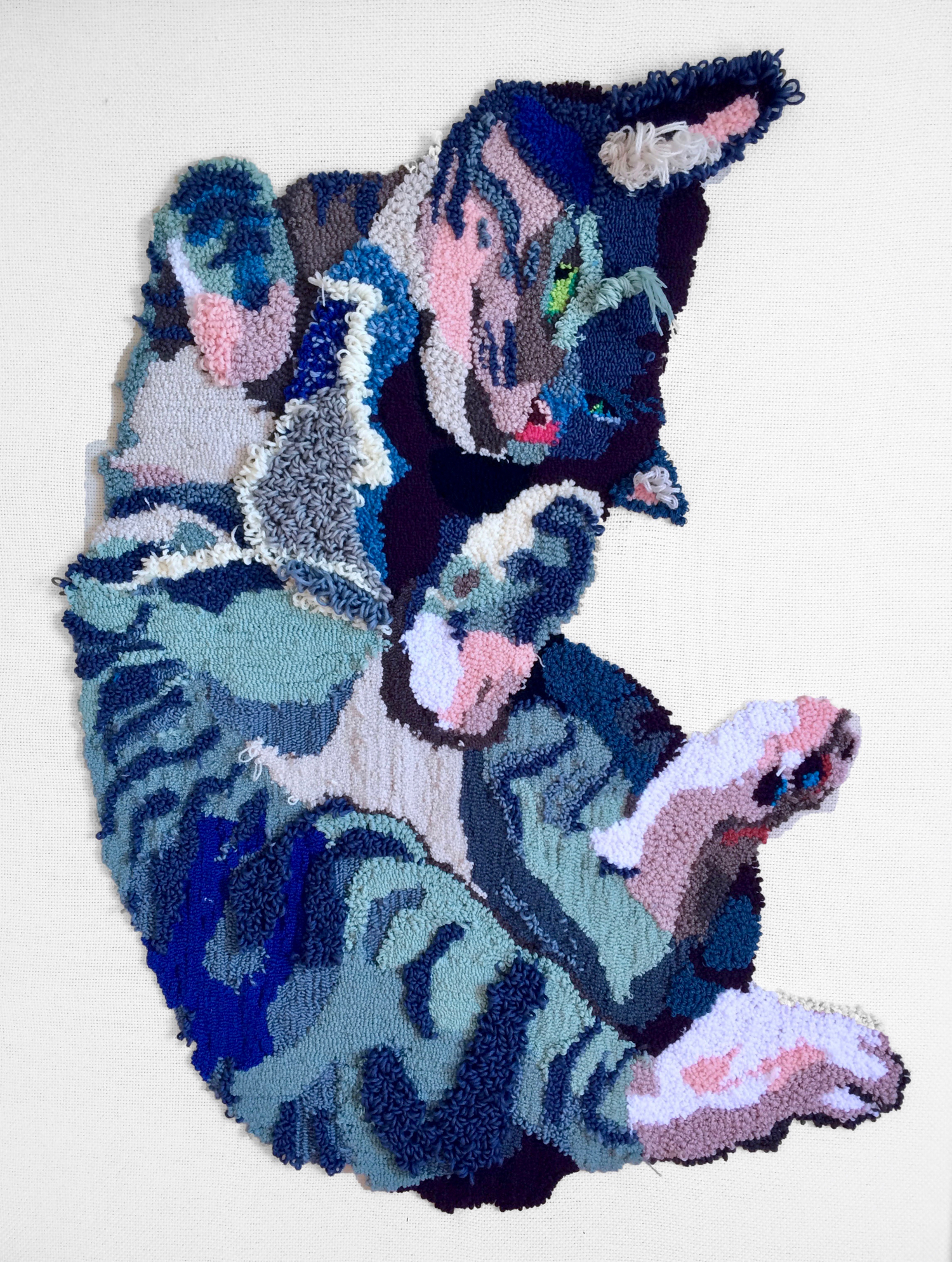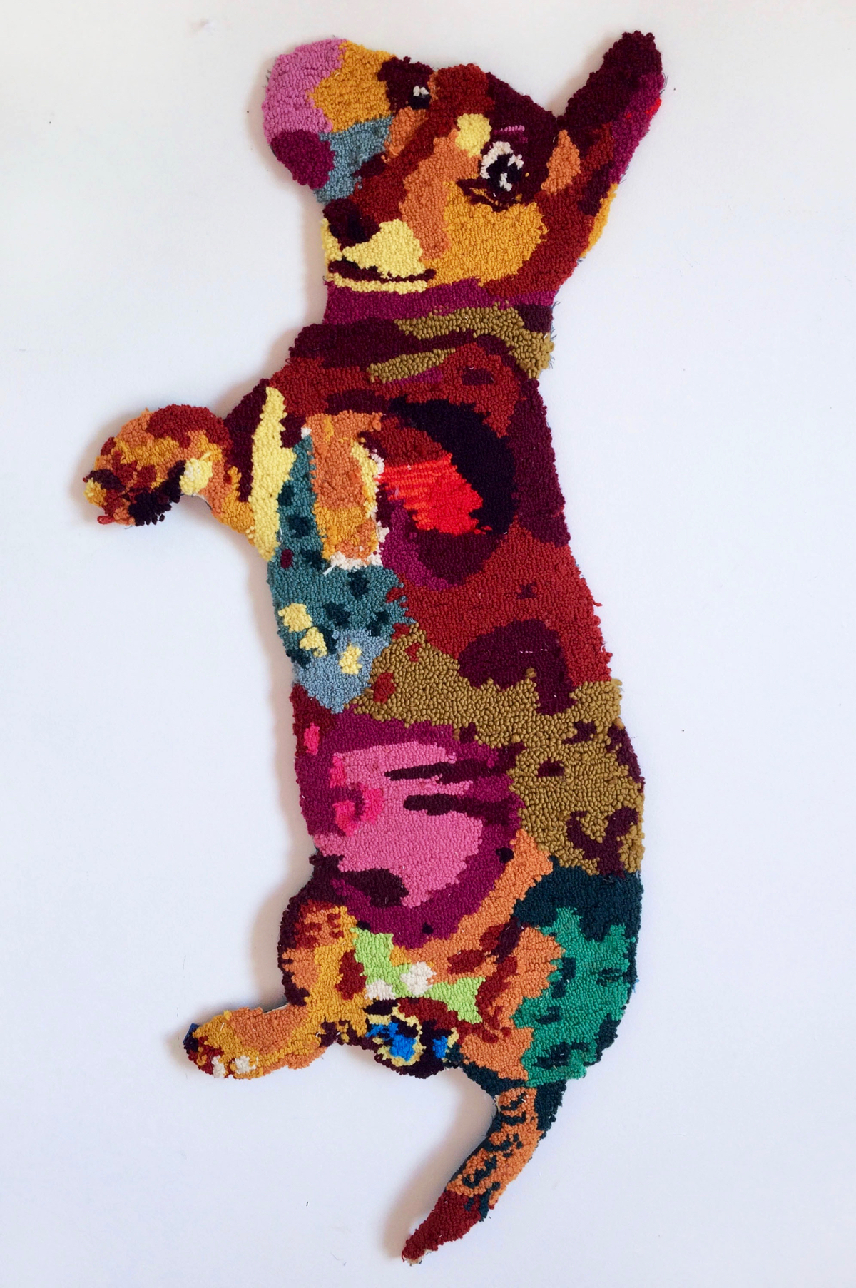 For the “Belly of the Beast” project, I create tufted paintings to produce low relief full body portraits of rescue animals sleeping on their backs. Tufting or looping yarn through a backing cloth is commonly used in carpet making. I use a combination of thousands of loop pile stitches at various heights and cut pile loops to create velvety lush or fuzzy textures ideal to describe fur and complex texture such as a brindle coat or tabby stripes. Through exaggerated color, rich texture and the animal pose itself, skin rug transforms into an interspecies interconnected meditation.