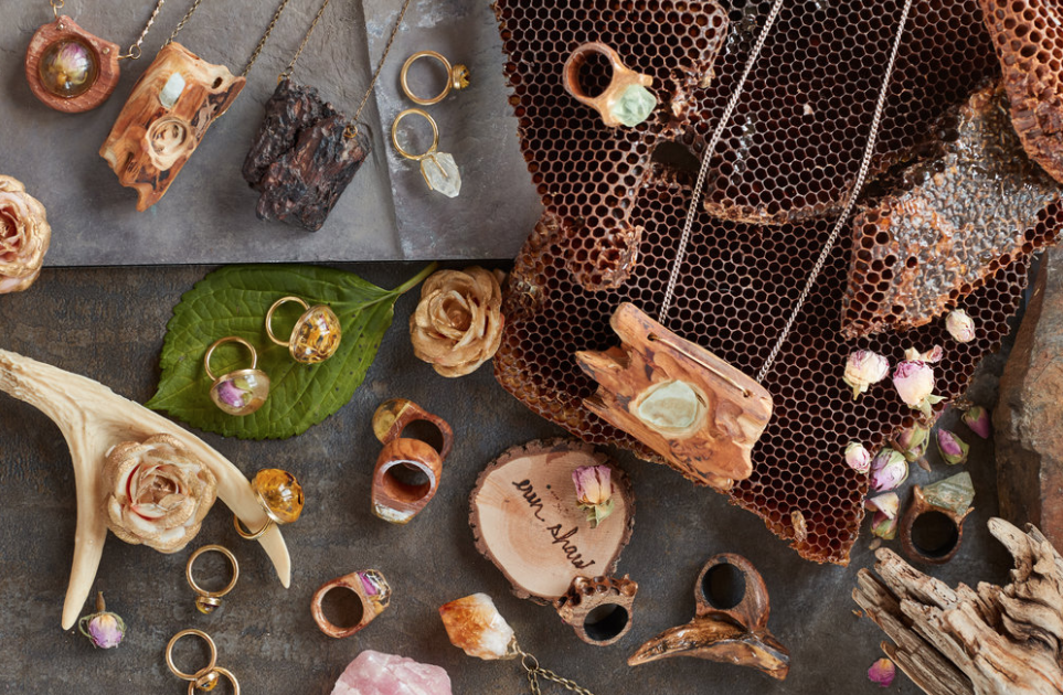 “I favor found materials that I find in nature, often along the seashore & on walks with my pup. I have an affinity to fallen bark, antler like limbs from trees, stray stones and weathered wood. Each piece tends to take on a more sacred form when it’s transformed into an object. Material has always contributed to the function, cultural value, and that special glimmer of personal history into each of my designs.”