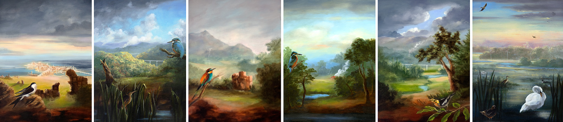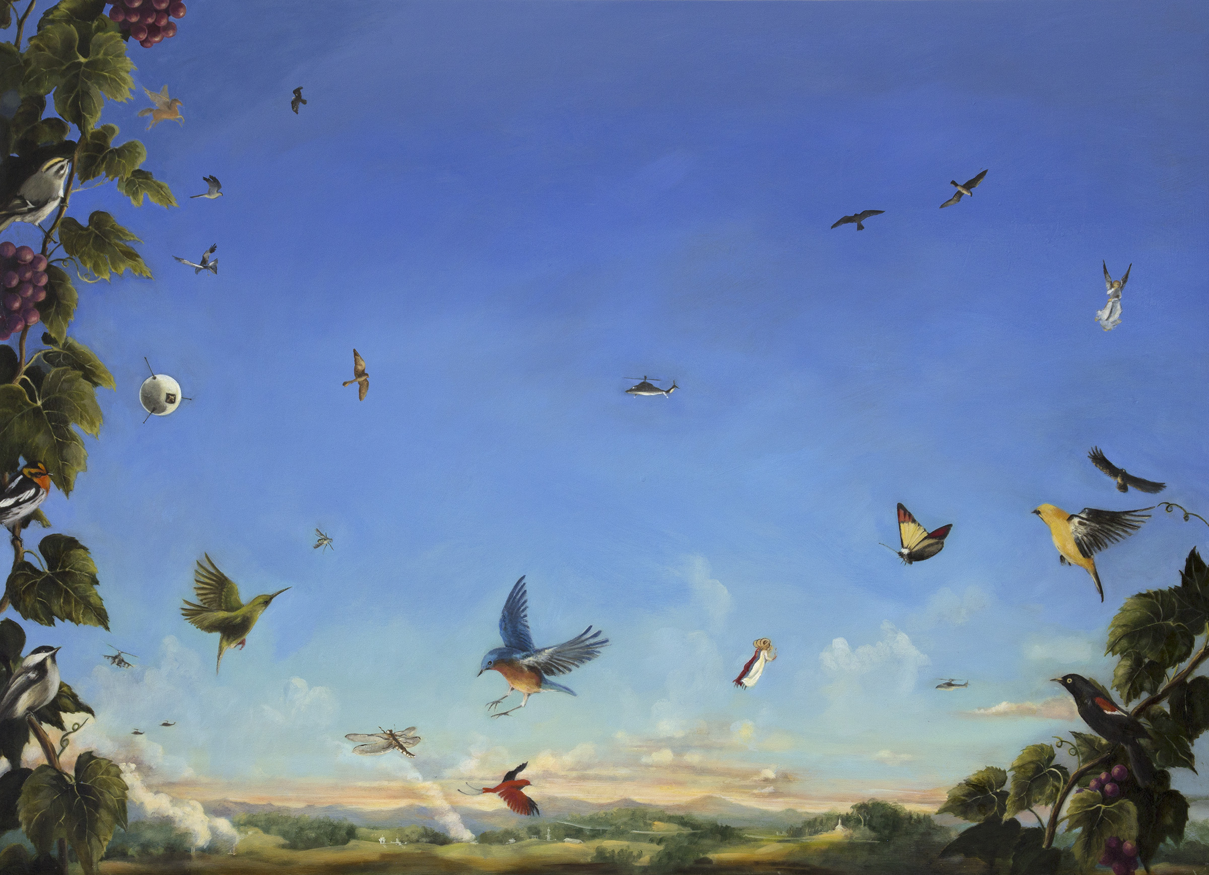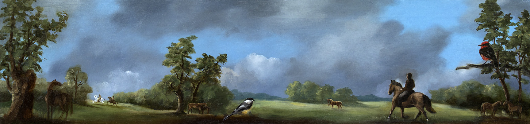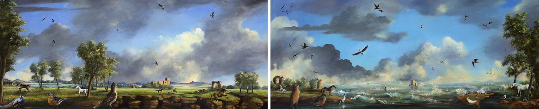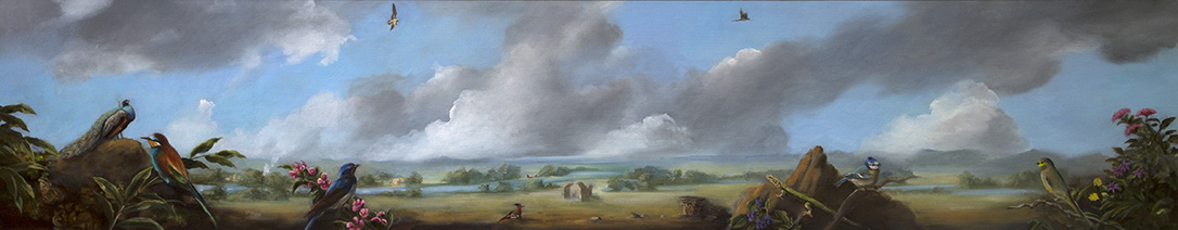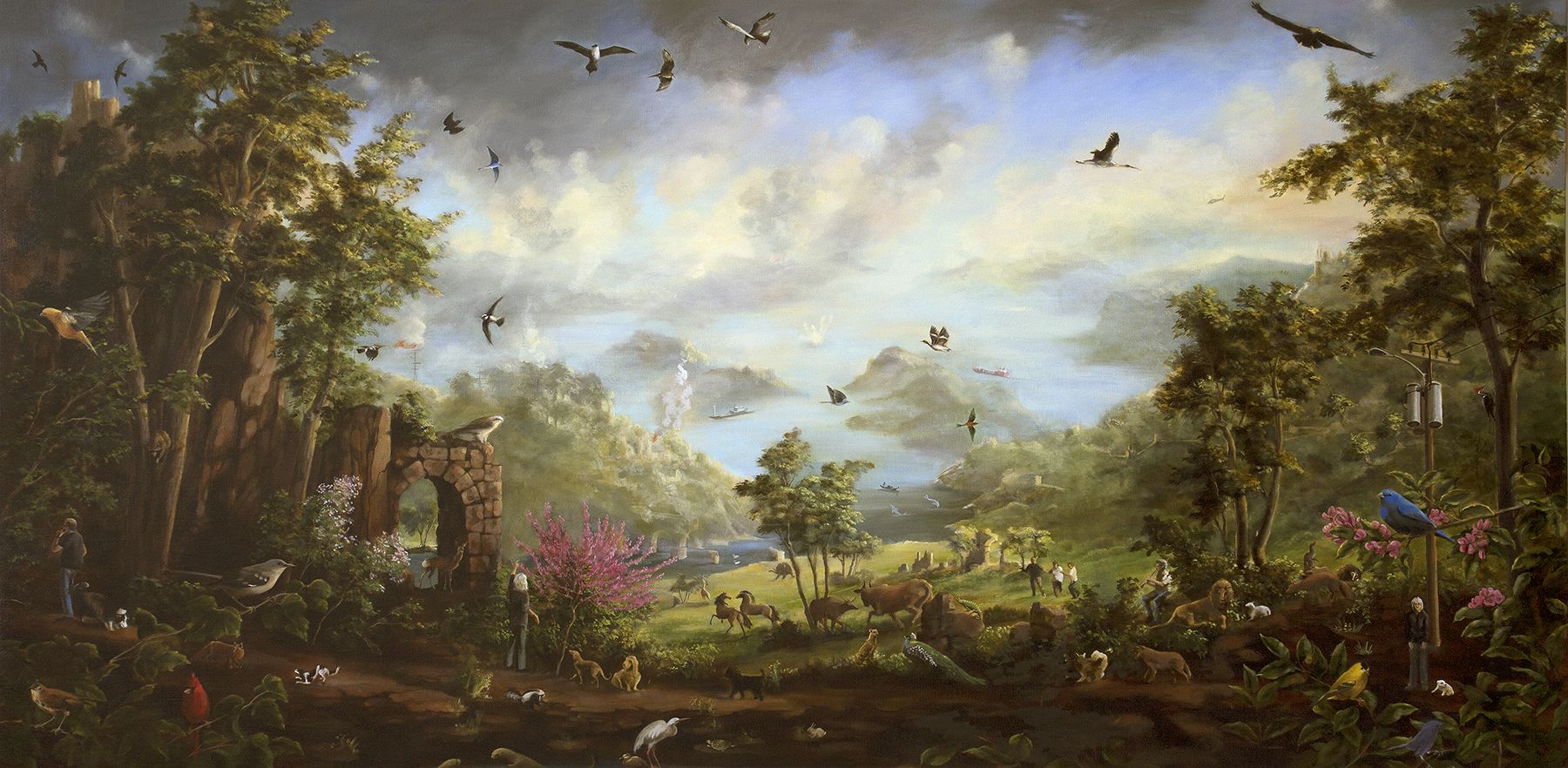 Painting allows me to imagine everything that I care about in the same view, including buildings, people, animals and landscapes. I include references to art history as a way of reflecting on past ideas, ideals and cultures. I am influenced by the European renaissance masters such as Bruegel, Cranach, Mantegna, Fra Angelico; the American Luminist paintings of Asher Durand, Church, Heade; 20th century painters Florine Stettheimer, Stanley Spencer, in whose work I see a narrative style and social commentary. I also feel a kinship with many illustrators such as N.C. Wyeth. I love detail and subplots within the larger view, and I feel that there are literary parallels. Now, after painting for over twenty years that still interests me although my focus has shifted to more awareness of climate change and its implications.