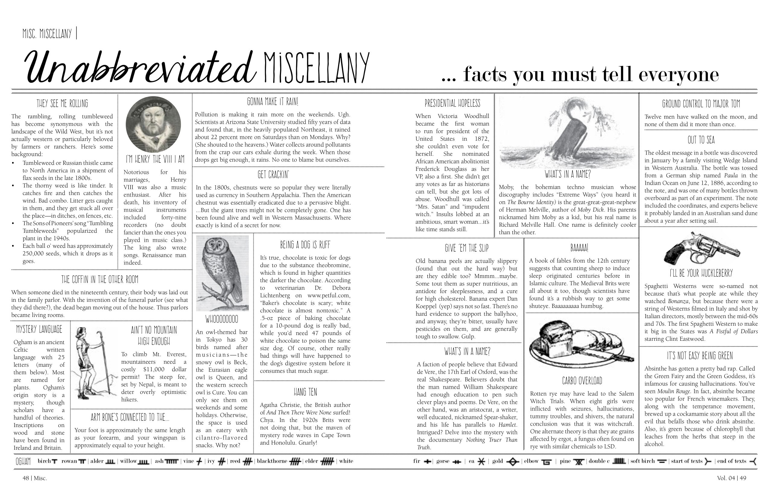 I am chiefly a writer and photographer, and I share that through The Misc., a biannual magazine I started in 2017. Misc. is short for miscellany, and as the title suggests, it’s full of everything — 48 pages of food, travel, unremembered histories and inventions, profiles of unusual occupations, photo essays, short stories, books, humor, and my favorite, a two-page spread of pithy facts. I do much of the writing and photography and all of the layout, but I incorporate other voices as often as I can. It helps to have creative friends!