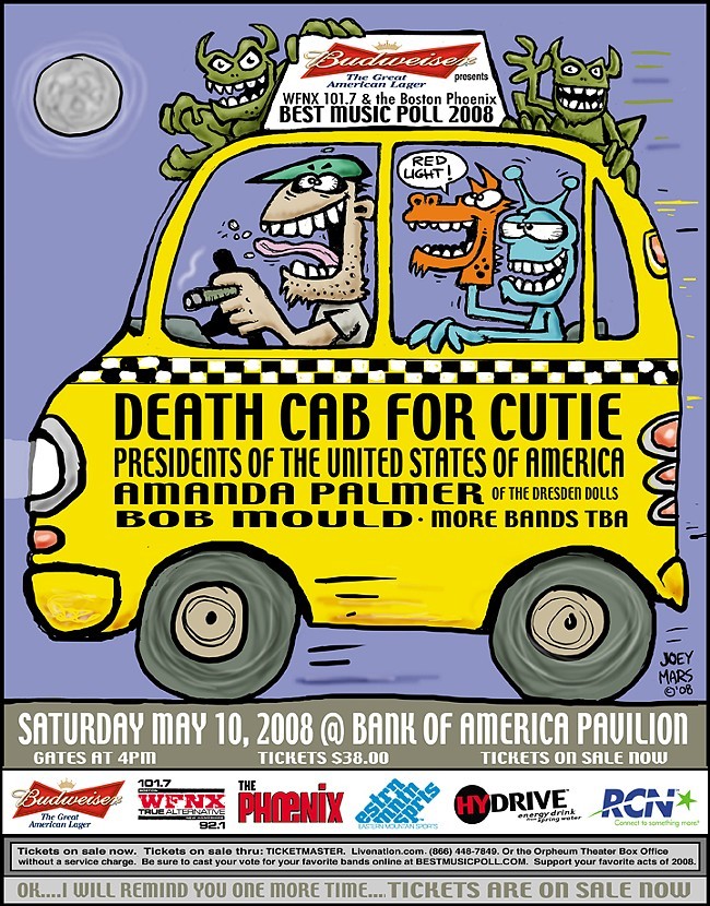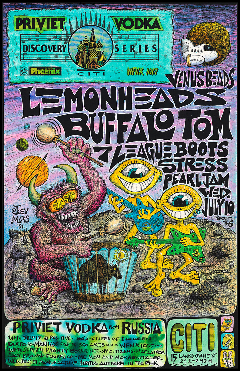 I created a 6 week poster series for WFNX and The Boston Phoenix at Citi (now House of Blues) on Lansdowne Street, that was part of the alternative scene breaking through nationally in the summer of 1991. One of the most collectible posters of this run had Pearl Jam as an opening act playing there 2nd show as Pearl Jam. From there I was able to garner national distribution deals of my work on T-shirts, posters and stickers through Liquid Blue, Polygram, Orion and Not Fade Away Inc., that put my artwork in festivals and malls across America for a lot of the 90s. Through this I was able to work with the Grateful Dead and Aerosmith for concert merchandise.