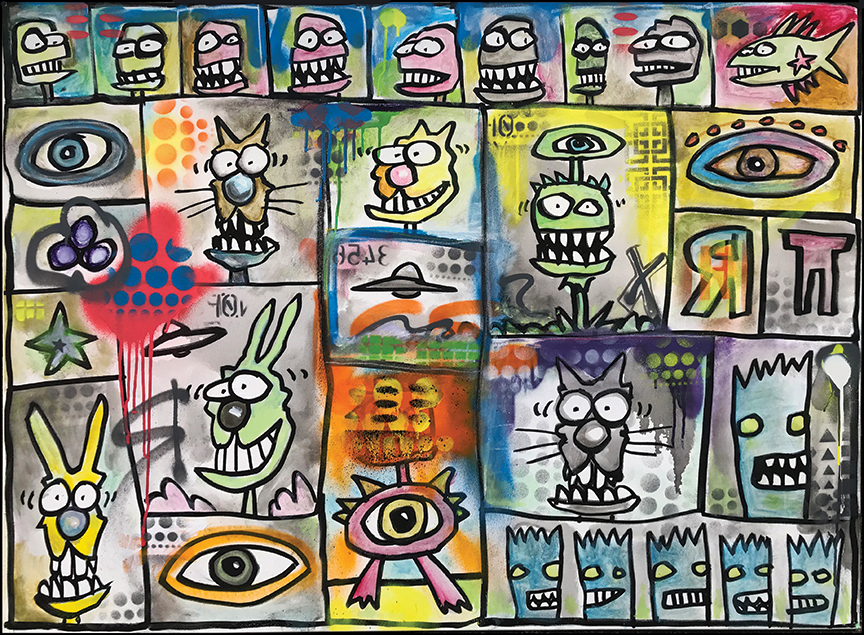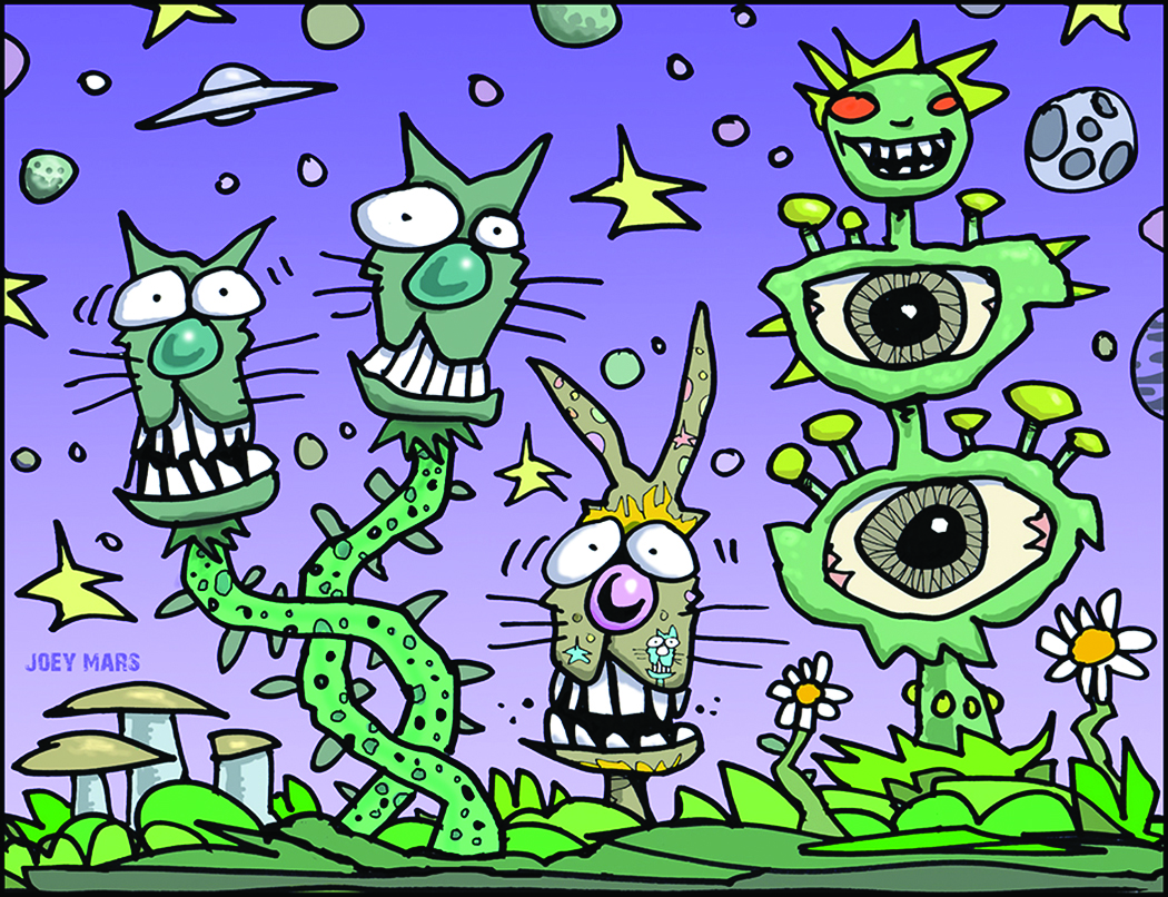 I have several styles to my work. It has an inspiration and back drop in underground comics and 60s rock poster art. Very much inspired by nature and the mysteries of life. I create a lot of original art for sale on canvas, paper and boards as well as do illustration work for Corporate marketing purposes. Lots of fun animals and strange plants and figures that juxtapose different parts of nature. I enjoy sci fi and political themes. I have created a new line of characters called Cash Money Aliens that is part of a series that recently crested 500 drawings/graphics/collages. It is presented on the website motherlode.tv. It is a push back against the modern day feed of 24 hour cable news insanity. I try to be more absurd than the news taking events and twisting them and mirroring them with hard edits and grotesque characters. I have been using the computer to create collages from physical works of art of mine grabbing abstract areas and turning them into something else and then layering in photographs and distorting levels of reality, color and texture all to try and wrap my mind in a force field from the madness. In my cartooning I believe a constant message is that nature is conscious and we obtain knowledge from Nature. I hope to give people a respite, a mind cleansing, a small break from the daily rigors of life on earth. If I can make people smile or question the dogma I am happy.