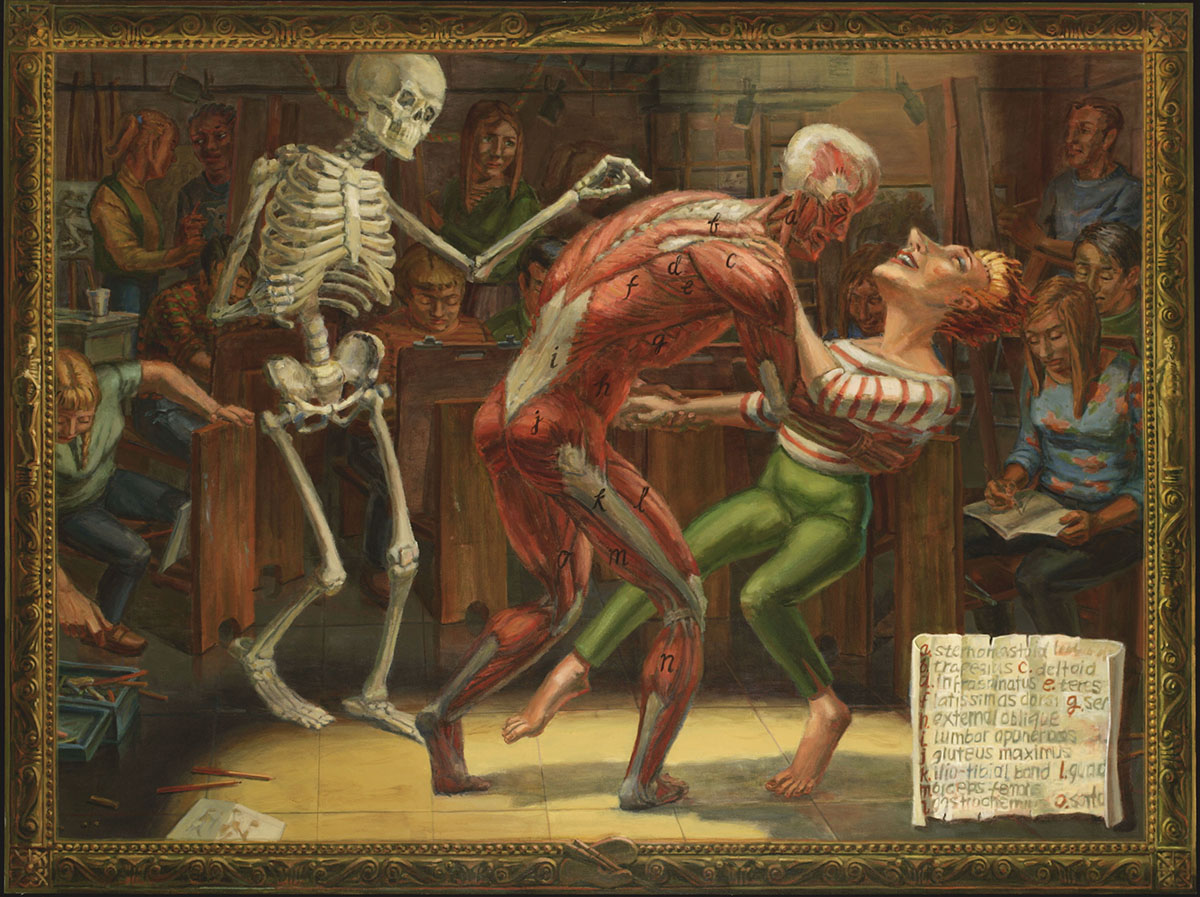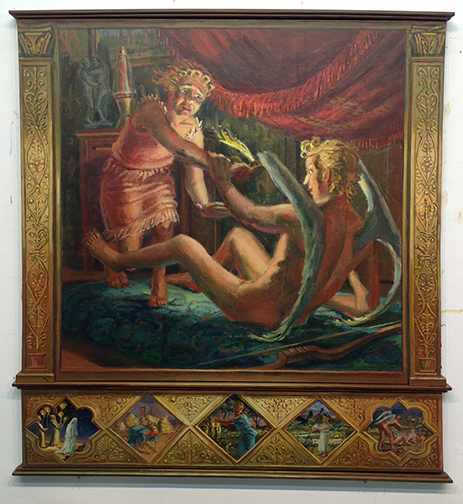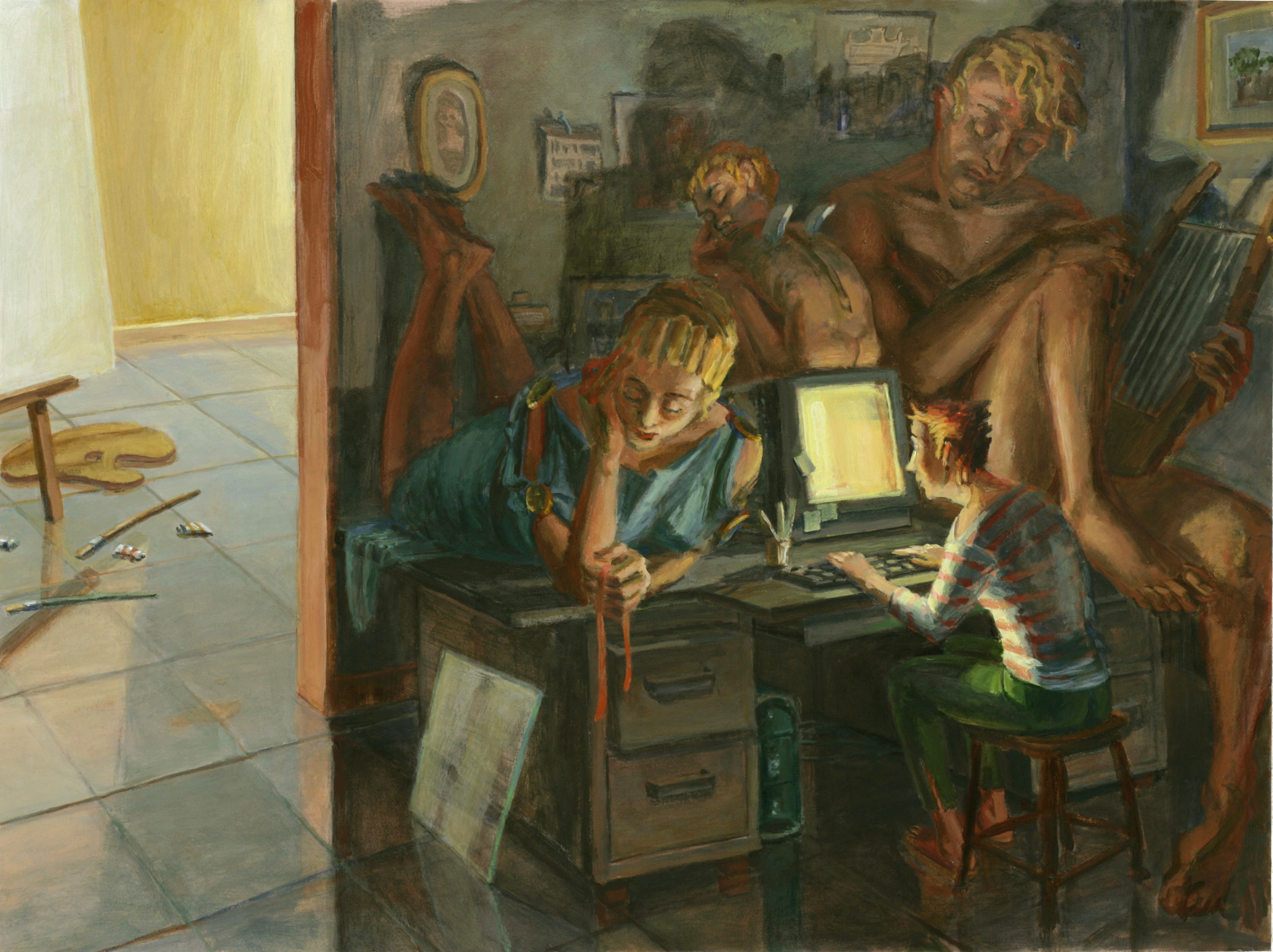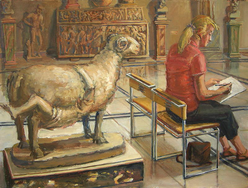 In 1981 I developed a character who inhabits my paintings as the ‘Archetypal Artist’, my alter ego. She is the equivalent to Alfred Jarry’s Pere Ubu and the narrator in paintings focusing on the artist’s predicament. Wearing red and white striped shirt and green Capri pants, she has metamorphosed into Athena, wounded Chiron, played to Pygmalion, and accompanied the Three Fates. I strive for that precarious line between the downright silly and the sublime, perhaps in order to sabotage both extremes, but more often just to see if I can pull it off. The cross-referencing of classical mythology and current events gives my painting a longer shelf life.