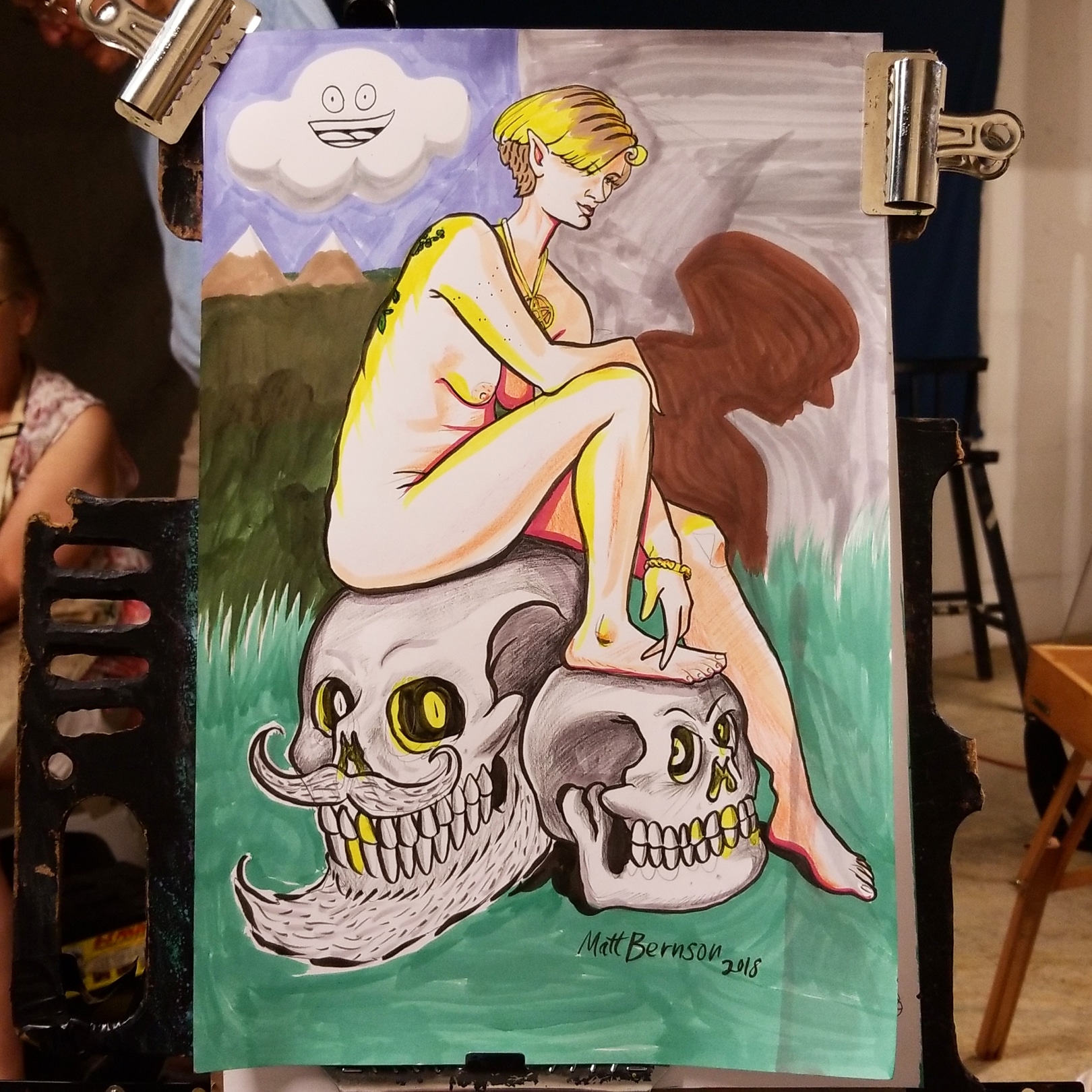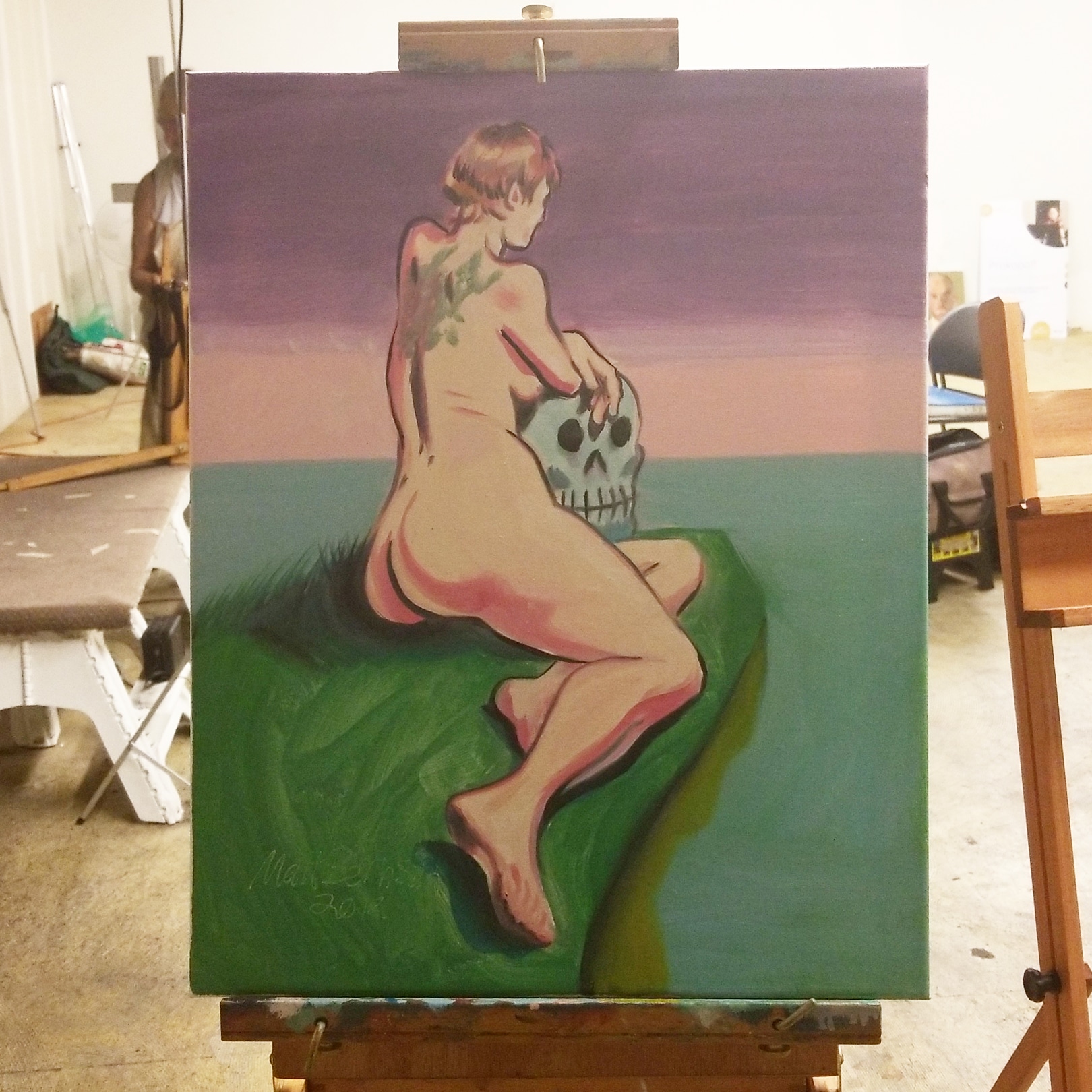 I like making figurative artwork. When i was young i loved drawing dragons and monsters, comic book characters, etc. I still like a lot of that stuff but now i do more work (paintings & drawings) that is observational, figure drawing, portraits, skulls, Godzilla. Depending on what work I’m making it may be a mixed media piece on paper (ink, watercolor, crayon, graphite, charcoal, etc) or acrylic on canvas or oil on canvas. I like to work bigger when possible, my biggest drawing board is a little bigger than 2 feet by 3 feet. Not big for some painters, but it’s a monster compared to most other drawing boards. When i paint recently I’ve been sticking to 16″x20″ but i wouldn’t mind going bigger when i have the space. I swap out chairs for skulls in my work (because chairs are boring and skulls are awesome). I try to make stuff that could only be a drawing or painting and not something that could’ve been made by a camera. I hope people can see something they haven’t seen before and be inspired to think and live more creatively.