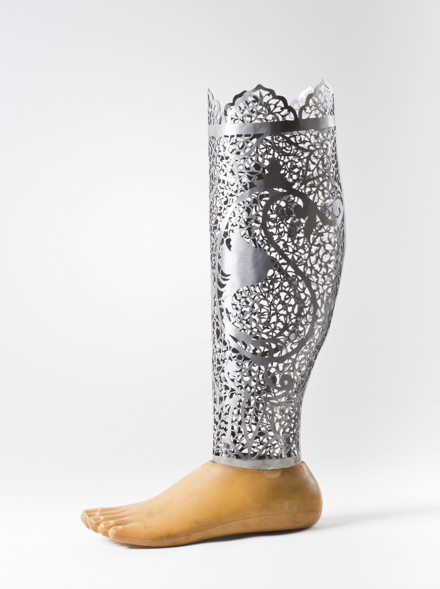 “The Peace March” is a series of three-dimensional works which seek to ameliorate war’s wounding by employing used prostheses – hands, legs, and feet – which have been transformed into art objects using modern and traditional techniques, methods, and materials. “The Peace March” is inspired by females who endured and have suffered from the Iran-Iraq war. However, after moving to the US I had the opportunity know and talk with both Iraqi and American women. I have learned that our stories are the same, despite the nationality or language differences, and I hope my art can connect people from diverse backgrounds.