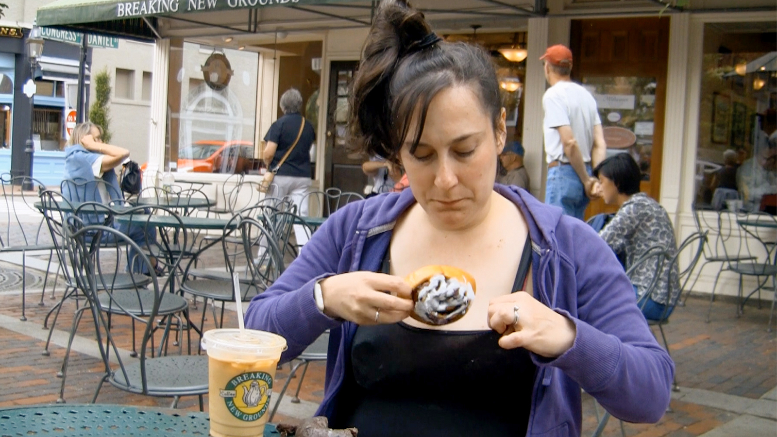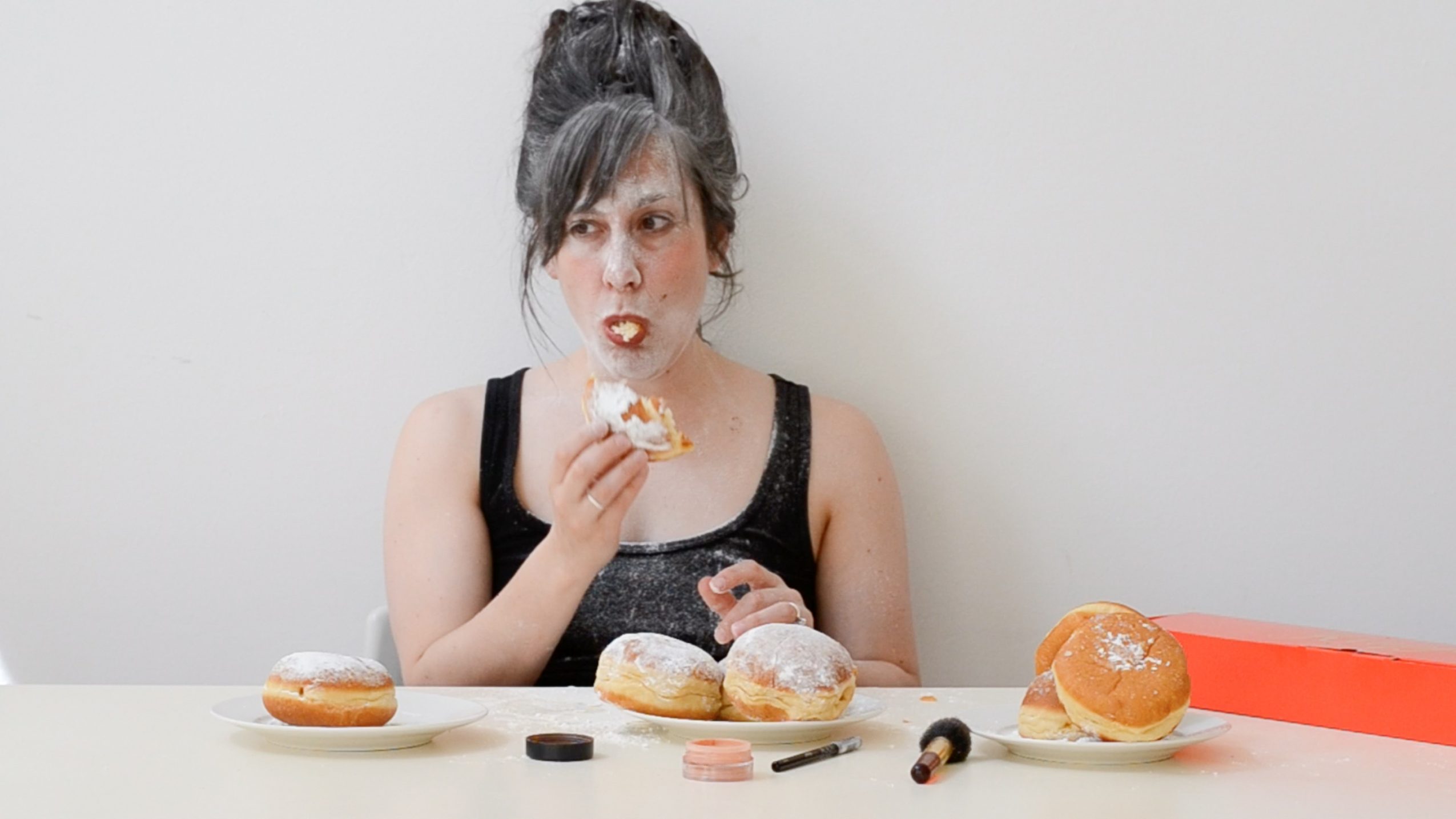 I do this by using different strategies and, as I mentioned, different media. I often layer clothing or video as a way to hide, reveal or to create emphasis in my work. I perform athletic tasks or endurance works with my body that often result in failure. I play with cultural ideas around women’s relationship to food in my videos.