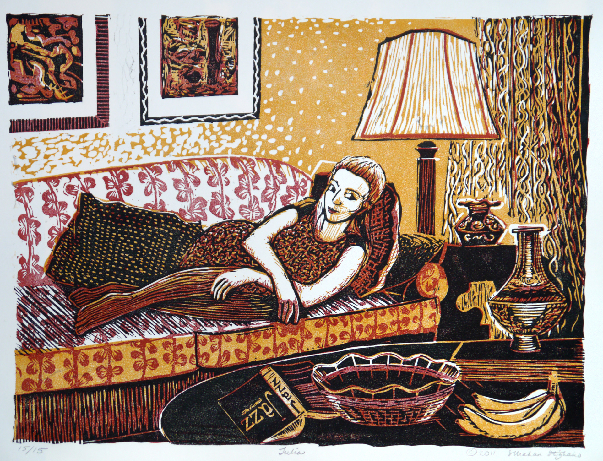 Most of what I do relates directly to my immediate surroundings, and often includes nature and the figure. I find inspiration all around me. The book “Temporary Passage” was inspired by the death of my mother and the belongings she left behind. The three-color linocut, “Julia Waiting for Midnight,” was developed from my drawing of a friend on New Year’s Eve; the idea for the woodcut/screen print “Garden Goddess,” was born when I saw my neighbor wearing a long gown while watering her garden. The etching “Lichen Doily” and the drawing “Poison Flower” were based on finds from my daily walks.