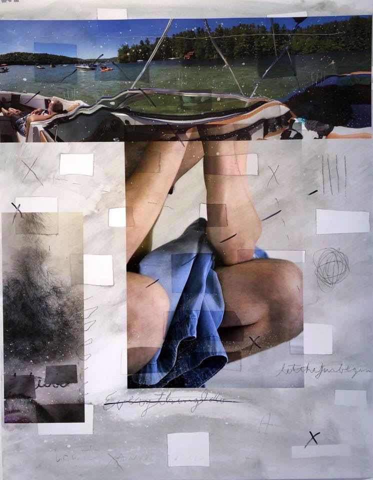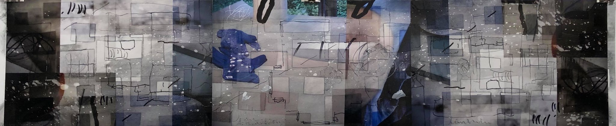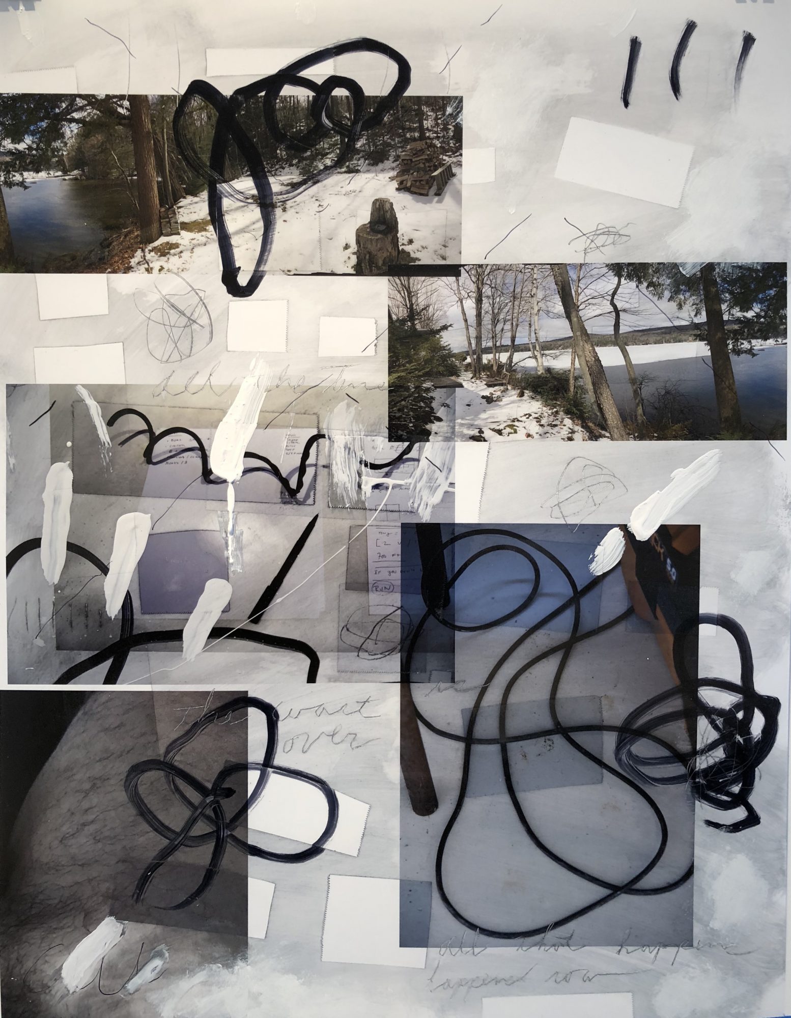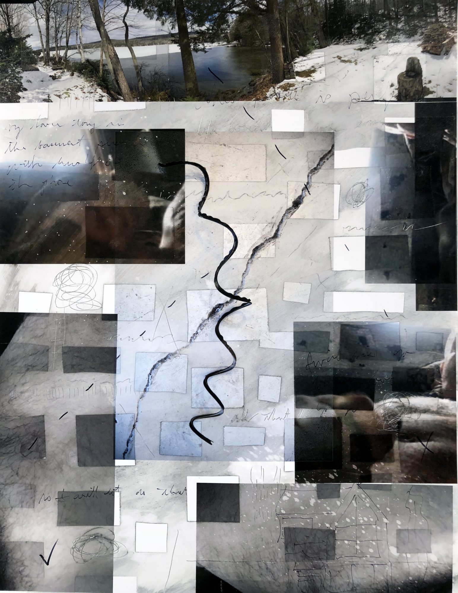 Currently I am working on a hand altered photo process, which I call Ink Jet Reduction. In this process I mask areas of photographs and write and draw with razor blades and sharpies (recently the addition of paint). Then I use chemicals to melt the exposed ink, re-arrange it, erasing parts and darkening lines. Currently I am printing multiple times on a single sheet of 17” X 22” paper, with some overlapping images to build the work surface up gradually and manually rather than using Photoshop. Multiple sheets of paper are sometimes joined to form larger works.