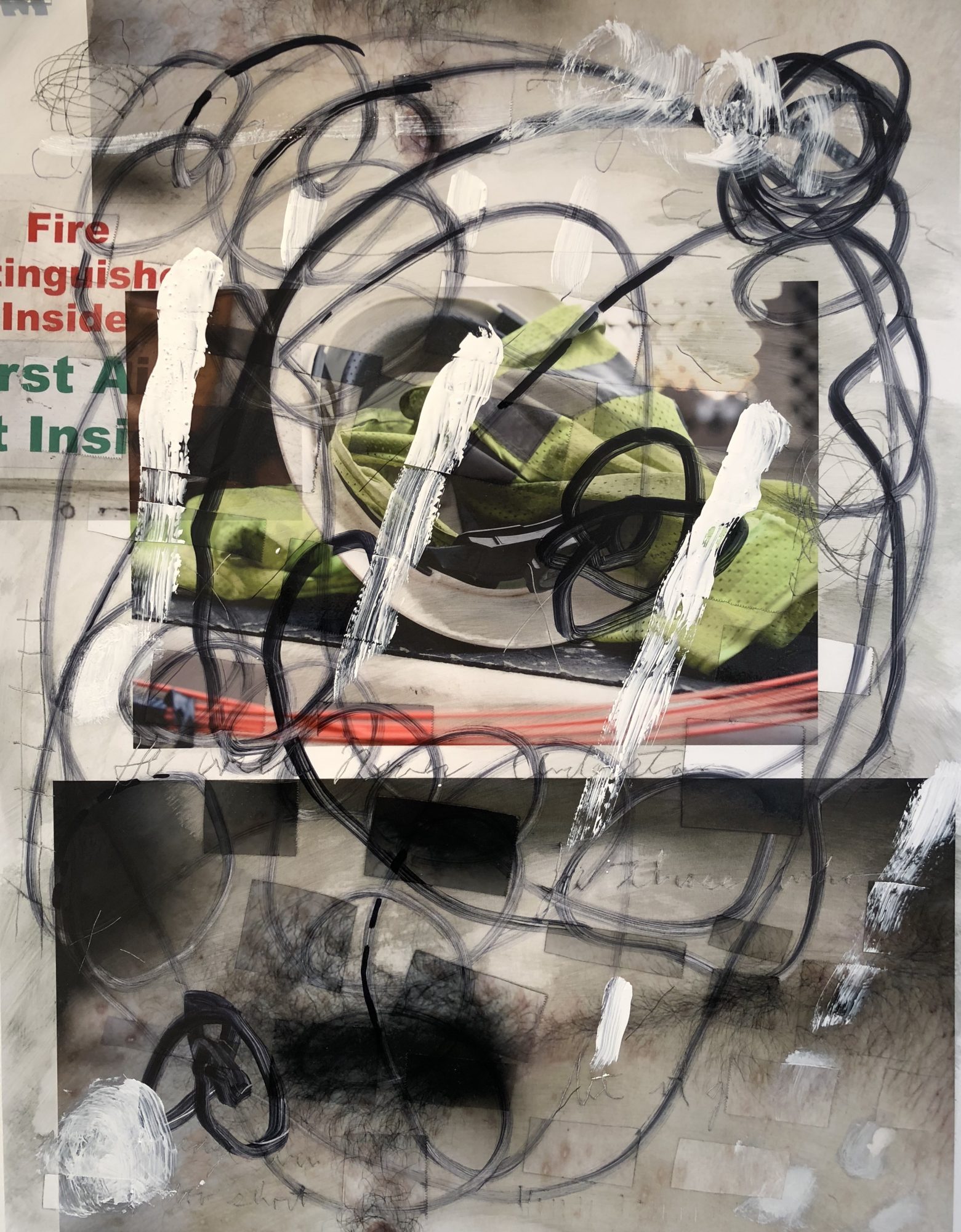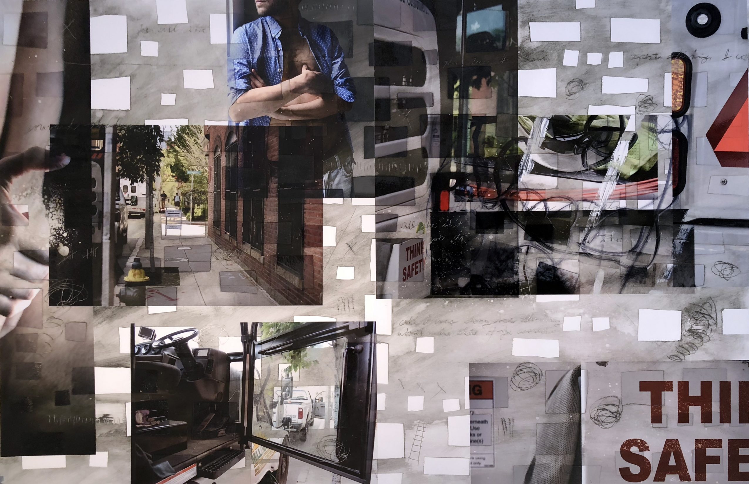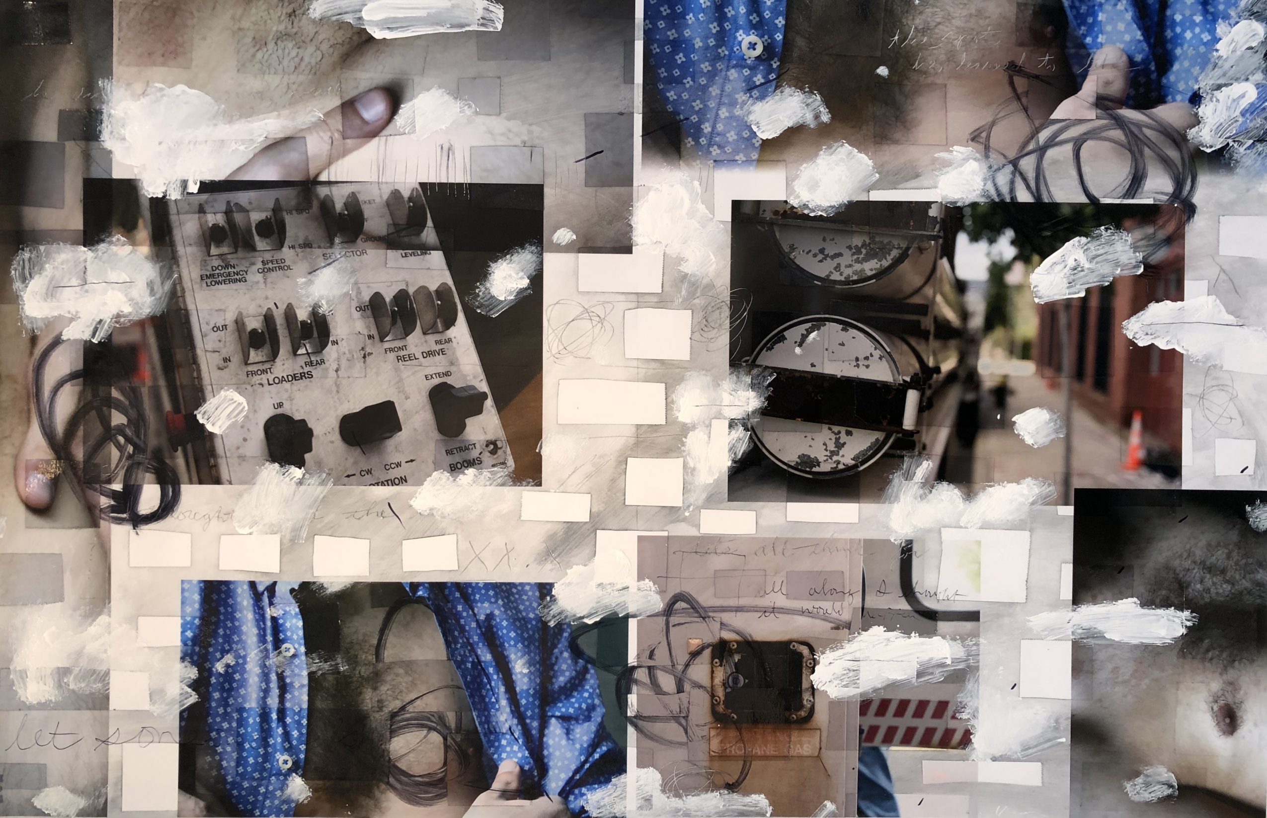 Currently I am working on a hand altered photo process, which I call Ink Jet Reduction. In this process I mask areas of photographs and write and draw with razor blades and sharpies (recently the addition of paint). Then I use chemicals to melt the exposed ink, re-arrange it, erasing parts and darkening lines. Currently I am printing multiple times on a single sheet of 17” X 22” paper, with some overlapping images to build the work surface up gradually and manually rather than using Photoshop. Multiple sheets of paper are sometimes joined to form larger works.