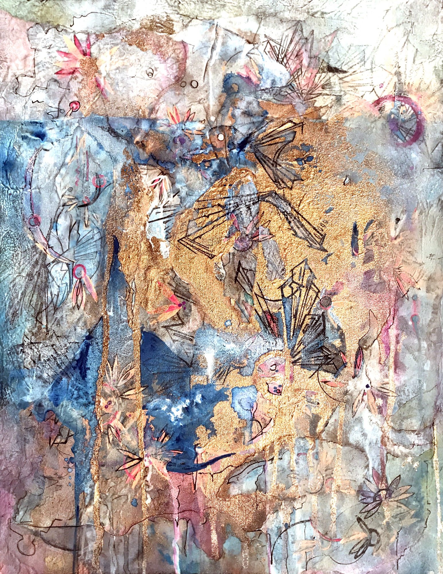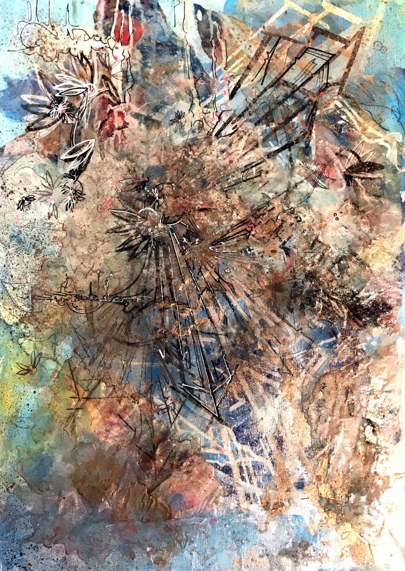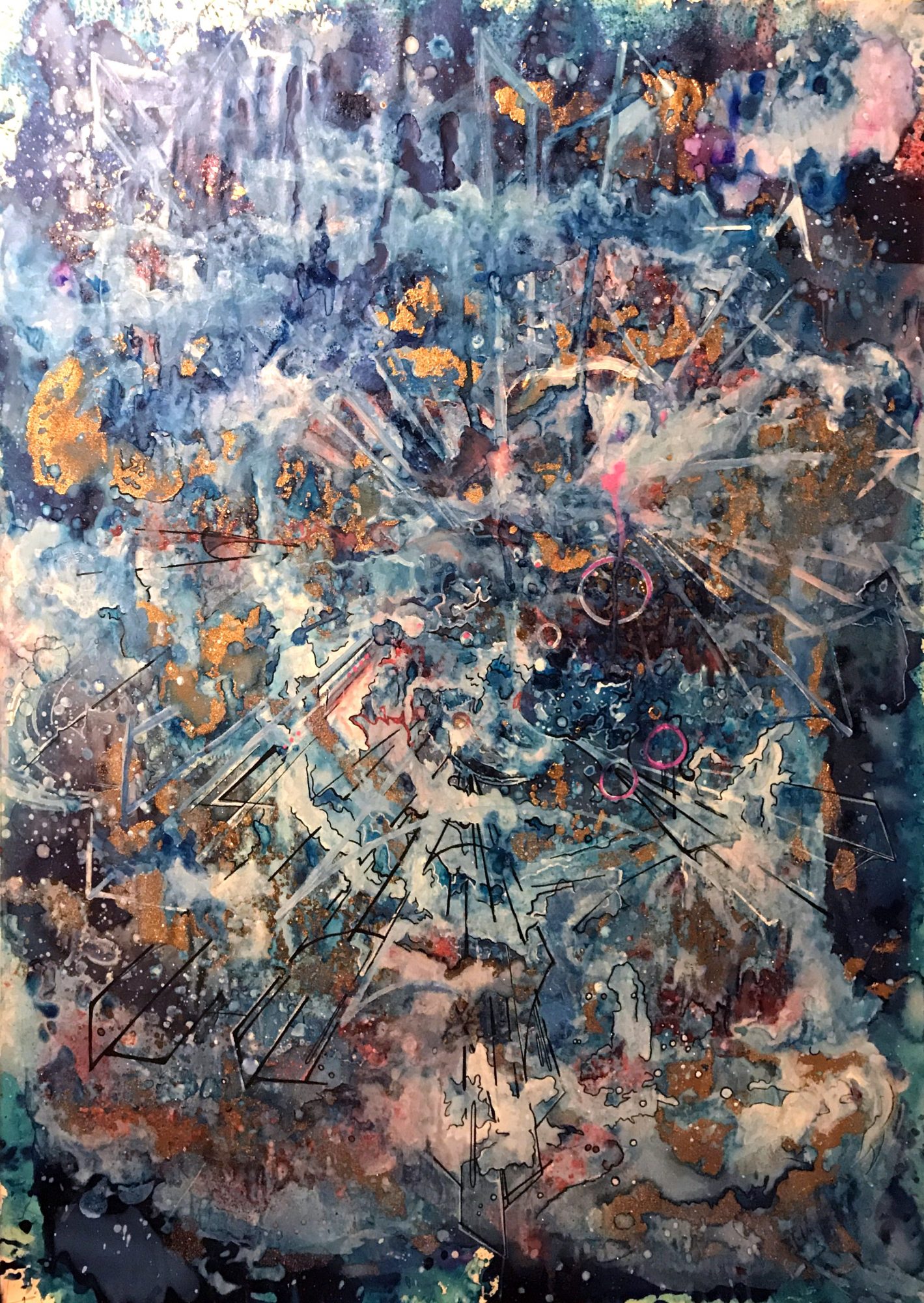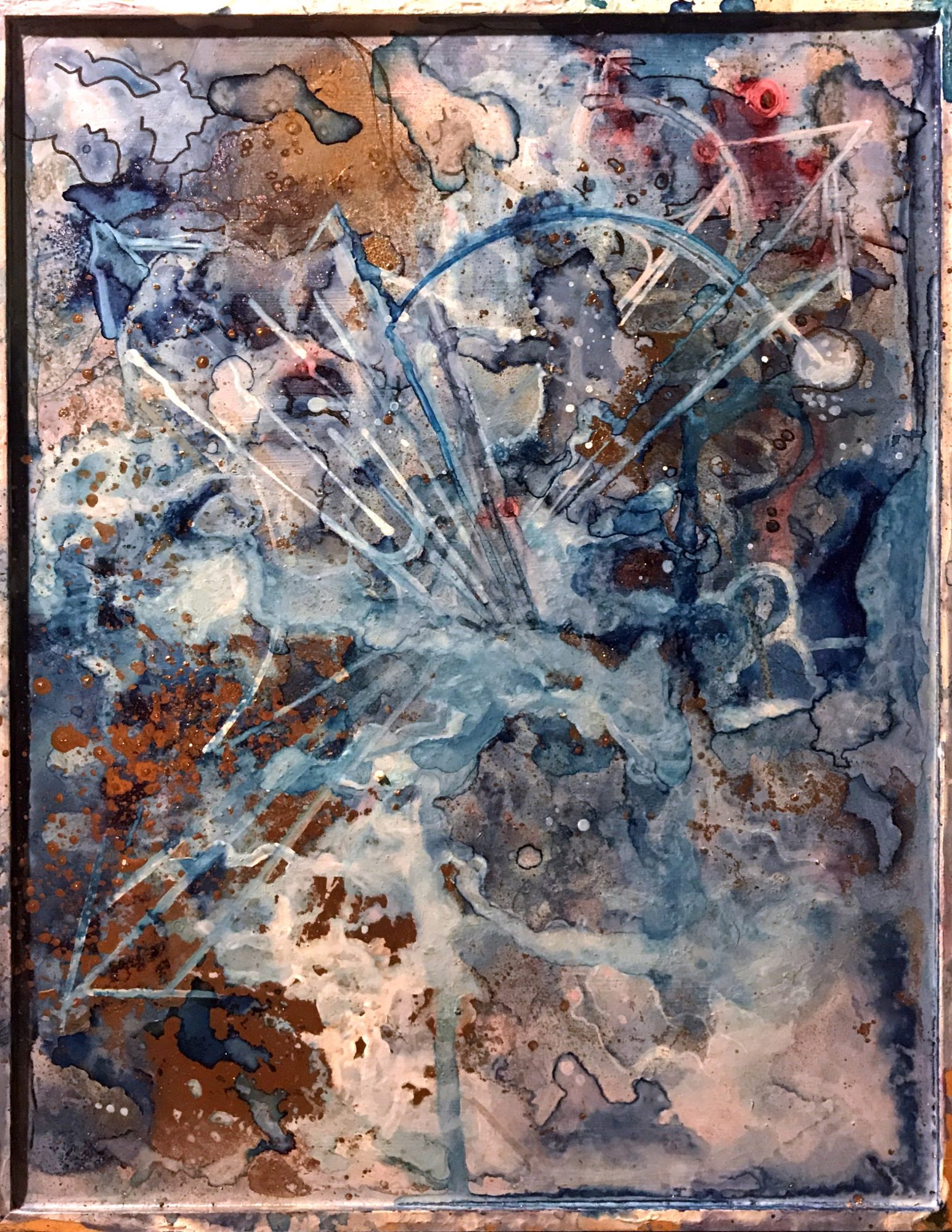 Once I am working on one piece, I usually step away work on something else and make my way back, because it takes me sometime to really try to imagine the look of how I want it to look. I will also work on something because I really want to paint at that moment, and later I will not care for it, but I will use that canvas and I’ll build on my mistakes. I’ve found that these are some of my strongest artwork. In my artwork now I use spray paint, resin, ink, graphite, watercolor, acrylic paint, glitter… a lot of fun things. I am definitely inspired by the griminess of cities, flowers, nature, and layers of texture and materials. I’m inspired by artwork that you stare at for an hour trying to find all the perfect little spots where something magical happened, pieces you can really get lost in. I’m into old psychedelic music posters from the 60’s, the colors they chose and the other worlds quality they had. I’m inspired by the process of creating artwork, I get motivated even besetting up my work area to make something new.