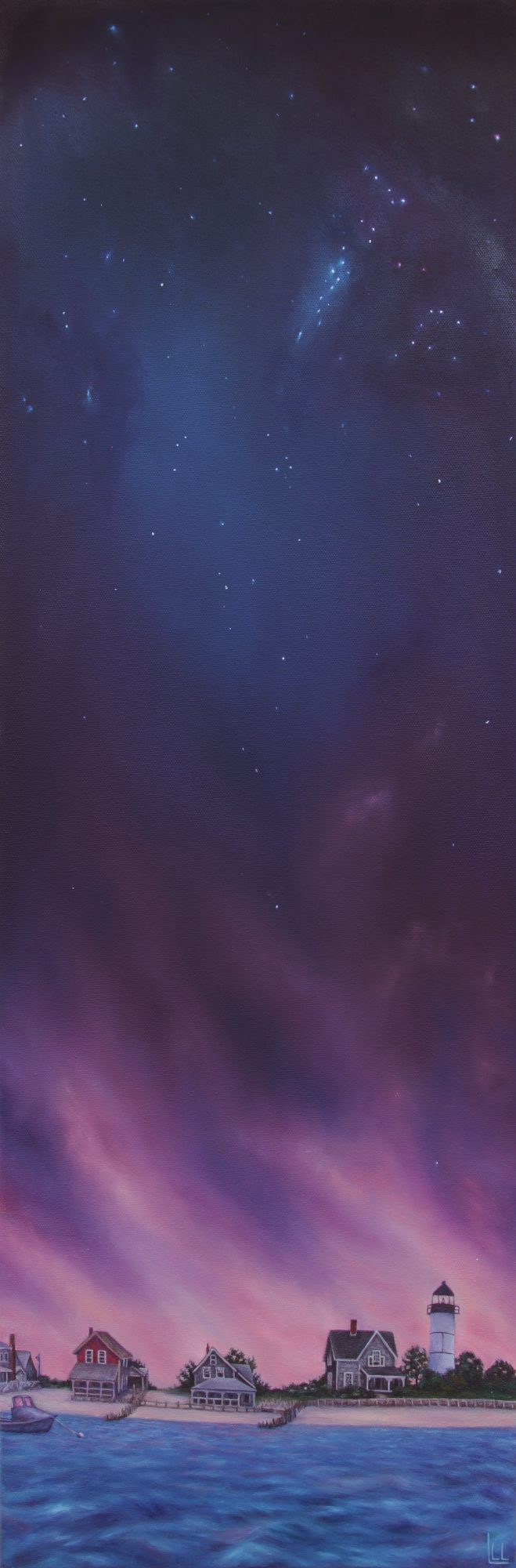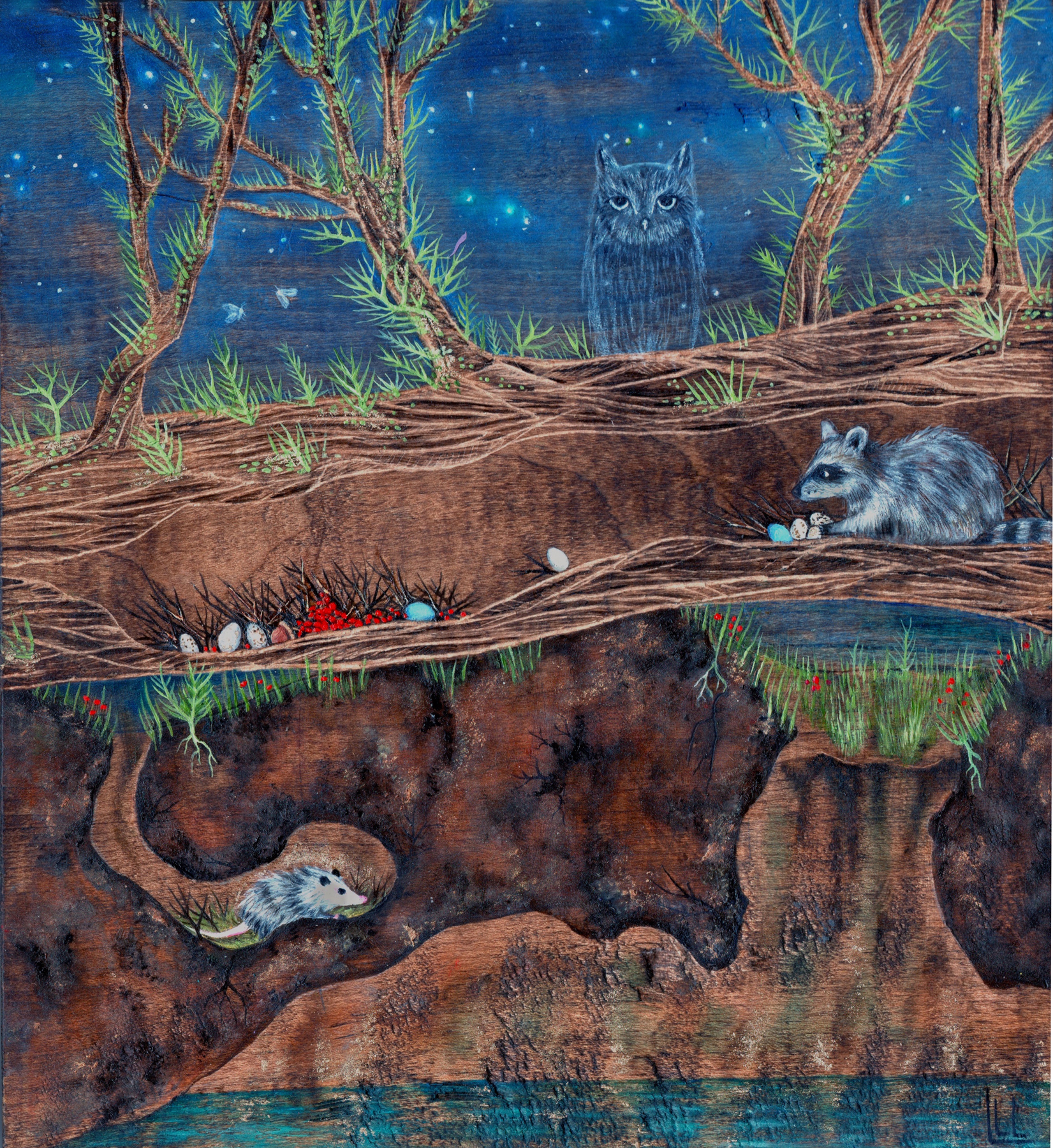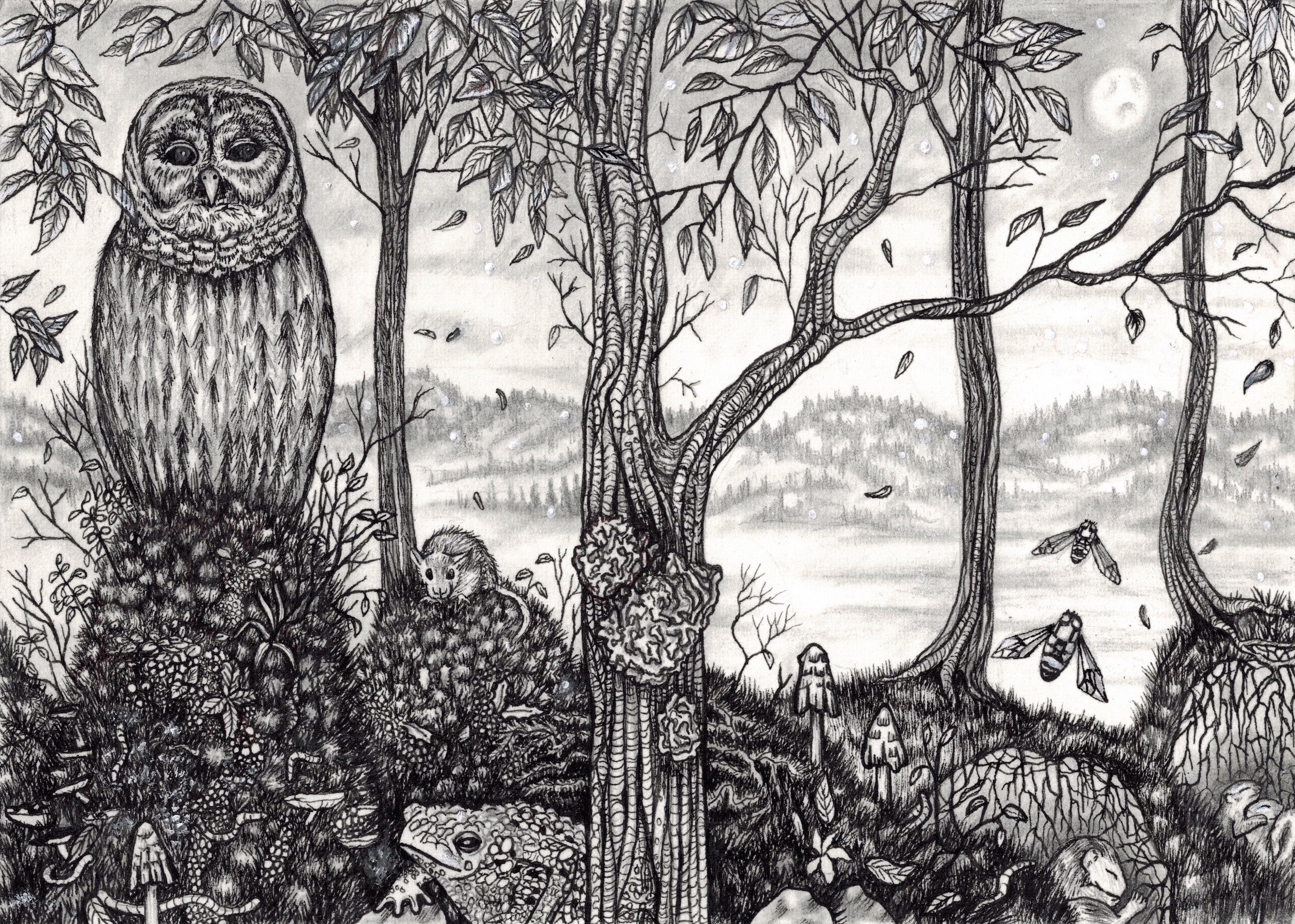 I create atmospheric landscapes that transcend the ordinary. Sometimes my work is subtly surreal and other times it’s very fantastical. I work in a meticulous method and incorporate lots of small detail. People have told me that they would lose patience working that way, but for me the process is soothing and a piece would feel incomplete without rich visual information.