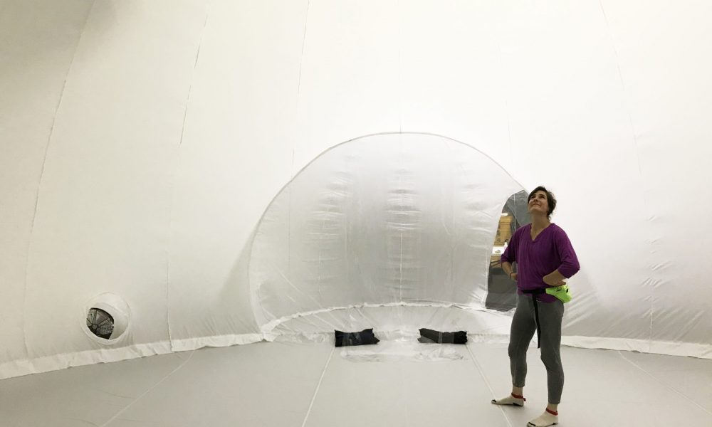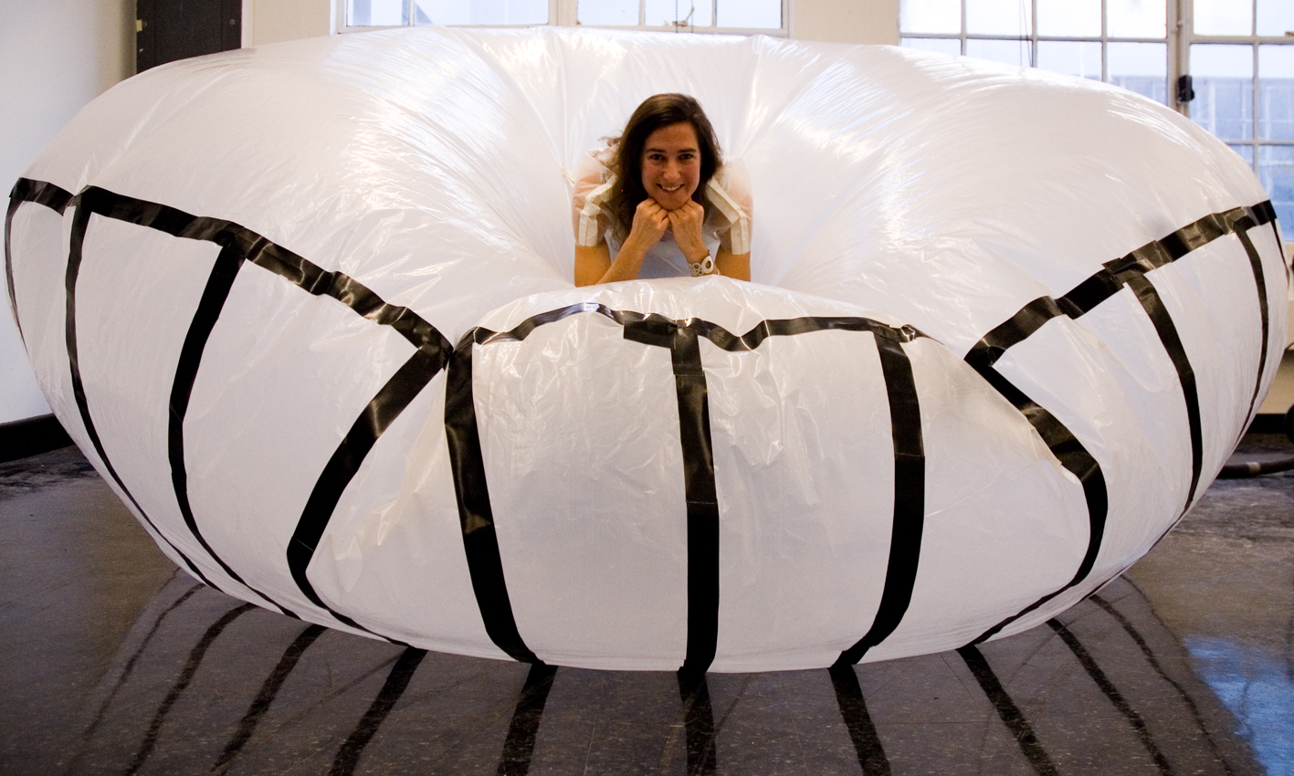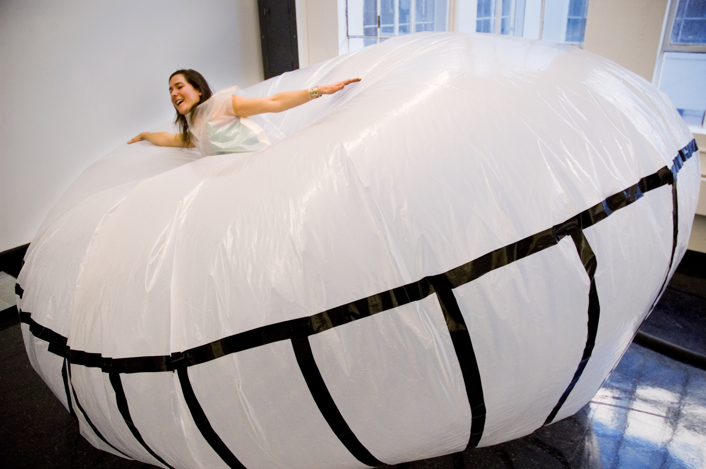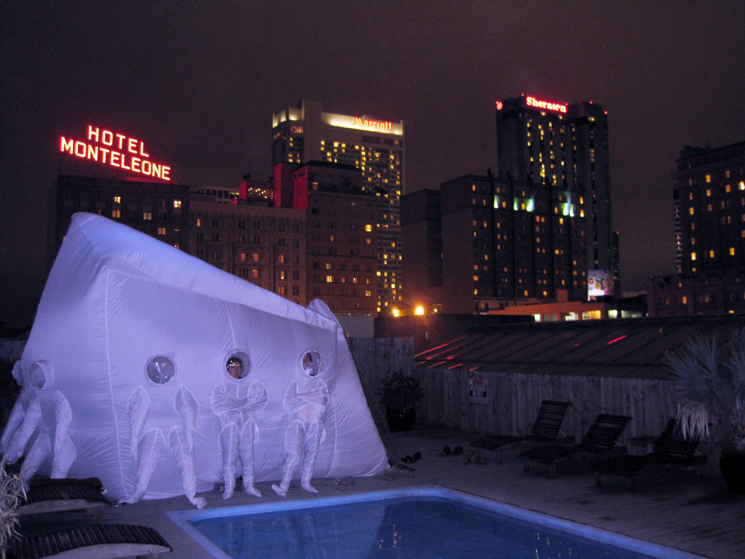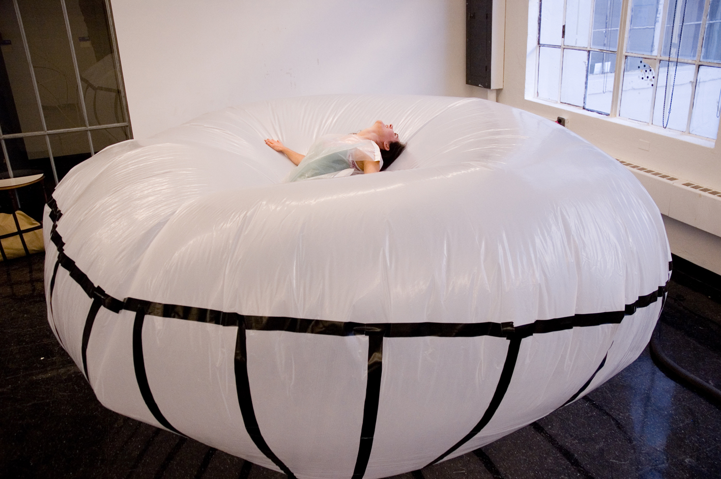 My work is at the intersection of architecture, set design and installation art. I especially love to create architecture that amplifies human subjectivity and movement, most evident in the moving, “breathing” low-pressure inflatable spaces I’ve designed and built. This area of artistic investigation began while I was an architecture student. I took an elective art class in Body Wear, and for my final project created a wearable personal blimp prototype called The Monumental Helium Inflatable Wearable Floating Body Mass. Later I was commissioned by the New Orleans Chapter of the American Institute of Architects to create Itinerant Home, a wearable inflatable house for eight people. Both installations symbolically used iconic form that would be distorted through the amplification of the untrained, spontaneous movement of the wearers.