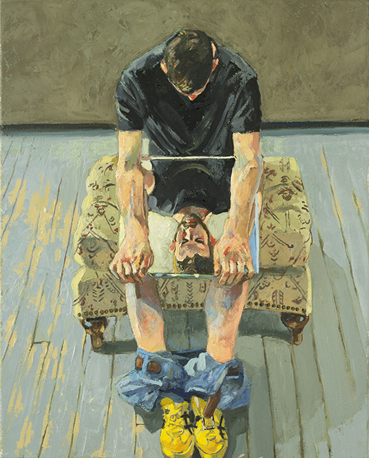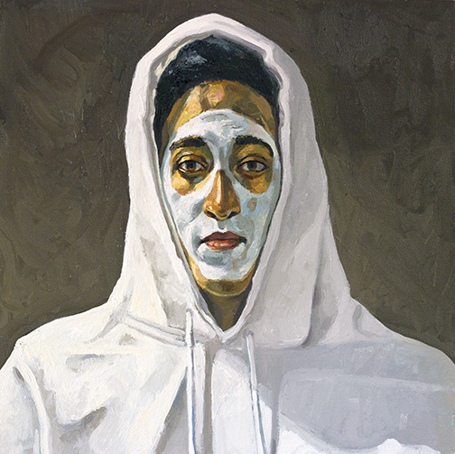 Much of my inspiration is birthed in writing, in particular, Umberto Eco’s essays “The History of Beauty” and “On Ugliness.” I often reference myself and other models as classic figures of tragic comedy, such as Gilles or Pagliacci. These beings become allegories for the “lone poet” that lives in all of us. I use the composition creating a familiarity that makes the persona of the model more approachable while recreating them in a 21st-century language. I have found myself examining my visage as I enter my senior years. These days my relationship with the tactile qualities of the surface has taken precedence over the image. The surface of the paint speaks to the London School as flesh as meat.