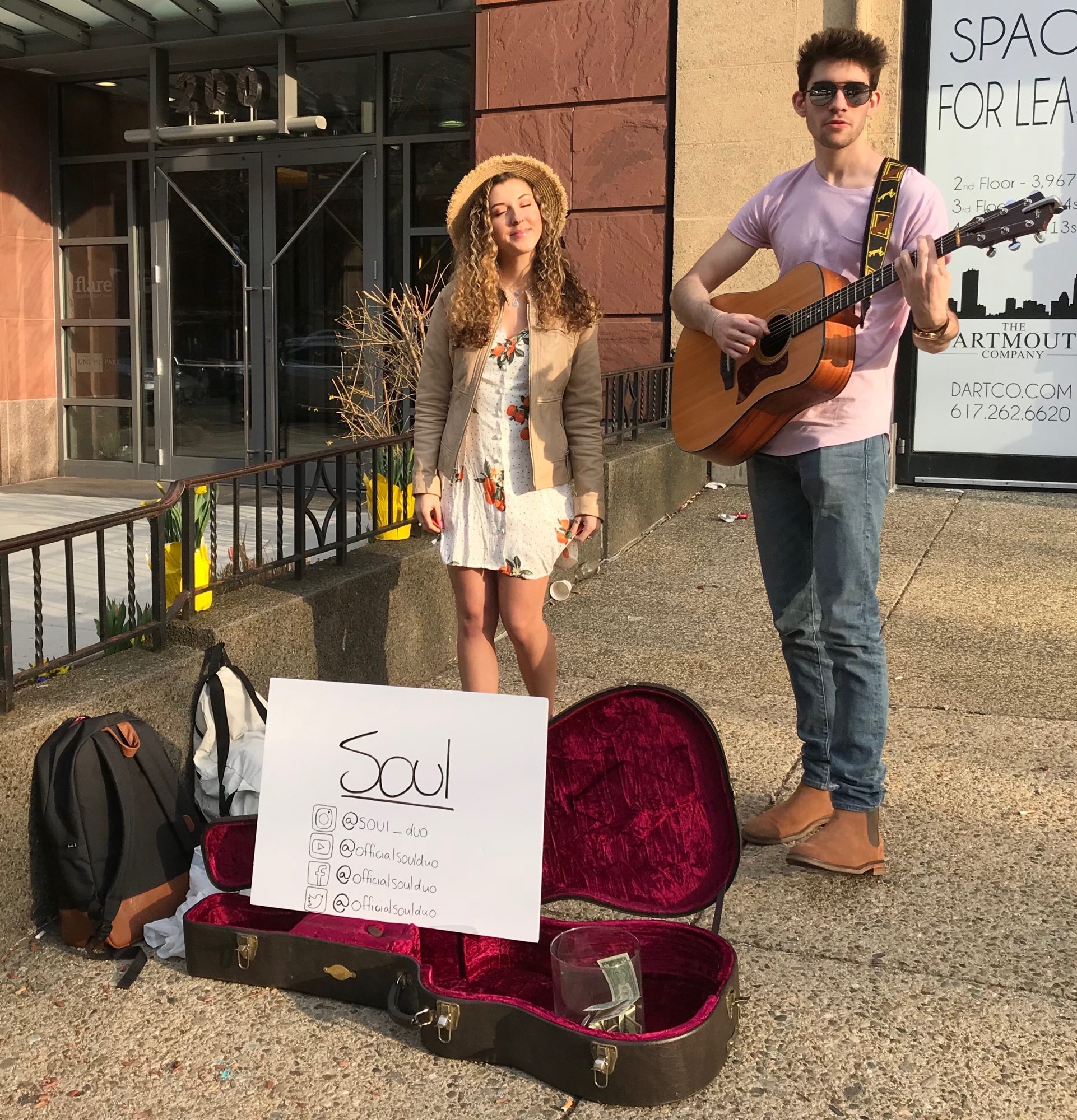 Geena: Right now, we have a YouTube channel @officialsoulduo where we make covers of popular songs. The covers range from impromptu, raw acoustic songs such as our covers of “La Vie En Rose”, “Halo” and “Best Part” to fully arranged and produced cover songs like “If I Ain’t Got You”. In the larger production pieces, Mike plays all of the instruments and adds electronic elements. I like to add b-roll of our environment or process in our videos, though it proves to be a bit difficult when you are also singing on camera! We hope to try making more cinematically aesthetic videos with more fully produced audio this summer. We also have social media accounts for Soul specifically, @soul_duo on Instagram and @officialsoulduo on Facebook and Twitter. There we really try to utilize community engagement from people who listen to us. That’s the main reason why we do this– we both love production, performance and making original content. By using this huge culture of social media, we can exhibit the things we make and enjoy for others to hopefully connect with. It’s like making a constellation, which is the thing I strive for most in my life (I have a thing for stars). We are really passionate about having as close a relationship with our listeners as possible. That’s why we start with the silly clips and have the handwriting motif. Handwriting on its own is something extremely sentimental and valuable to me. I wanted to carry that into Soul because it portrays the authenticity we have and the intimate connection we hope to have with the people watching. I usually write the intros and outros, but our logo is in Mike’s handwriting. It’s real, close to home, and not fake or too flashy, which is a common concern in our current media. People should watch us and expect two students from Boston who love each other, creativity and music so much that they need an outlet to express it all. For us, that outlet is YouTube, busking on the streets, gigs and whatever other opportunities we can make happen.