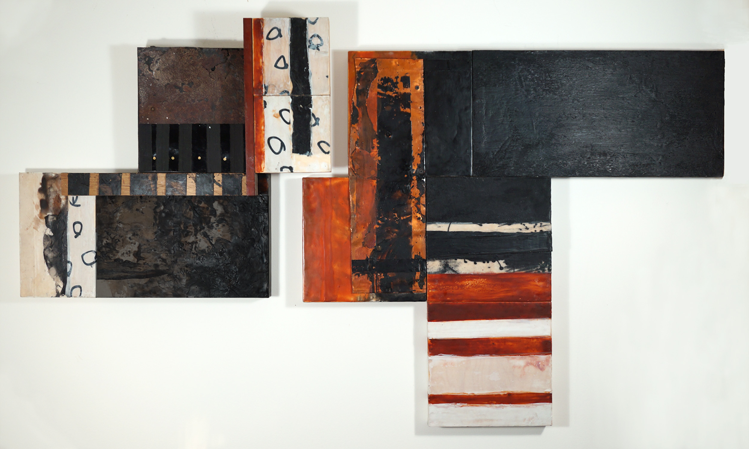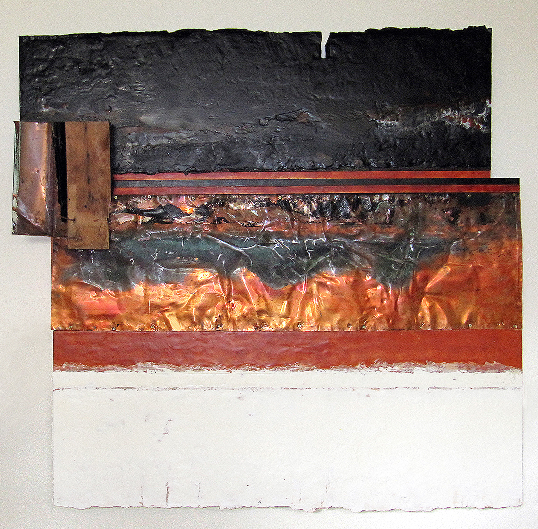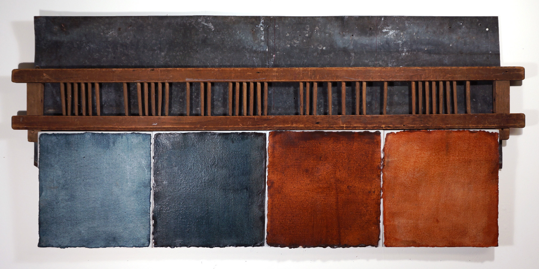 Four, 2017, 24” x 50” x 3”, encaustic on paper, metal, wood