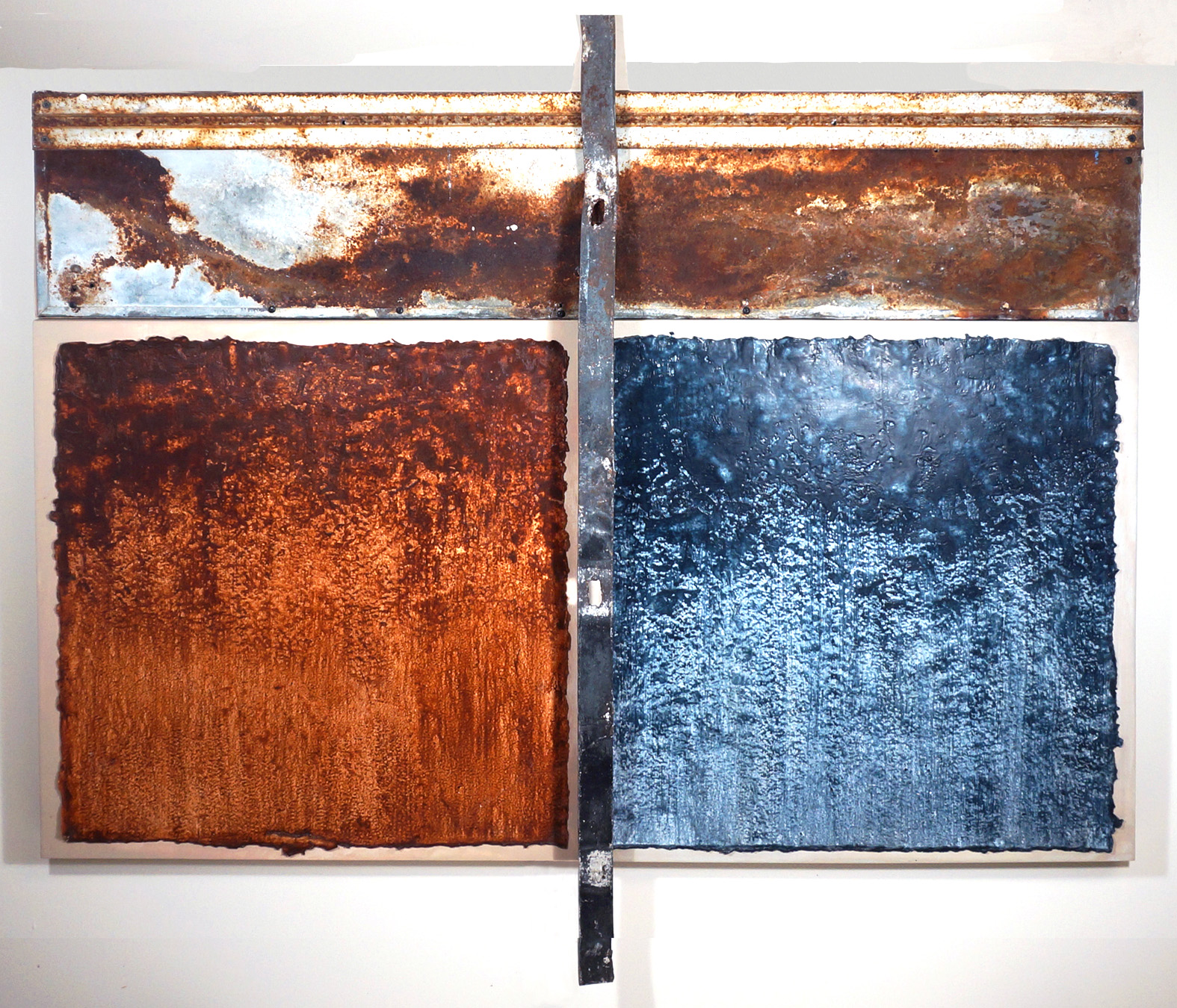 It Takes Two, 2017, 55.5” x 48” x 4”, encaustic on paper, metal, wood
