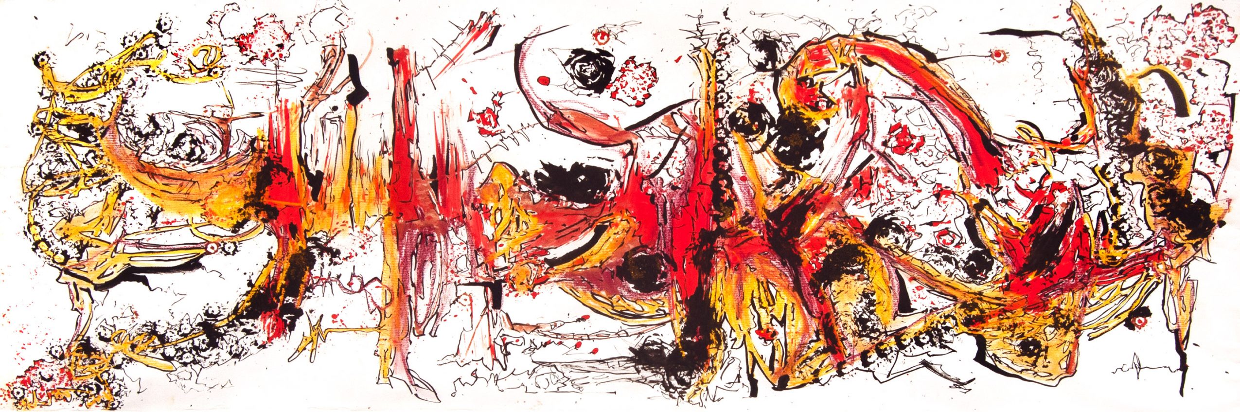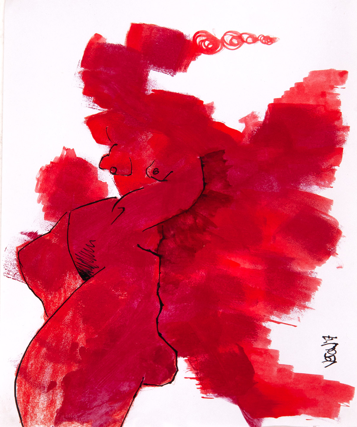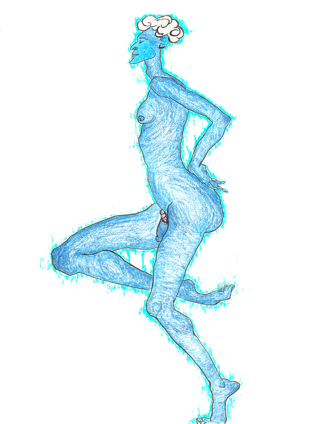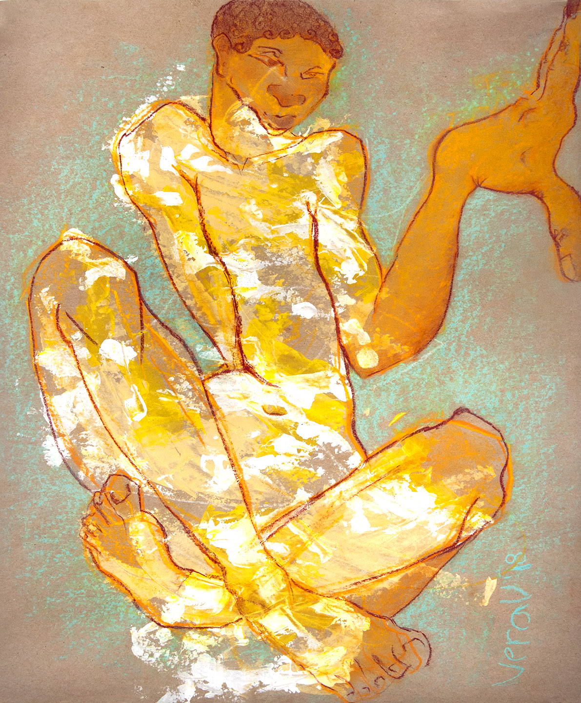 I strive to allow shapes and forms to happen organically. I work with them freely before adding control. I start by taking my pencil or light colored paint, usually yellow, and make light marks and lines. I start with very little control, but with purpose. Trying to make every stroke count, ending with controlled finishing touches. A figure could have an animal face, one breast, six toes, two left feet, amputation of a limb, a mohawk, be bone skinny or large. I play with gender boundaries often, combining male, female and androgyny. I don’t plan, it’s all suggested in my pencil strokes and paint marks. Then I make it come alive, in its fullest. I don’t believe anything is wrong, I go with what makes me happy and curious.