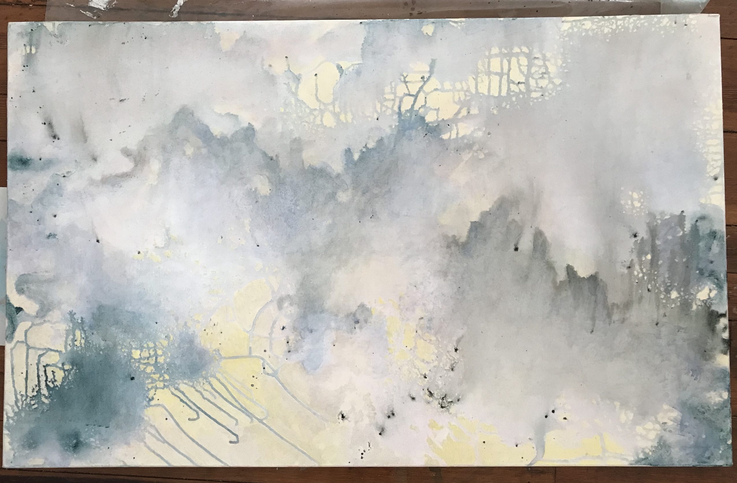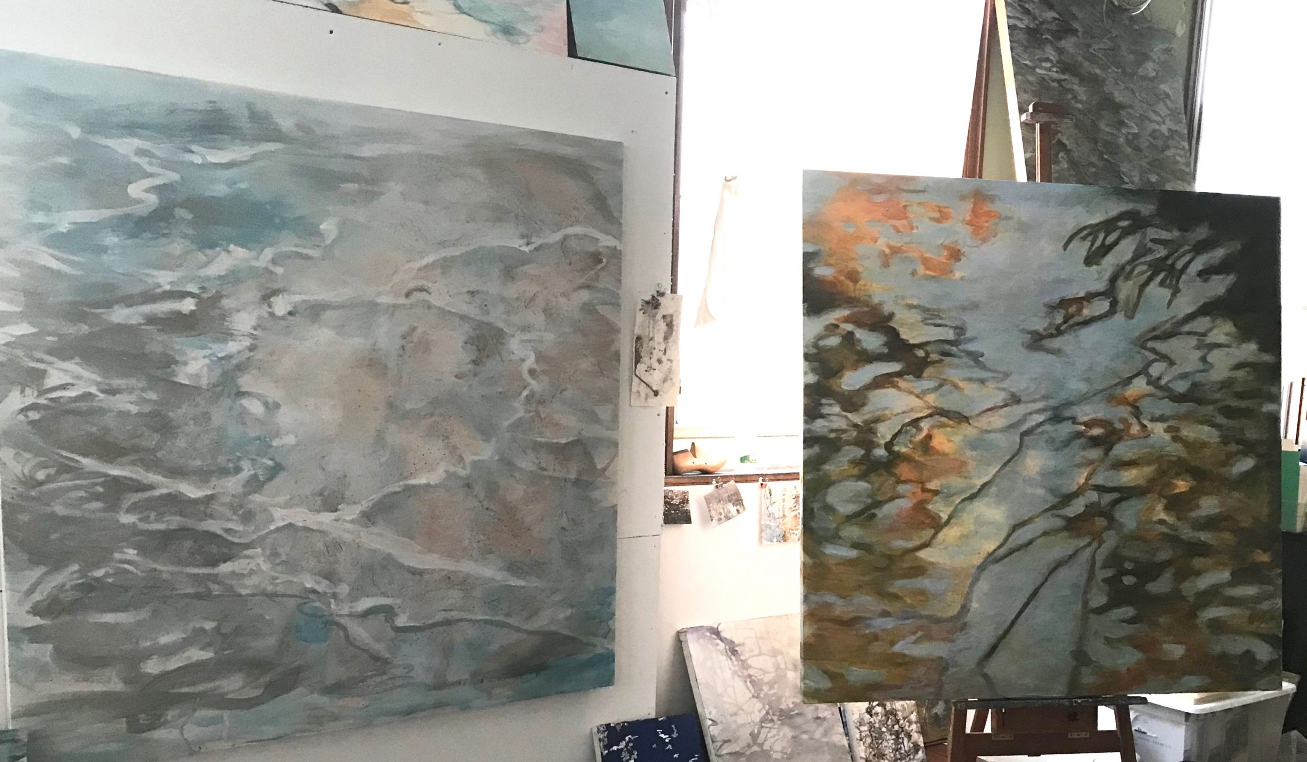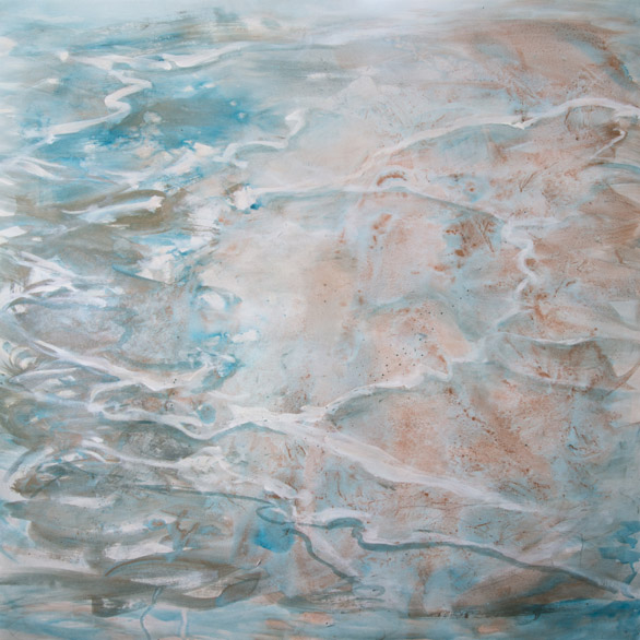Water and reflection, both physical and emotional, are at the core of these paintings. Witnessed reflections at the edge of the water, sky, and land; as well as moments of meditation, study and reflective thought, mingled in the making of these paintings. In several pieces, I wrestled with the image in my mind against what appeared on the canvas. When I was able to slow down and listen, a wiser part of myself suggested play and experimentation would lead the way to fresh work. Stepping out of “efforting” through a piece, and into the freedom of play, felt risky and uncertain, like walking blindfolded through familiar, yet shifting, terrain. Pouring, dripping, troweling, wiping, and layering paint all take part in my process. The playful experiments, begun as warm-up exercises for the “real work”, became the seeds for the Memory Map and Dreaming Series featured in this exhibit.