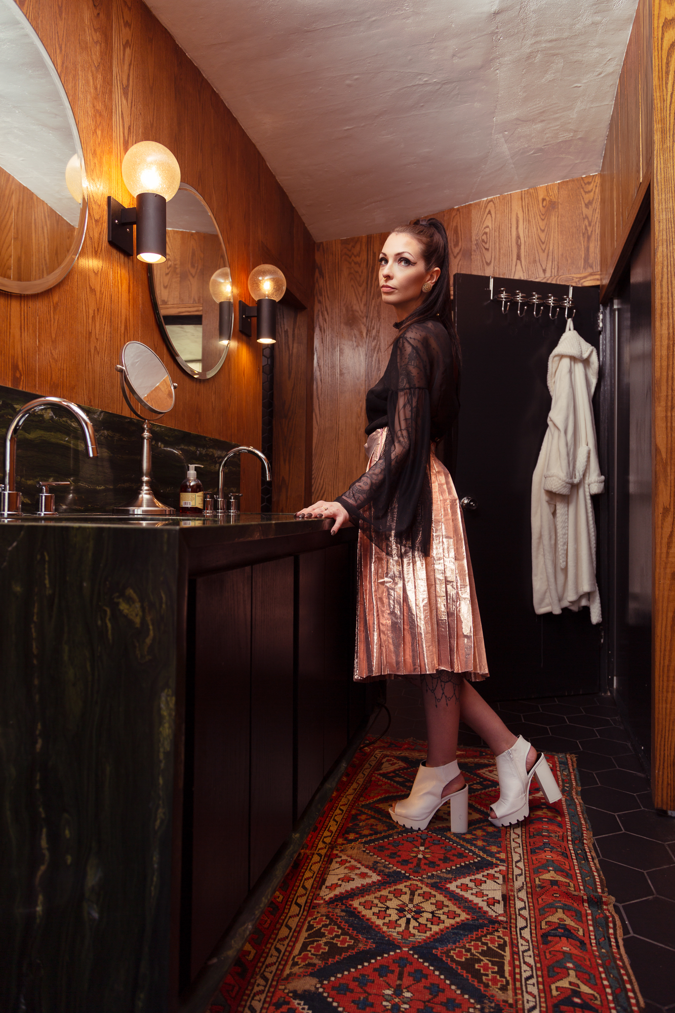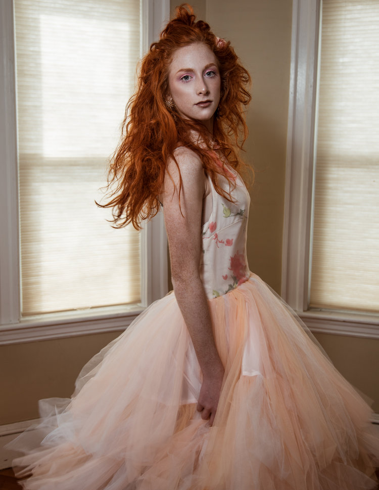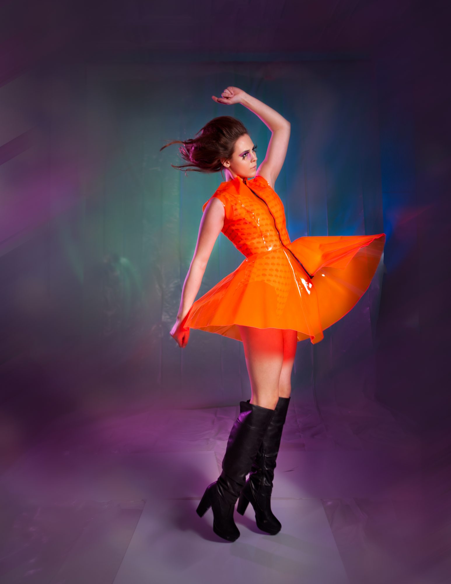 I’m currently working out of my home studio in Marshfield, MA, where I have a decent sized room for my machine, garment racks, and fabric shelves. I’ll admit, having my bed so close to my workspace makes calling it an early night and heading to bed all too tempting, but I always somehow manage to resist in favor of bringing my designs to life. So far I’ve created 3 full collections and 1 mini-colleciton since graduating, and am currently working on my 4th full collection. I’ve also had great opportunities to work with other talented artists in the Boston community, such as photographers, hair stylists, make-up artists, models, dancers, and even other designers. I’m very lucky to be able to collaborate and work with so many amazing people.