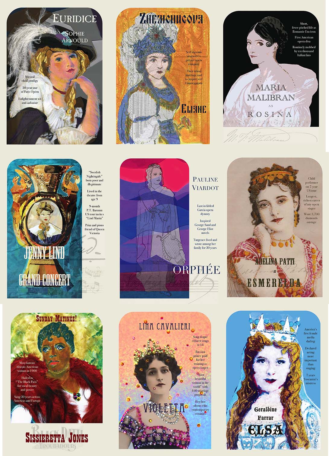 My interest in female opera singers began with fashion history: I loved the extraordinary visual images they left behind. For 200 years, great artists and photographers captured these dramatic and confident women wearing spectacular costumes in up-to-the-minute fashion silhouettes. I began collecting and sharing these powerful images with my fashion history students. And I created the first round of what would become an entire world of diva-inspired artworks.