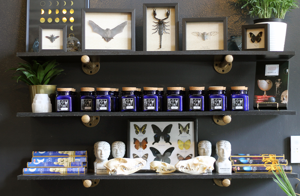 Over the years we have been able to attend lots of independent markets as the candle brand and we were able to meet and form connections with so many artists I admire and have purchased from myself so when I considered opening a store, I knew I didn’t want it to just be a candle shop — I wanted to feature all the awesome crafts and work from others! I have a unique ability to buy for the store while working with talented people when we vend events like Oddities Flea Market (curated by Regina and Ryan Matthew Cohn), Death Salon and Dark Arts Faires. My personal connection with a lot of the products we carry sets us apart from most other stores out there because I want to introduce customers to these exciting artists! I can direct you to their social media, websites or even tell you what market they are vending in person at next!