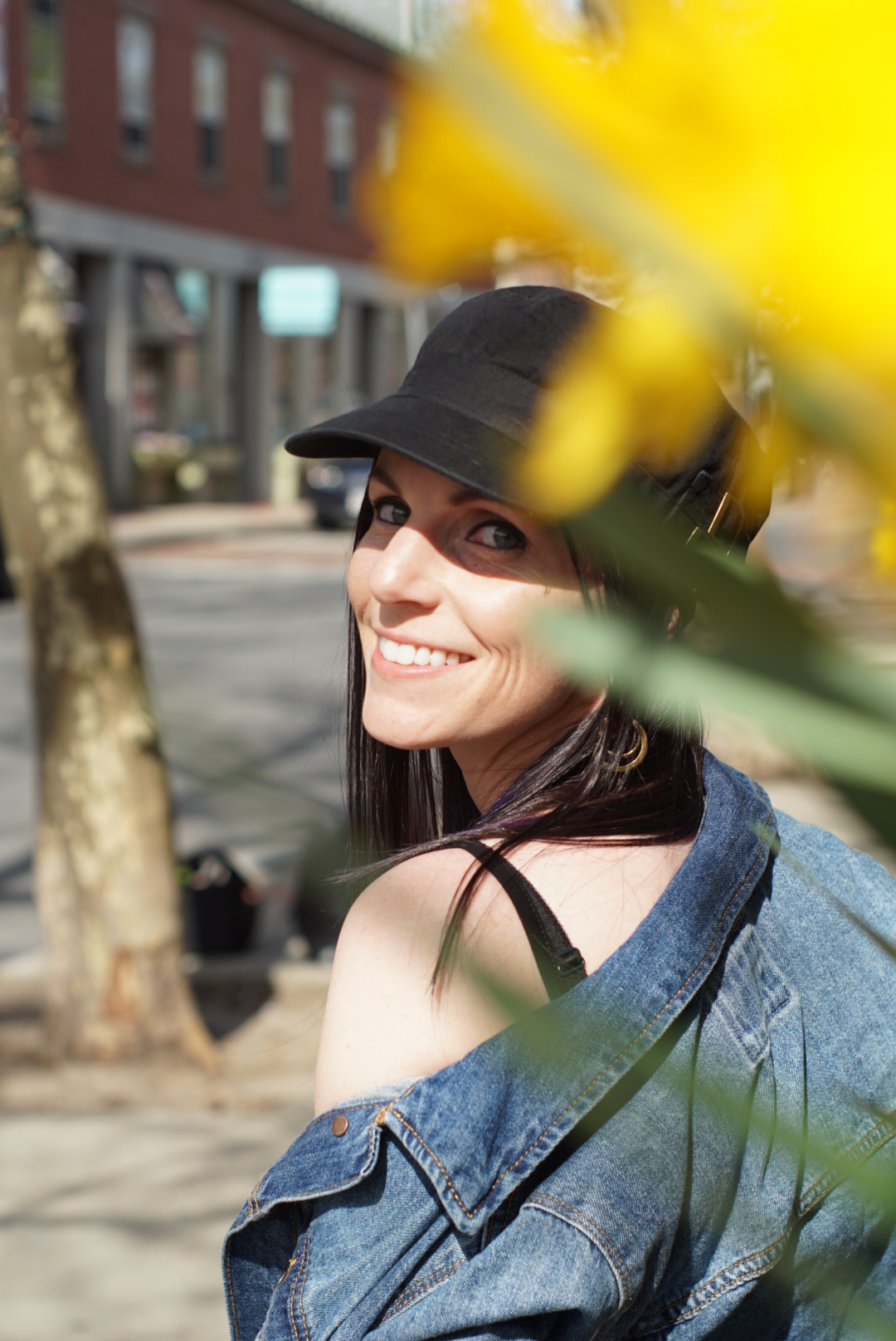 The image with the woman seated wearing the cap behind the yellow flower – the model’s name is Amanda Knight.