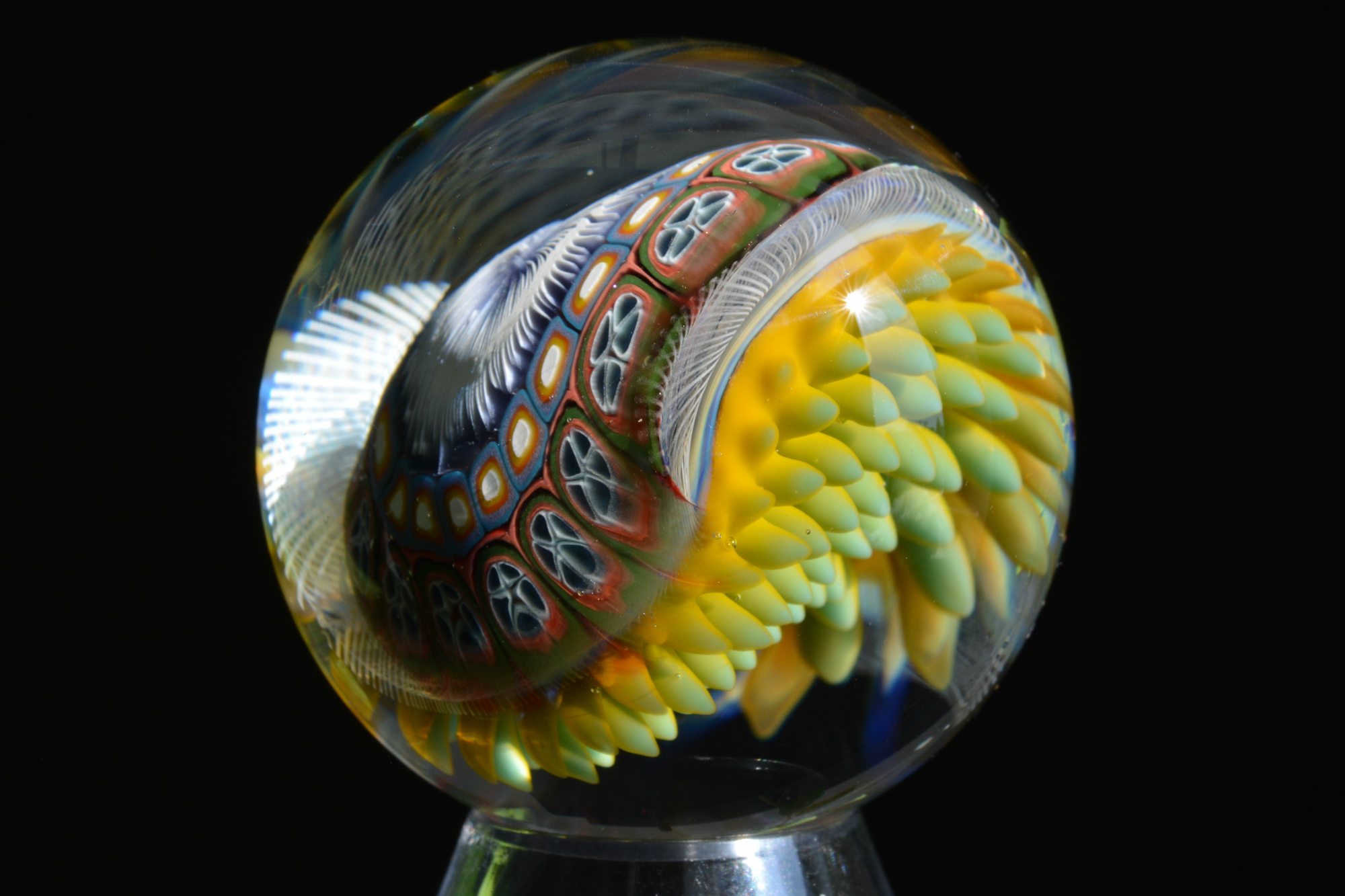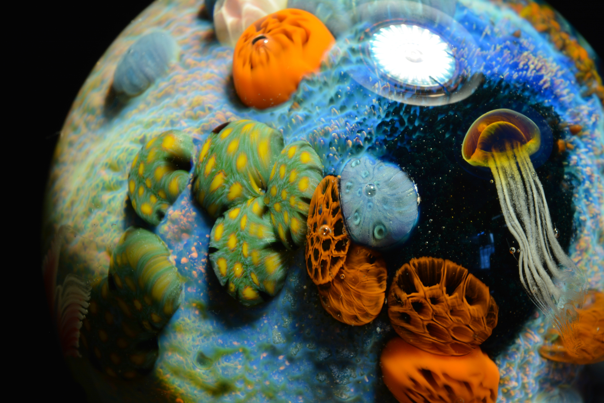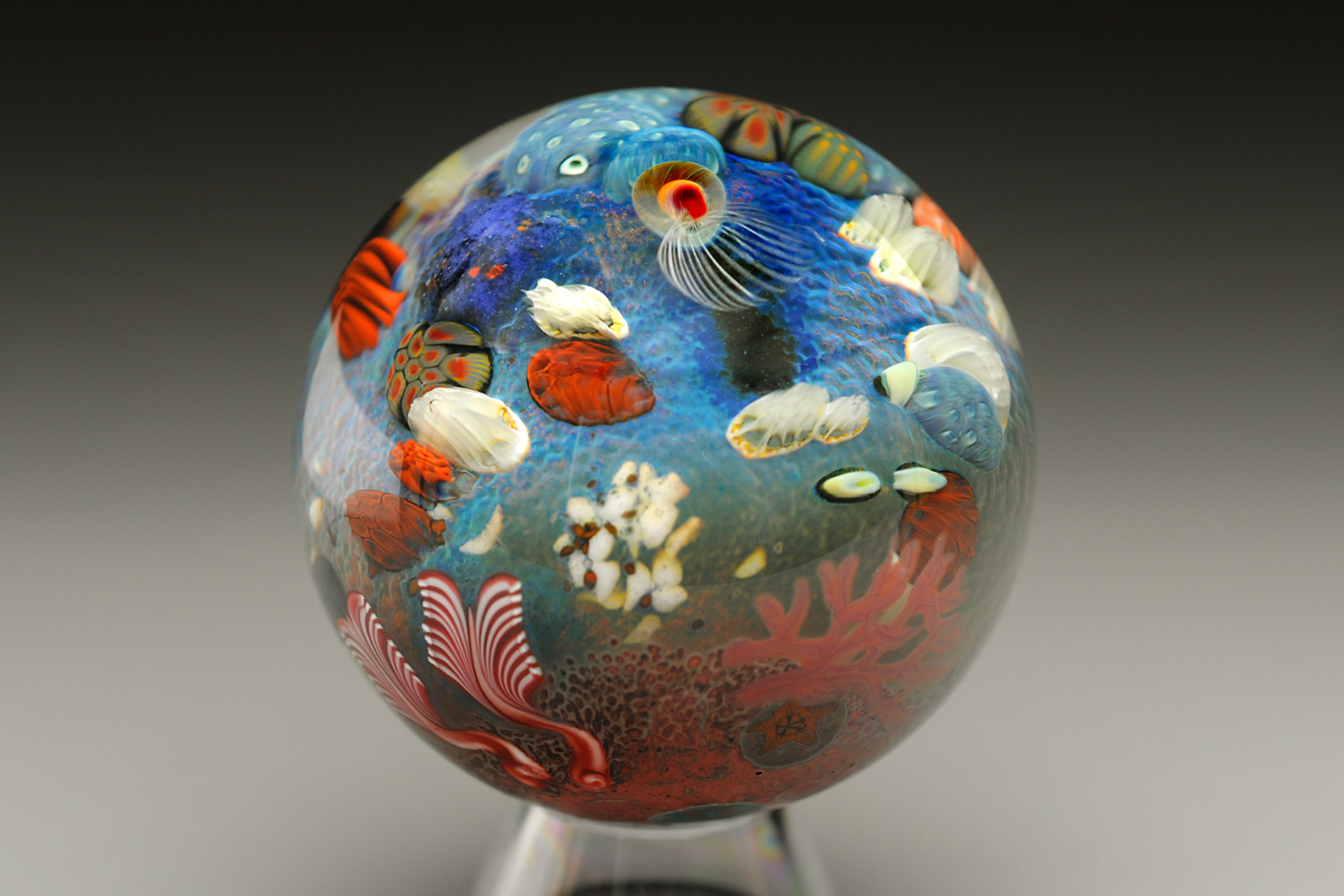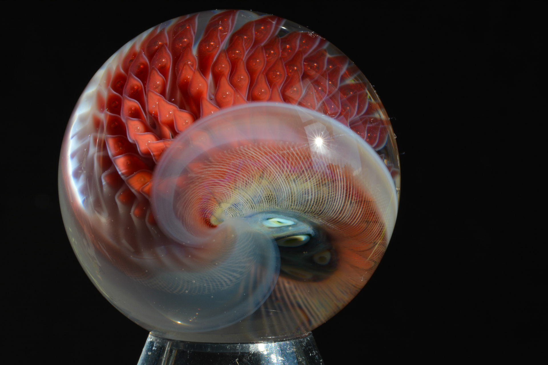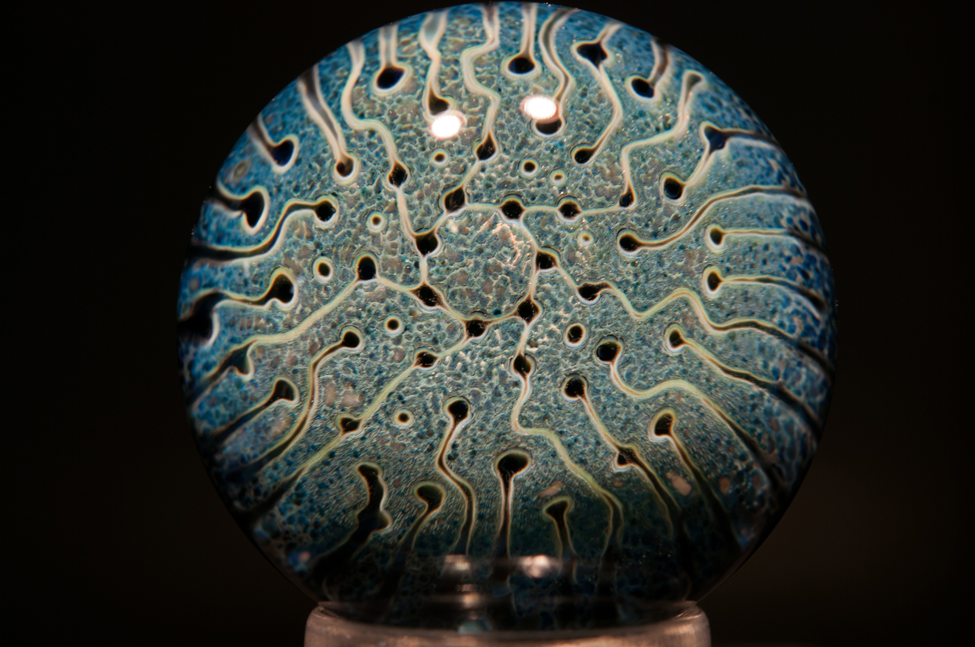 I make flame worked glass spheres. I call them marbles because, I guess, orbs are too pretentious? My inspiration is around patterns in nature. Where geometry can be found in natural objects and organic life can be found in geometry. There is a point where the two meet and that fascinates me. coral walks that line, many shells and ocean-based life do, also lichen and aerial photography of certain environments. The Micro and Macro show it better than the mid view… I hope people take away a moment of fascination akin to the one I feel when I’m on my knees looking at lichen through a magnifier or snorkeling on a coral reef. That moment of discovery and surprise is very invigorating