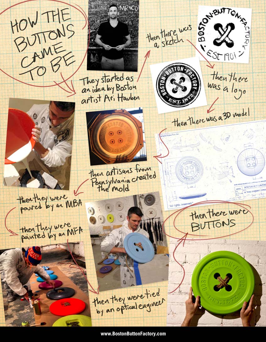 After some research about the building we realized we were operating out of the boiler room of what used to be the Boston Button Company (dissolved 1872) To pay homage to the history of the neighborhood and the fact that we make stuff, we decided to name the space the Boston Button Factory. Ari decided for authenticities sake we should make large-scale sculptural wall fashion buttons, the success of leading to a small-batch artisanal line of textile buttons, t-shirts, jewelry, limited edition prints and a growing creative product line.