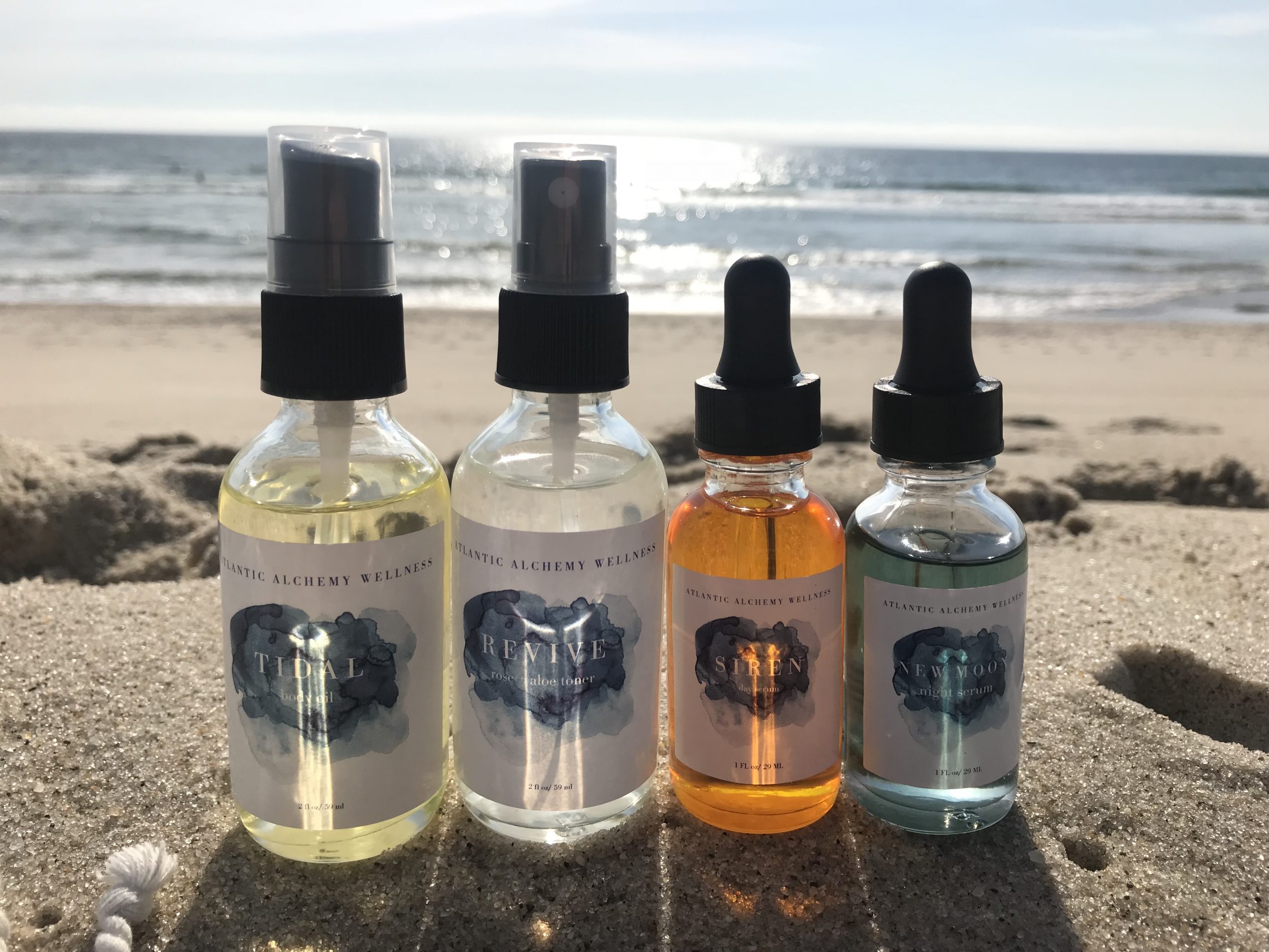 I had been making and experimenting with my own serums and toners for a while. When I moved back to the Lower Cape (where I was born and raised), I noticed that there weren’t many local skincare companies in the area and thats where the wheels started turning. Since I like to use as many local ingredients as possible, I set out to try and incorporate as many as I could. Combining local coffee roasters, sea salt farmers, and local botanicals into my products to create a skincare line unique to the area. Something about that felt good. Of course, as to be expected, there were many learning curves and bumps in the road along the way. finding out (the hard way) the real shelf life of some organic ingredients and trying to create a consistent product was tricky at first but became something that I learned to work with. I enjoy the production process, the blending, labeling, and research that goes into making a product great. As the company evolved, my emphasis on “ocean-inspired” really began to shape AAw into what it is today. Now, being in six stores on the cape and islands, I feel more confident in speaking about the benefits of each ingredient that is carefully selected for each product.