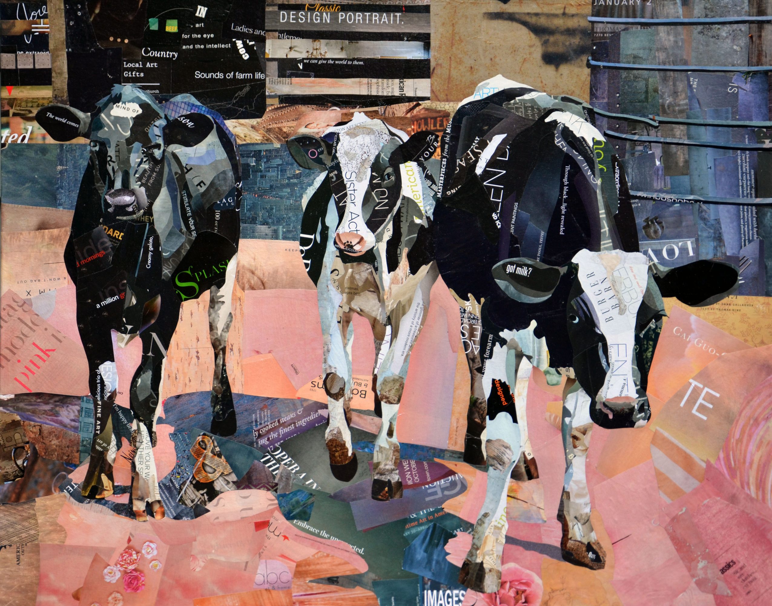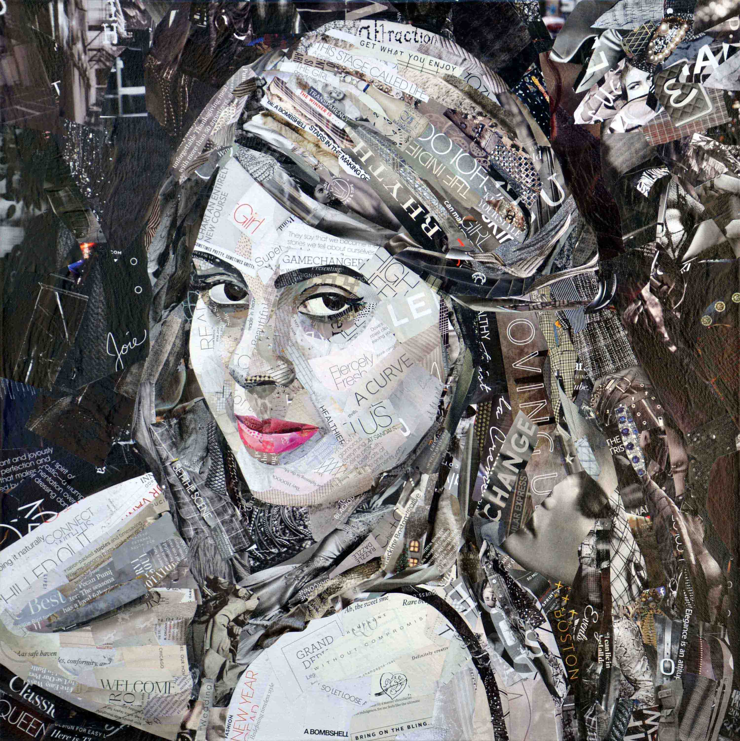 I think, was the impetus that moved me from three-dimensional architectural or sculptural works made out of paper, to two-dimensional representational art made from recycled magazines – the medium that I have been using to create my artworks for the last several years. The images are made entirely from magazine content – there is no paint or ink involved and they tend to be large works, often three feet or larger in size, in order to capture a lot of detail. Working with recycled material allows me to continually confront the words and images that contemporary society makes – and throws away – every day. Being conscious of environmental problems, I am glad to put recycled materials to use and I love it that friends and neighbors give me their used magazines that they would otherwise throw away, so that I can turn trash into art! Instead of paint tubes, my palette is a cabinet loaded with thousands of magazines.