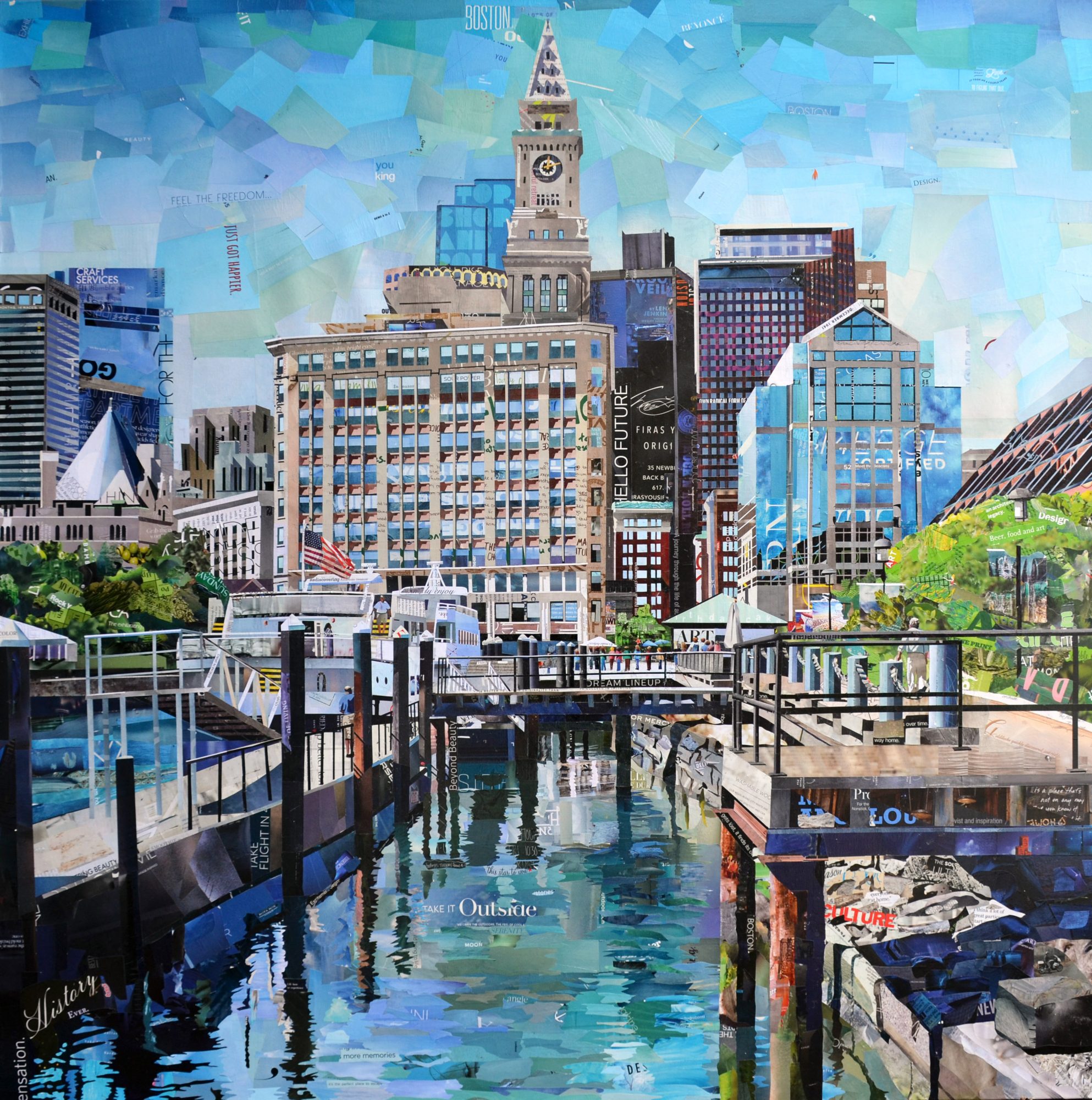Working with recycled content creates unique artistic opportunities and challenges. First and foremost, I aim to depict my subjects in a realistic way. Because all of my lines and colors come from found materials, I face a constant struggle to identify colors (that is, magazine pages) having the correct hue, saturation and value. Sometimes, I need to search through dozens of magazines, just to find a piece of a magazine that fits, just in terms of its color. Beyond choosing the right color, I try to incorporate “stories” into each artwork — that is, images or words (already existing on the magazine pages I use) that reflect the overall context that I am representing. Working in New England creates so many opportunities for including local cultural and historical references. These competing dimensions create multiple layers of meaning in each of my artworks. Putting all of these elements together also involves cutting and gluing the various words, images, and colors from the recycled magazines. To bring out realistic detail, I often use an Exacto knife to cut out tiny slivers of paper that I glue in place with tweezers. Each artwork is a real labor of love that takes several weeks to create. Although there is a lot of effort involved, completing each work is all the more satisfying, when all the fragments of paper, and all the different stories that I want to tell, come together in a unified whole.