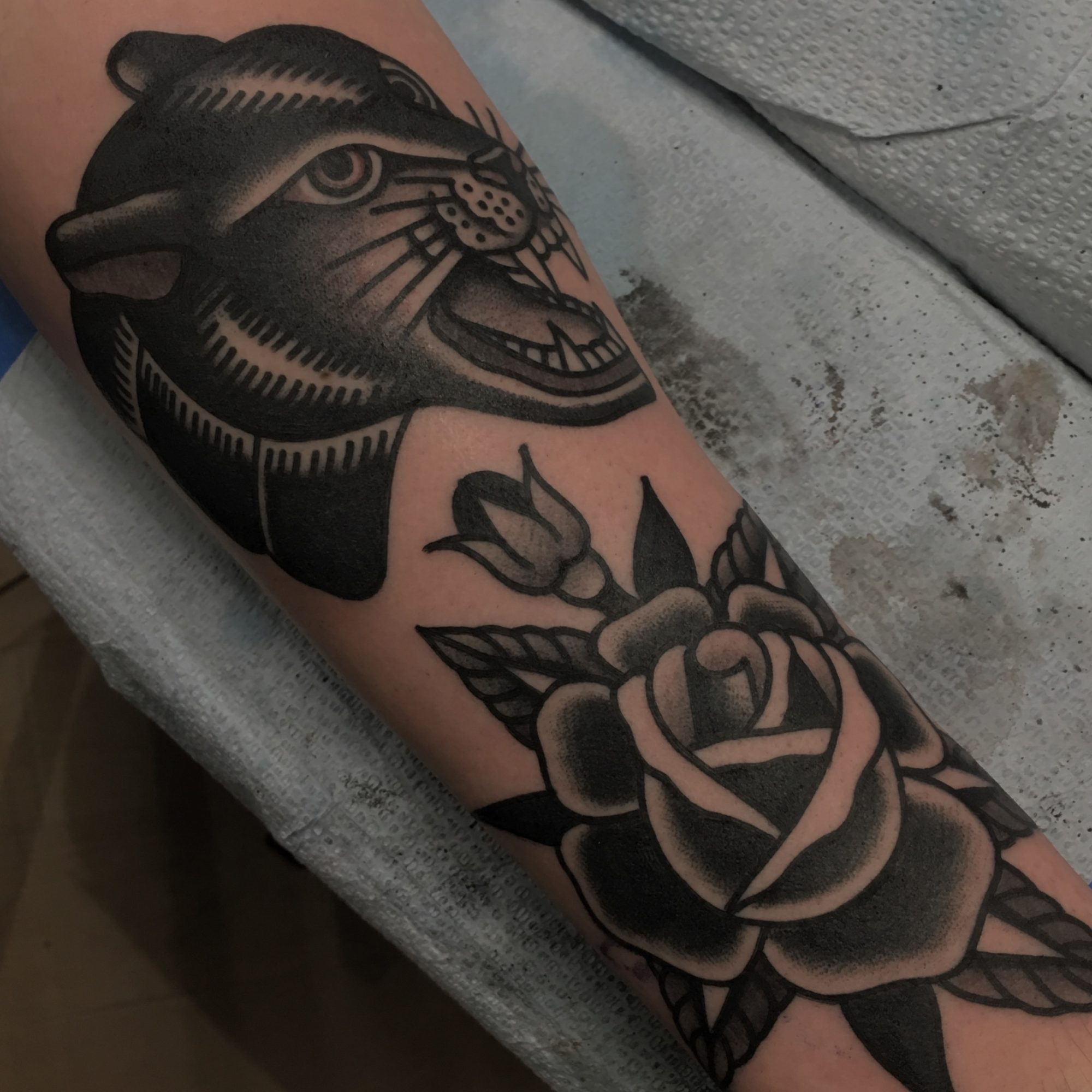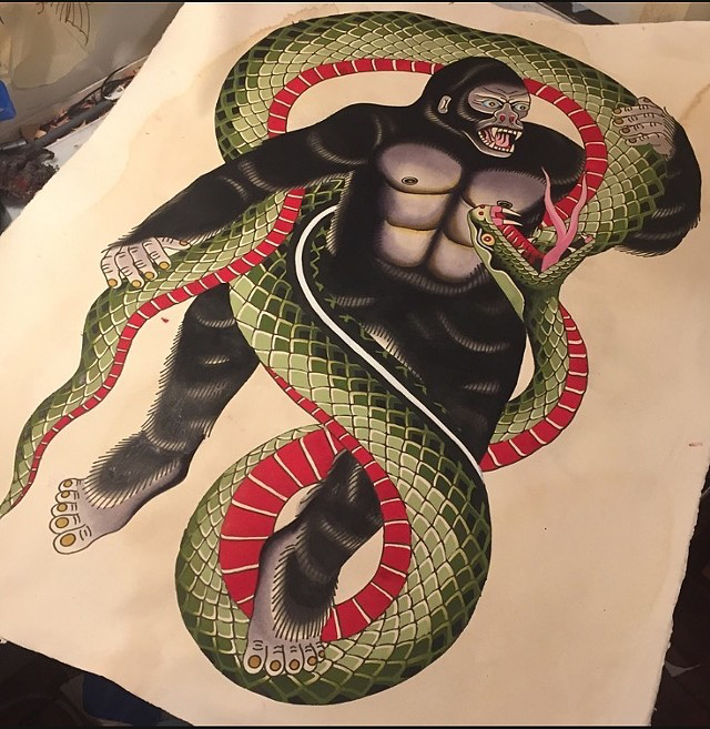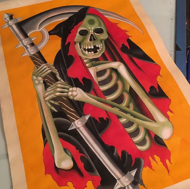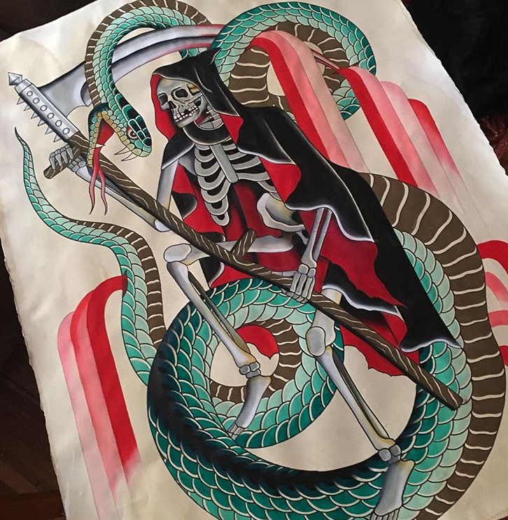 All my art is influenced by classic “Americana” tattoo-imagery. I try my best to make tattoos and paintings that are powerful and stand the test of time. There isn’t necessarily a message behind my work, however I hope to inspire someone to get the design tattooed or to motivate a fellow artist. As I’ve gained experience as a tattooer, I rarely look at another tattooers work for inspiration while I draw or paint. I strive to stay raw in the process and go straight to the source of referencing stuff. Its that process that most tattooers would have followed many moons ago when there was no internet, just books, postcards, and the mind .