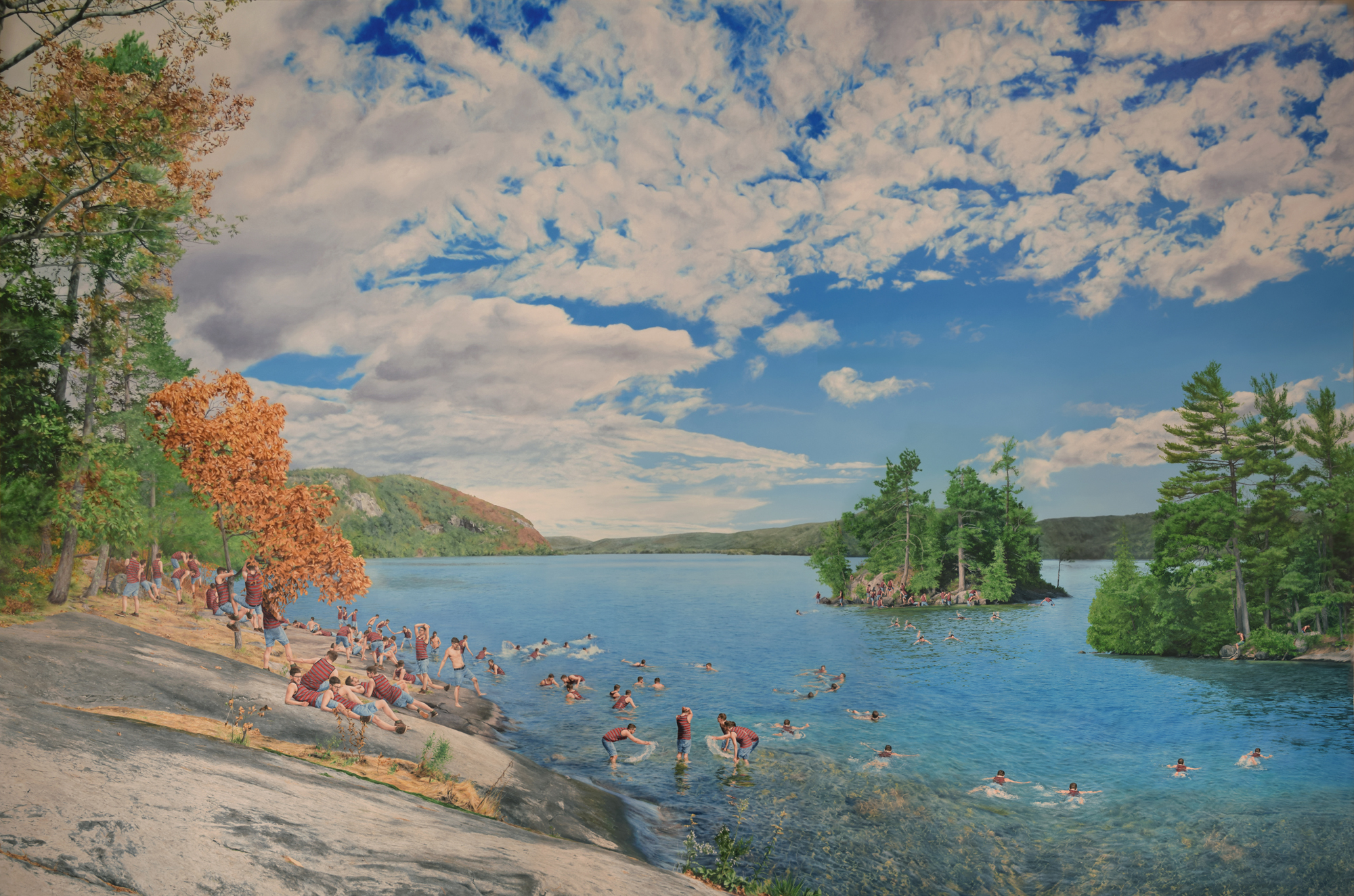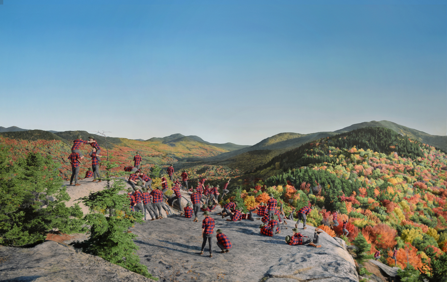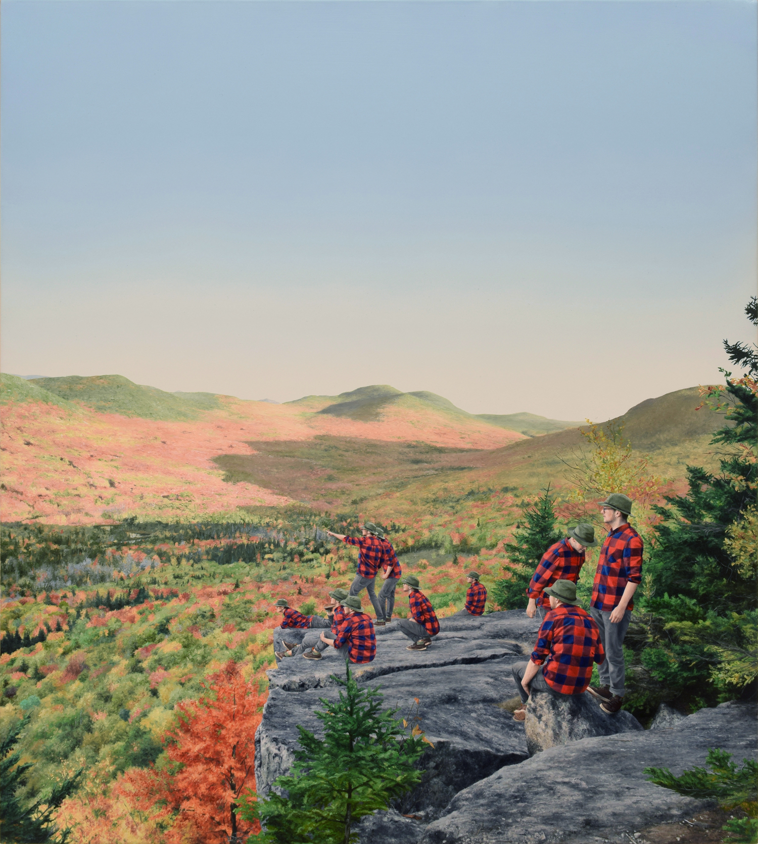 The series I am currently working on is a group of paintings in which hundreds of tiny selves are multiplied throughout the grand American landscape. The locations that I have inhabited are spaces that were previously depicted by the Hudson River School. I am navigating the parallels between the Hudson River school and the religious ideology from my childhood. Ideas around virginity, purity and the honor of sacrificing one’s selfhood for the glory of God are spread throughout both. Their work embodies the overpowering force of God made manifest thru nature. The religious voices of my past use nature against the validation of my existence. By overwhelming theses spaces with my presence, I am shifting the weight within these spaces and creating a community of me playing, exploring my selves, exploring nature and being part of it.