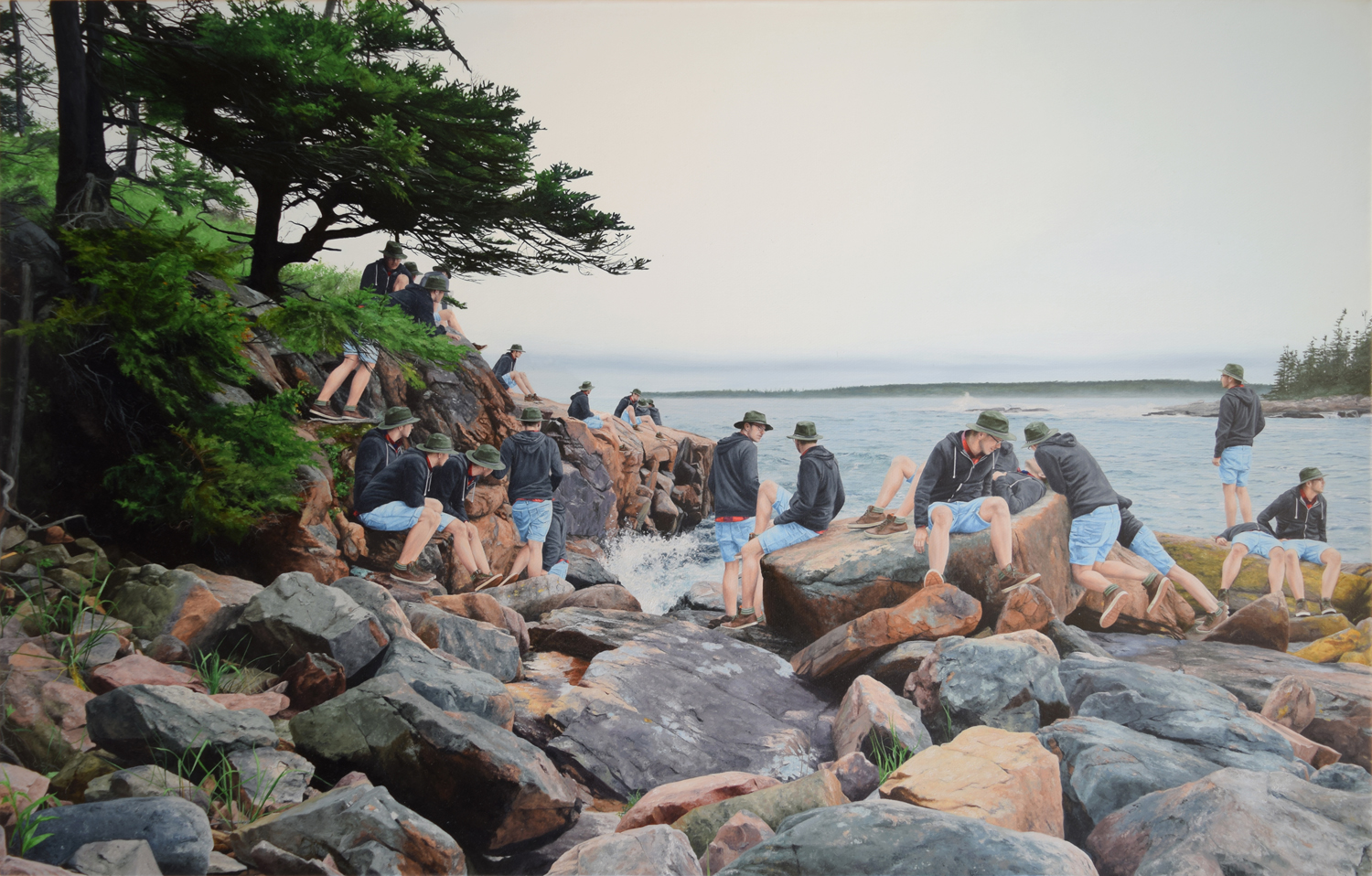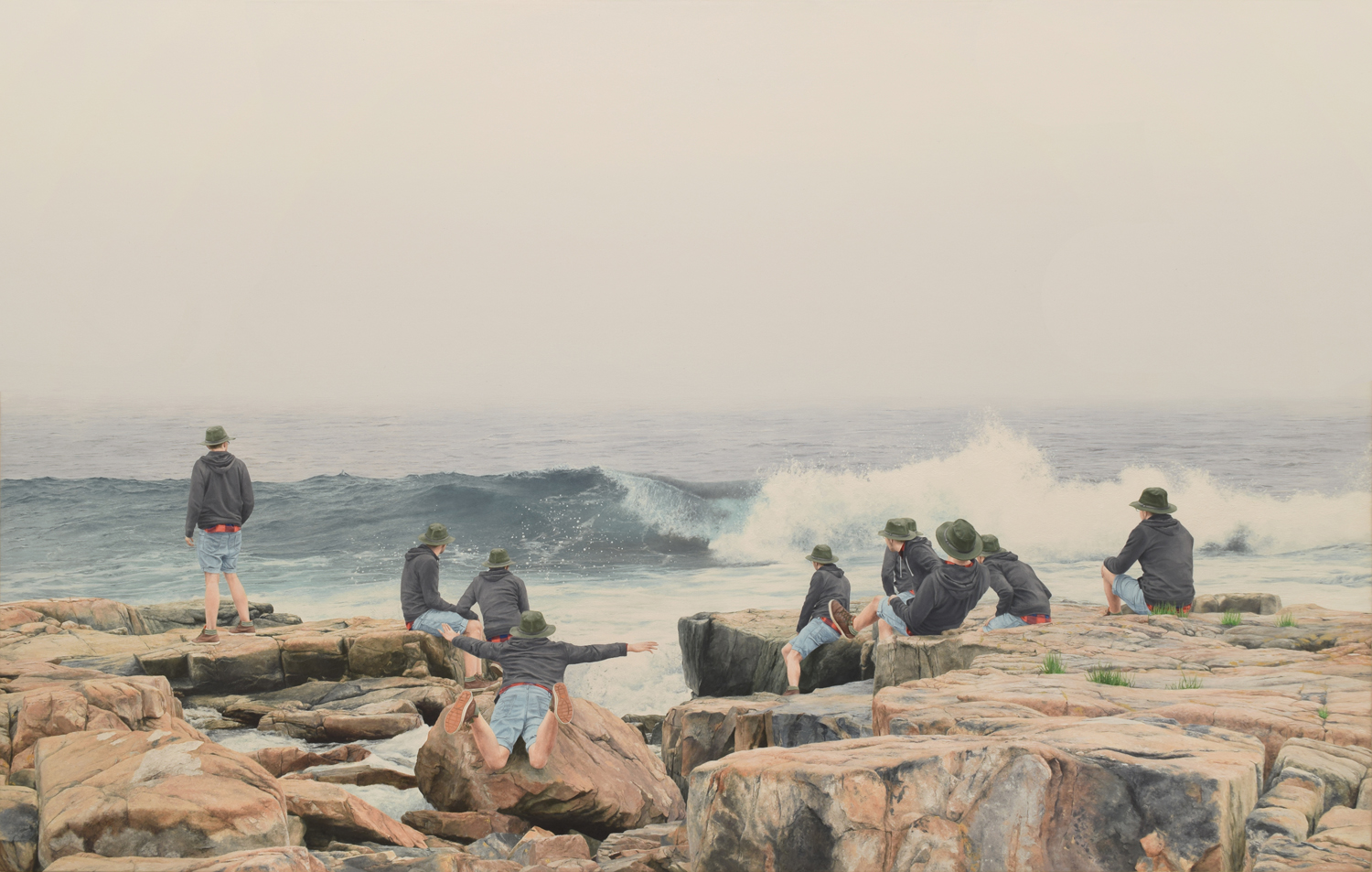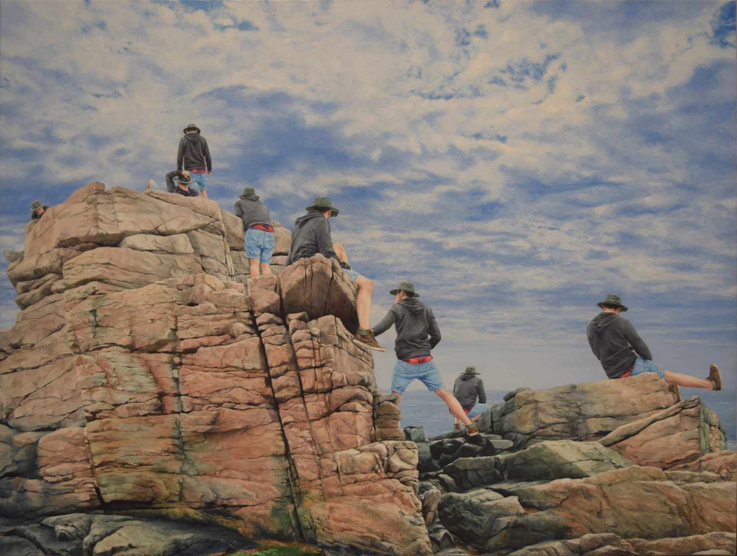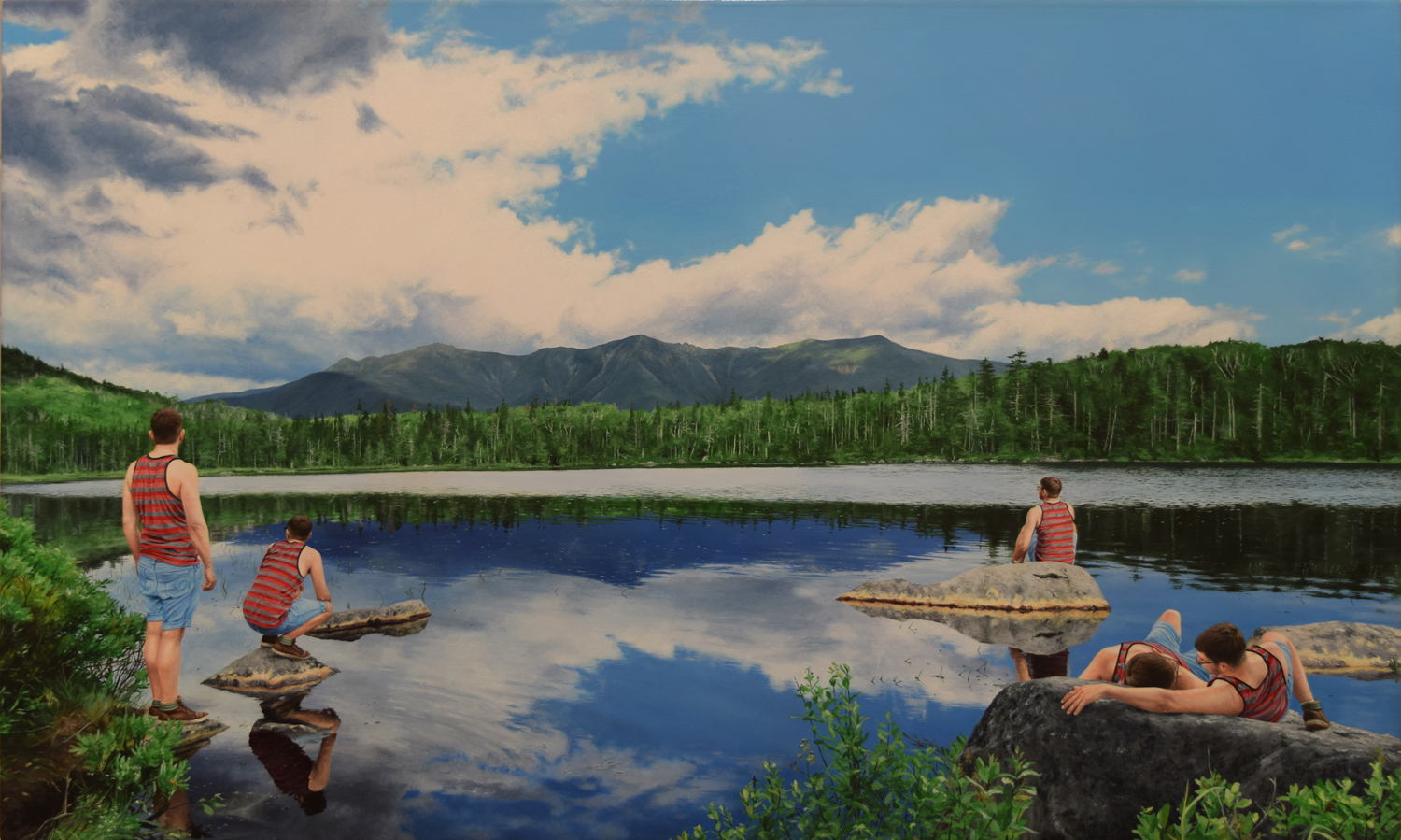 The series I am currently working on is a group of paintings in which hundreds of tiny selves are multiplied throughout the grand American landscape. The locations that I have inhabited are spaces that were previously depicted by the Hudson River School. I am navigating the parallels between the Hudson River school and the religious ideology from my childhood. Ideas around virginity, purity and the honor of sacrificing one’s selfhood for the glory of God are spread throughout both. Their work embodies the overpowering force of God made manifest thru nature. The religious voices of my past use nature against the validation of my existence. By overwhelming theses spaces with my presence, I am shifting the weight within these spaces and creating a community of me playing, exploring my selves, exploring nature and being part of it.