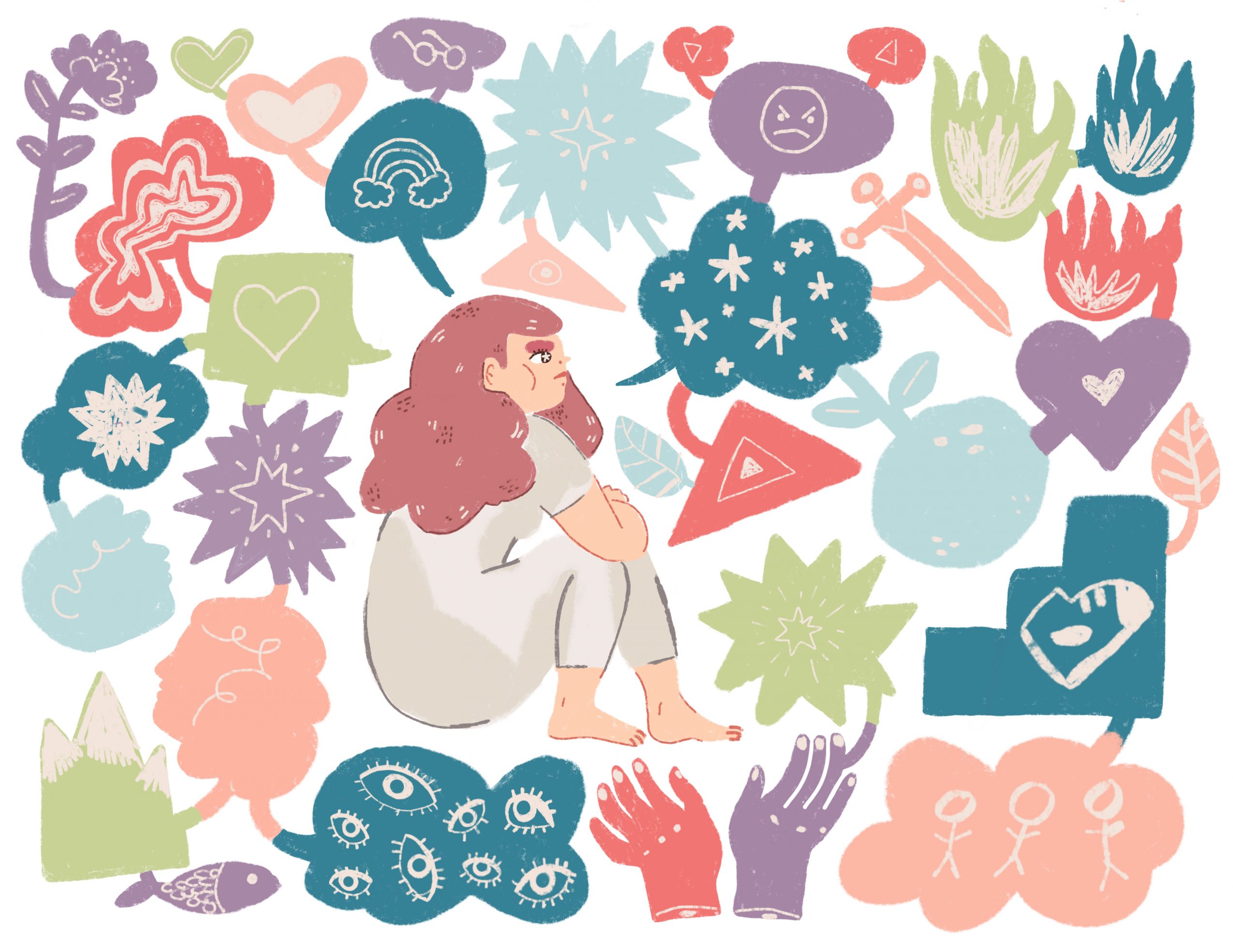 As of late, my illustration draws inspiration from my personal life exploring the moods I’m in, experiences with my mental health, and the subjects I’m crushing on like ancient alchemy manuscripts or the folklore for Krampus. Bright colors, playful marks, a balance of meticulous details or simple shapes and lines (literally all depending on what my brain can mentally process for the day) all make it into my work. Instead of making work directly about my mom, I channel her personality, which is very similar to my own, and process the grief in that way. My mom had a playful soul, an infectious openness, a soothing warmth, a goofy sense of humor, and an awfully fierce work ethic. Its grief inspired work without poking at the grief directly. I’m too close to the loss of my mom to open a dialogue about her in my work right now. Perhaps eventually. Instead, she shows up in the little stylistic choices I make when illustrating; in playful lines and warm color palettes.