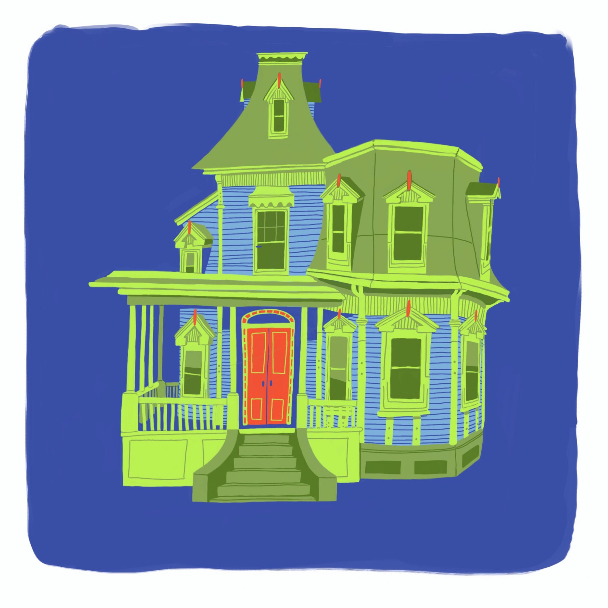 The illustration work I do has really expanded, especially lately. I started by doing a map illustration for an author’s book right out of college. I’ve gone on to have work in my school’s admissions catalogue, as well as gotten to create interior design illustrations for an up and coming big restaurant. I love trying new things, but what might be obvious from my work is that I love color! I would love to work more with color, fashion, and pattern- these are things that define me and my own work. But looking further, you might see my love for architecture too- I love old New England houses with quirky gables and odd porches and weird doors that lead to nowhere. I’ve actually just started a series of houses in bright colors all based on buildings I see around town when I travel around New England. I hope to do more with fun architecture and interior design in the future! Finding ways to share this art is what I’m working on now. I’ve made buttons, prints, stickers… I really want to expand that to fabric and clothing, maybe cards as well!