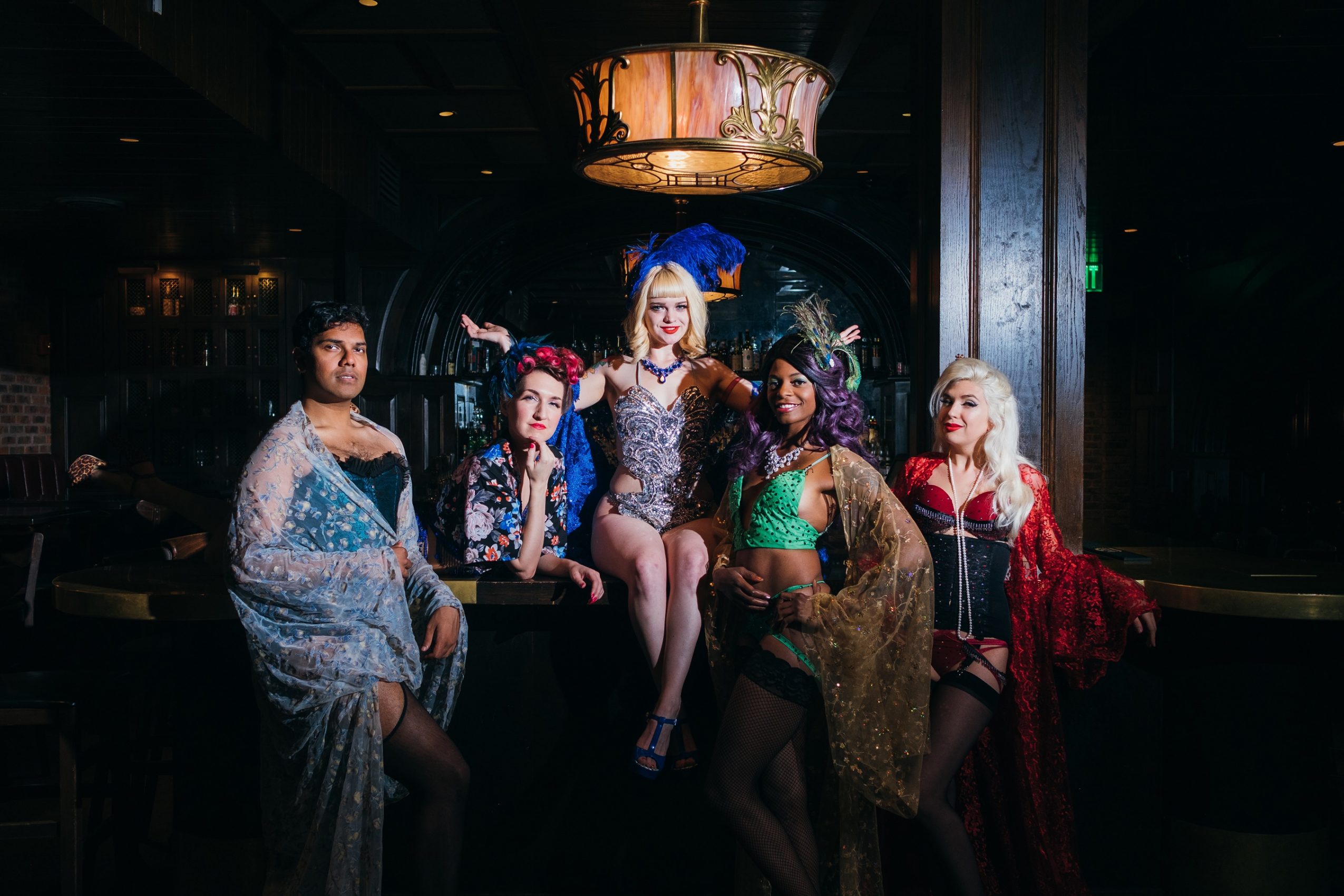 Oh, Karina Photography (Elsa and Harley Foxx, photo on bar, blue dress against white background, Top Shelf Burlesque cast photo)