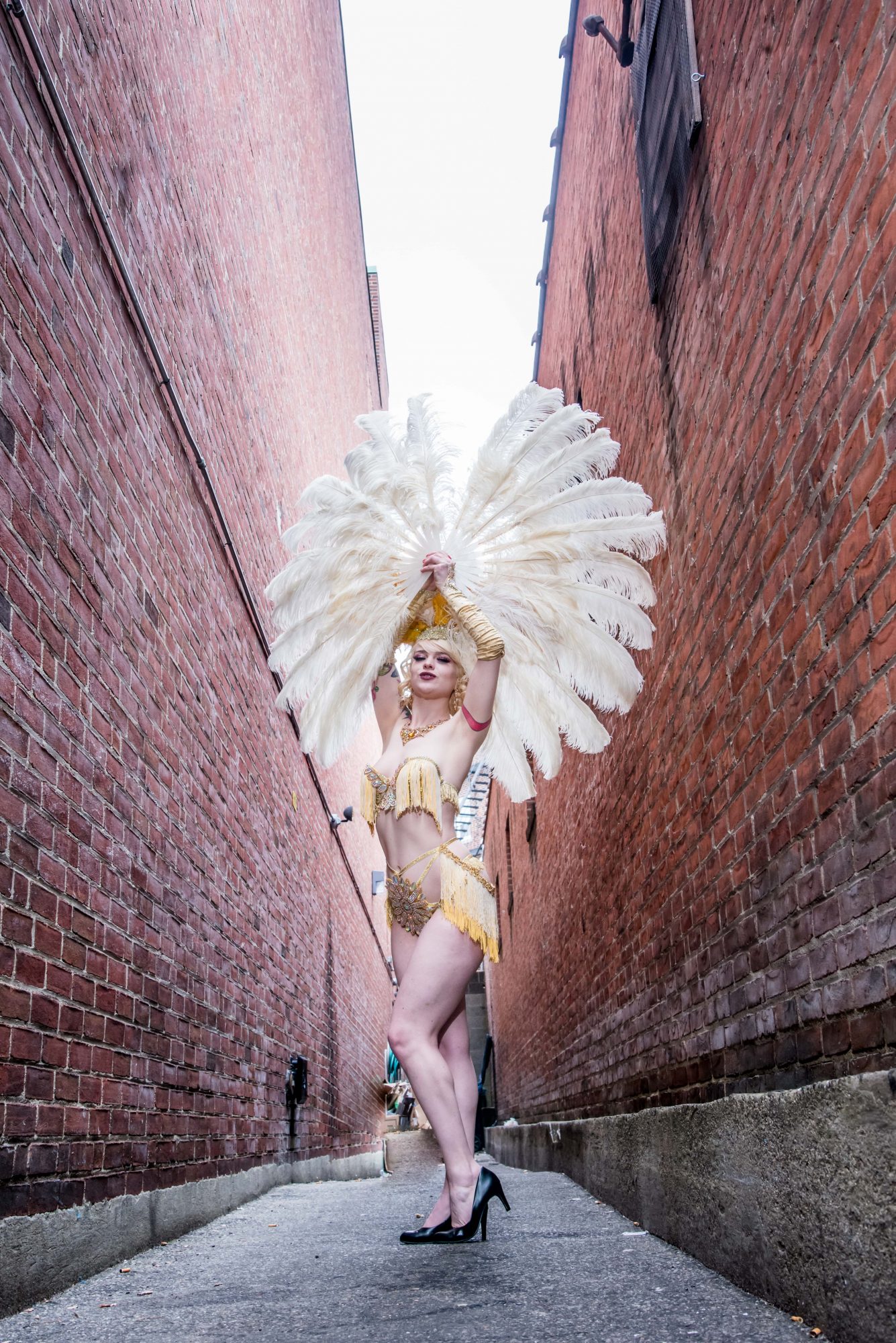 Going to shows led to taking classes, which led to “kittening” shows (picking up the bras), which led to performing, which made me want to change the landscape for performers. Boston’s burlesque scene is dynamic and inclusive as hell, but it leans “neo” – nerdy burlesque, horrorlesque, lots of themed shows and tributes to fandoms. I was more drawn to “classic” burlesque, meaning the vintage showgirl aesthetic, very femme and glamorous, ostrich feather headdresses and rhinestoned fishnets. Classic burlesque is arguably the most problematic sub-genre; it’s been around the longest, hasn’t taken as many steps to expand its notions of beauty and femininity, and still riddled with skewed power dynamics and gatekeepers who only stick around to profit from performers’ bodies and art. It was here that I saw the need for more women-run shows, and responsible producers who look at burlesque with a modern feminist eye. I wanted to do my fancy stripping without a man misrepresenting my art moments before I step onstage, or taking a disproportionate cut of profits. So I carved out a new space for myself and fellow performers who were suffering that same disempowerment. I’ve been producing shows in the Boston area for a year and a half now.