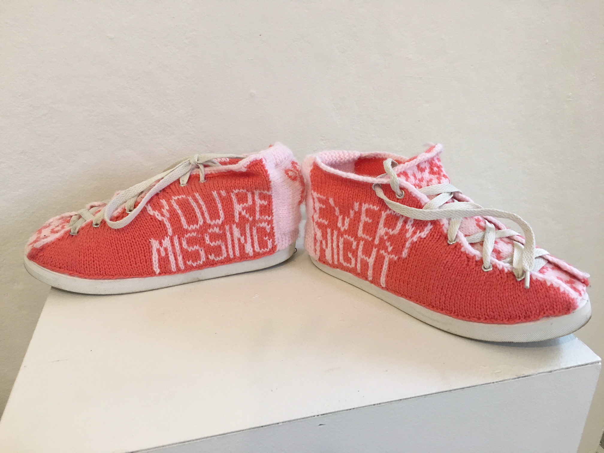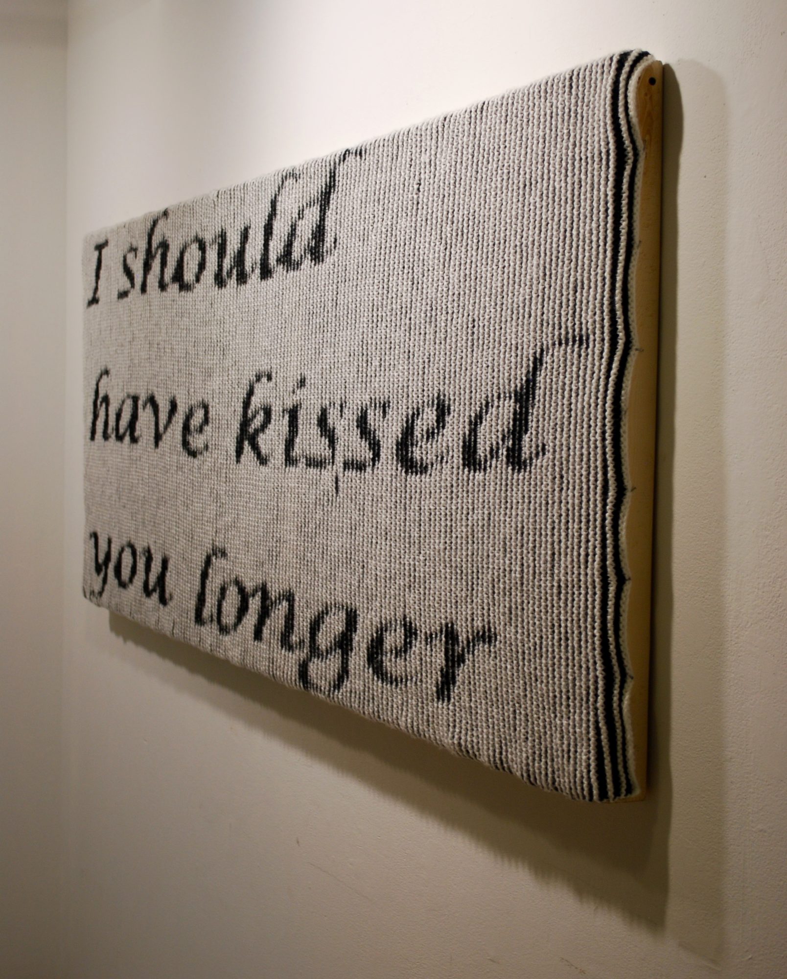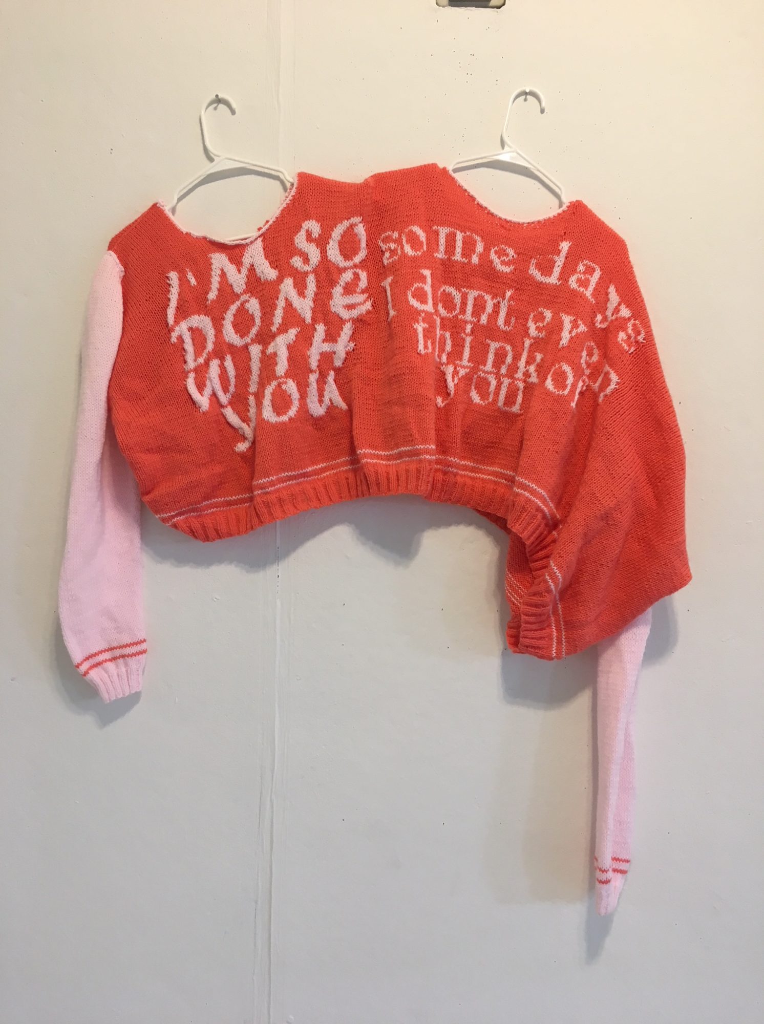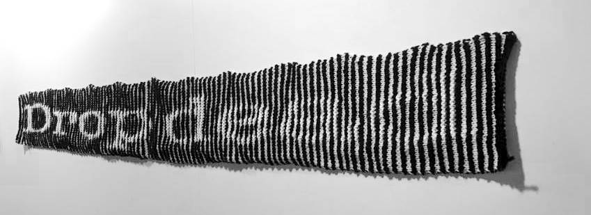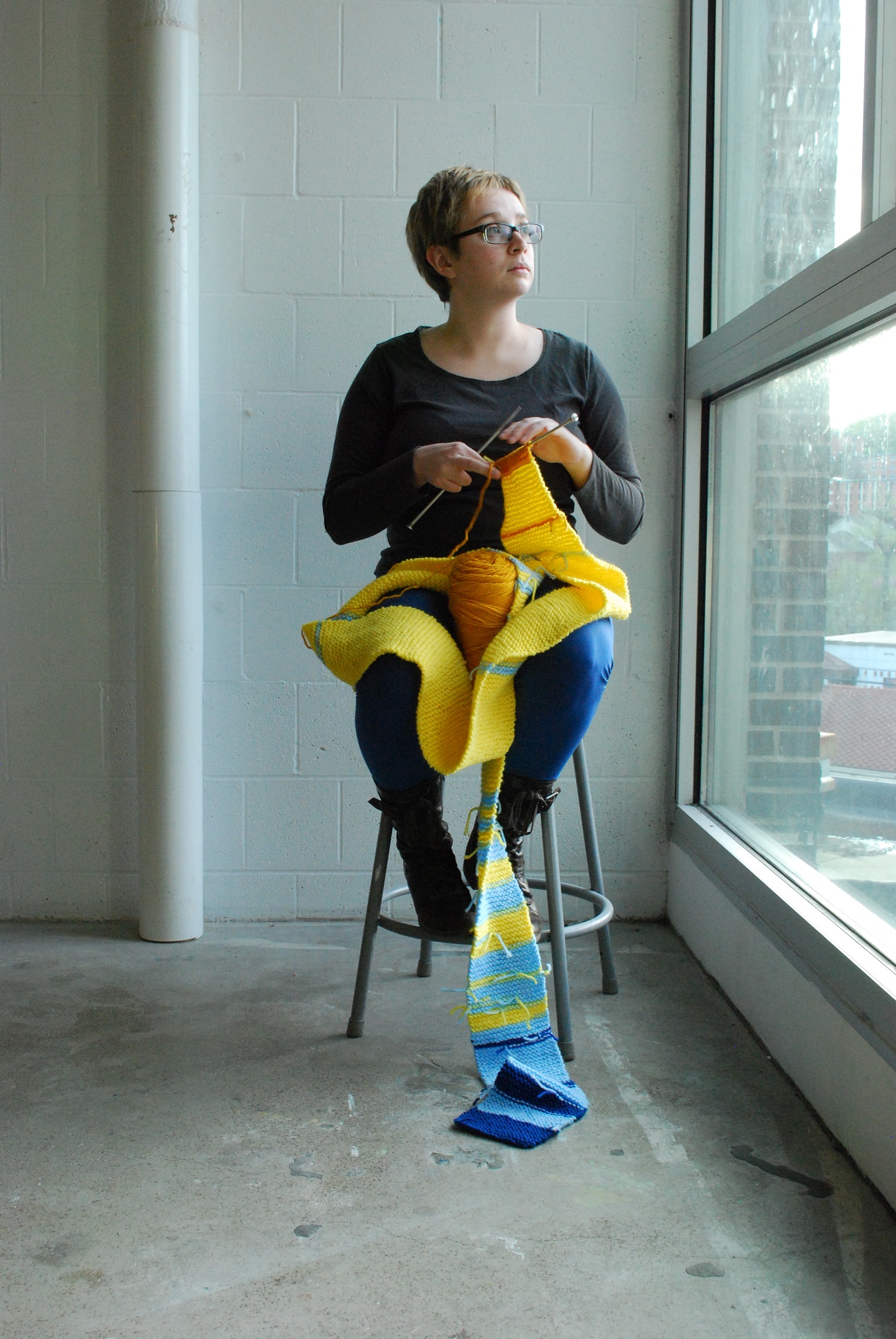 I have always been an innovative and crafty person. I most recently graduated from Alfred University’s School of Art and Design with my BFA. I concentrate primarily in fiber art and printmaking. Most often, I make fiber sculpture which includes traditional things like garments with some sort of twist, or I make sure to subvert my material in some way. I’m very well known for my illusion knits, a knitting technique that allows the viewer to see text or imagery in the knit piece from certain angles only.