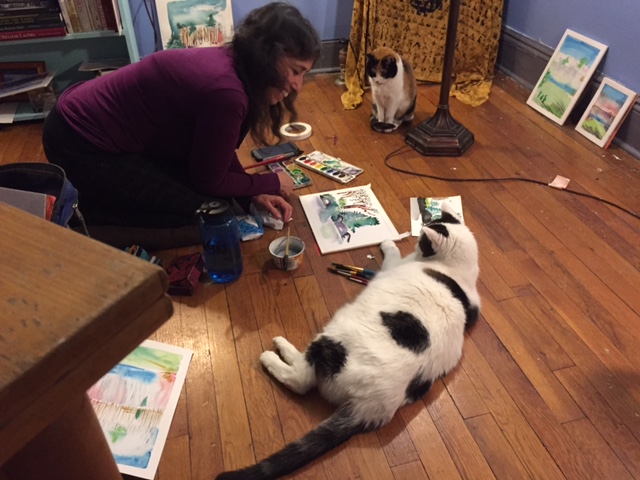 The photo of me was taken by Chris Hyde. My cats love to watch me paint. Spotty is the big one and Butterscotch is the little one. The photo was taken in my “Art Haven”. (Otherwise known as an art studio)