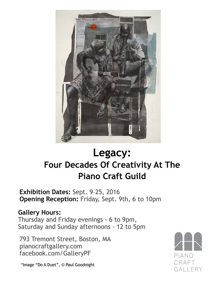 The Piano Craft Gallery is the longest running non-profit art gallery in Boston. Building residents, along with the building’s owner created the gallery as a way to exhibit their work for the larger Boston community in the 1970’s, and as the building has been renovated over the years, the physical plant of the Piano Craft Gallery was moved out of the building’s lobby an into the pristine new location on the ground floor of the Piano Craft Guild.